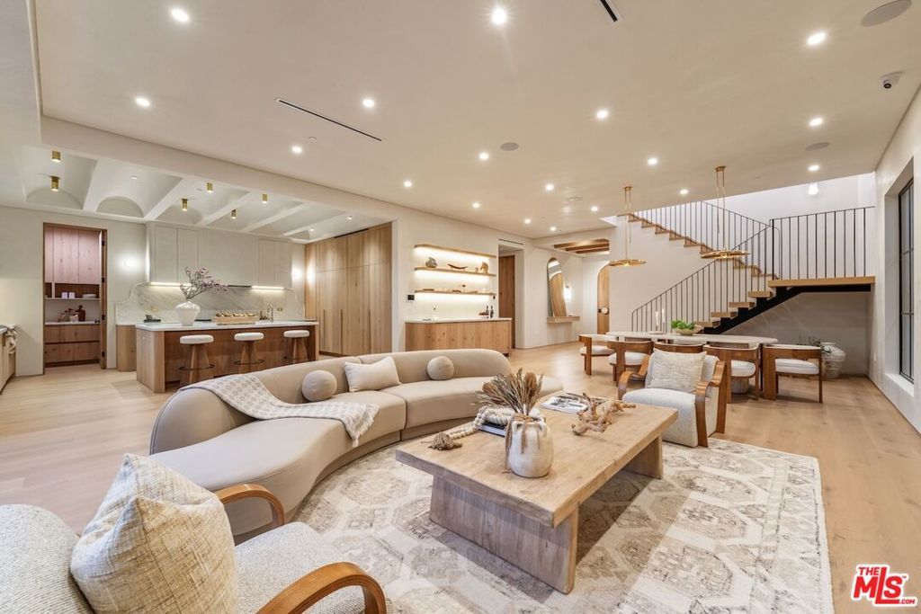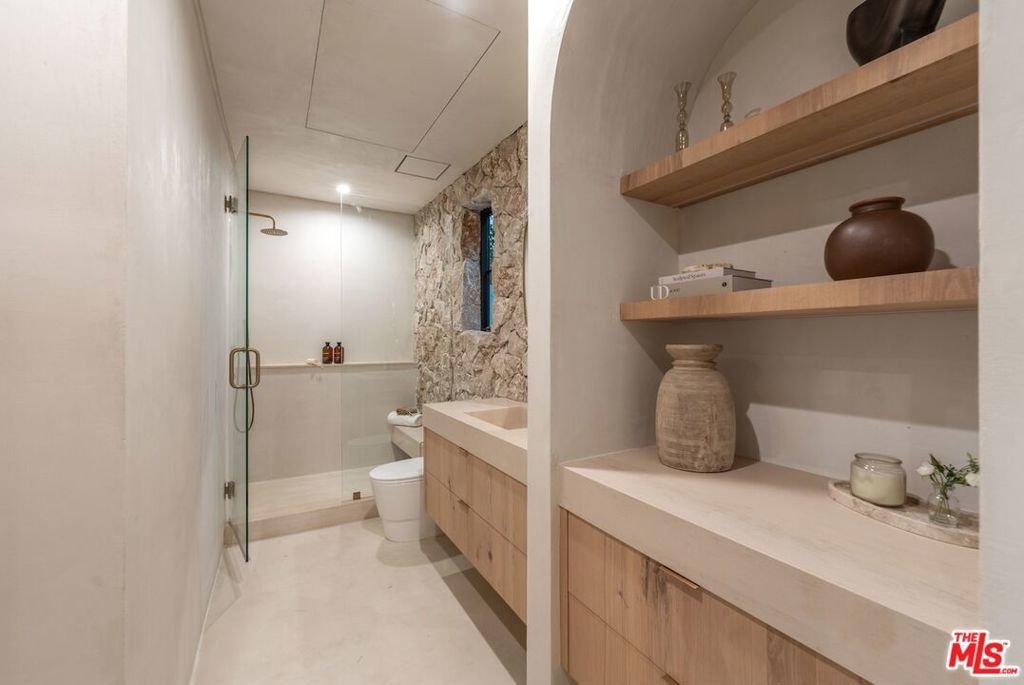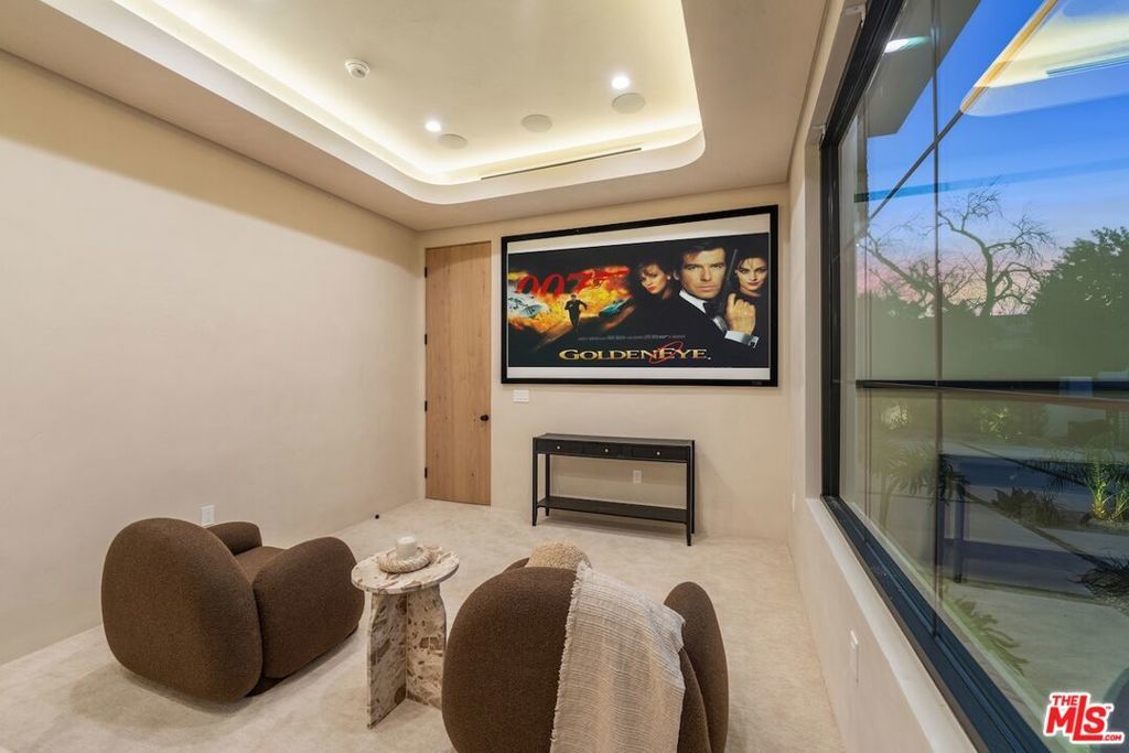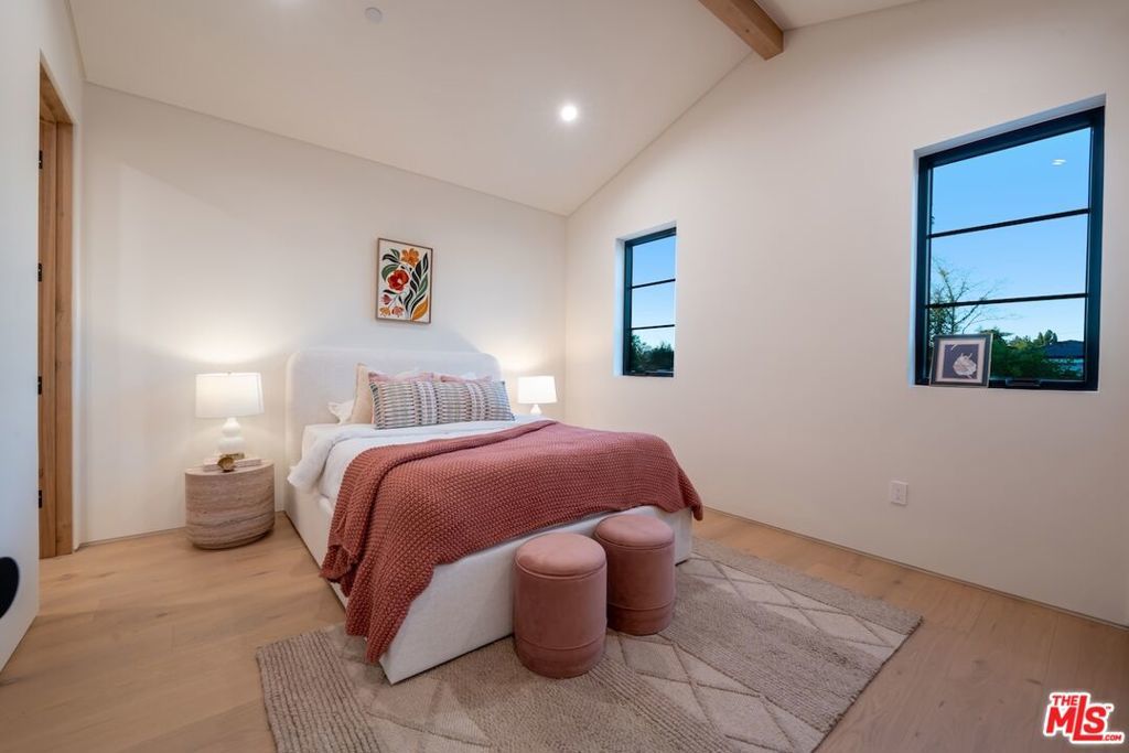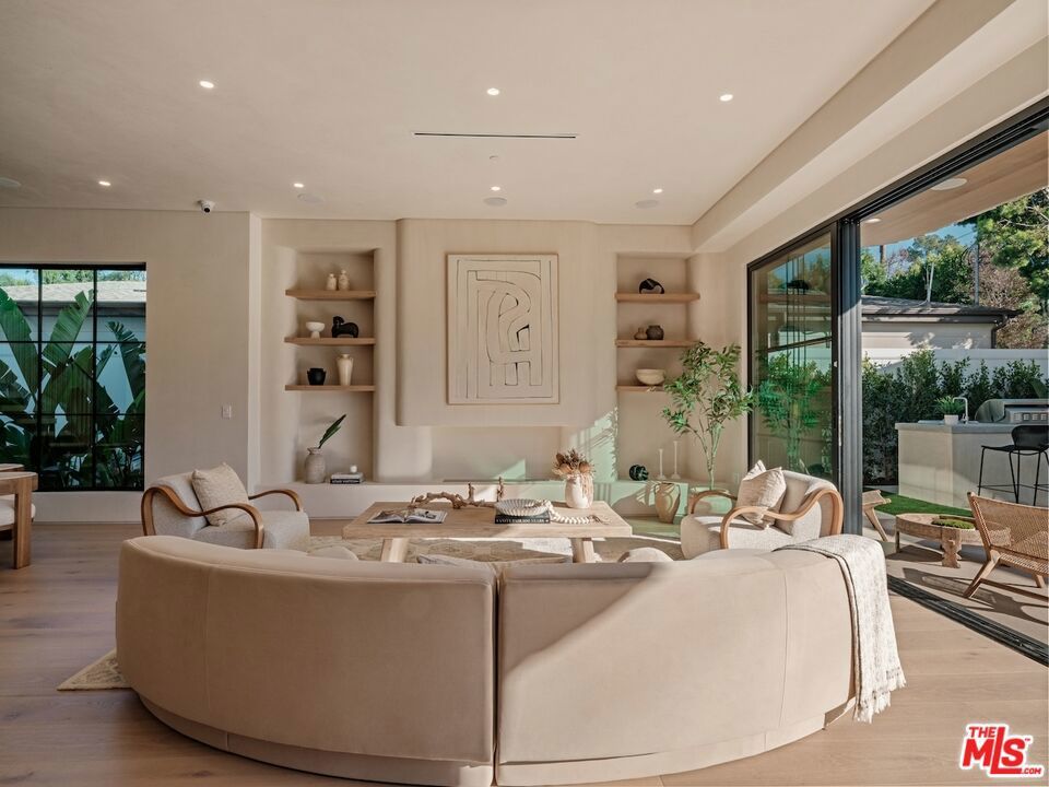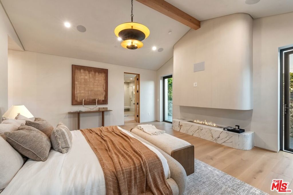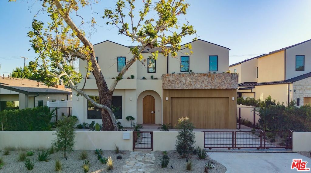 Introducing this breathtaking, one-of-a-kind home that blends sculptural architecture with warm organic materials for a serene, modern living experience. This custom-built home is situated within the highly esteemed Colfax Charter School District. Boasting 5BD/5.5BA, the property also includes a spacious casita offering open living space with an additional bedroom and bathroom. Upon entering the home, you're welcomed by hand plastered walls, curved aesthetics, and continuous wide-plank oak flooring that guides you through sun-filled spaces. The chef's kitchen is an organic showcase, centered around a gently rounded island, sculpted curved ceiling, rustic oak cabinetry, marble countertops, high-end appliances, and a walk-in pantry. The expansive family room features a sculpted fireplace wrapped in hand-finished brushed plaster and rustic curved shelving that enhances the warmth and texture of the space. Large sliding doors create a seamless transition between indoors and outdoors, revealing a resort-like sanctuary with a shimmering pool, spa, covered patio with a seating area and fireplace, and an outdoor cooking area, surrounded by lush greenery for ultimate privacy. The lower level features a cozy movie theater, an ensuite guest bedroom, and a powder room. Upstairs, the primary suite becomes a retreat of its own, boasting a softly rounded fireplace, a generous walk-in closet, and a large balcony with views of the tranquil, tropically landscaped yard. The spa-inspired primary bathroom offers a soaking tub, walk-in shower, and dual vanities finished in micro-cement and natural stone. Three additional ensuite bedrooms and a large laundry room complete the upper level. Enhanced with premium features including Control4 smart technology, whole-home surround sound, a security system with cameras, and energy-efficient solar panels, this home is both luxurious and thoughtfully connected. Located in the highly coveted community of Valley Village.