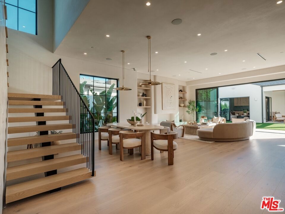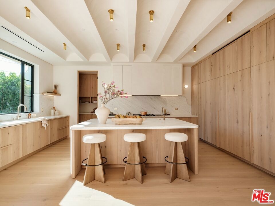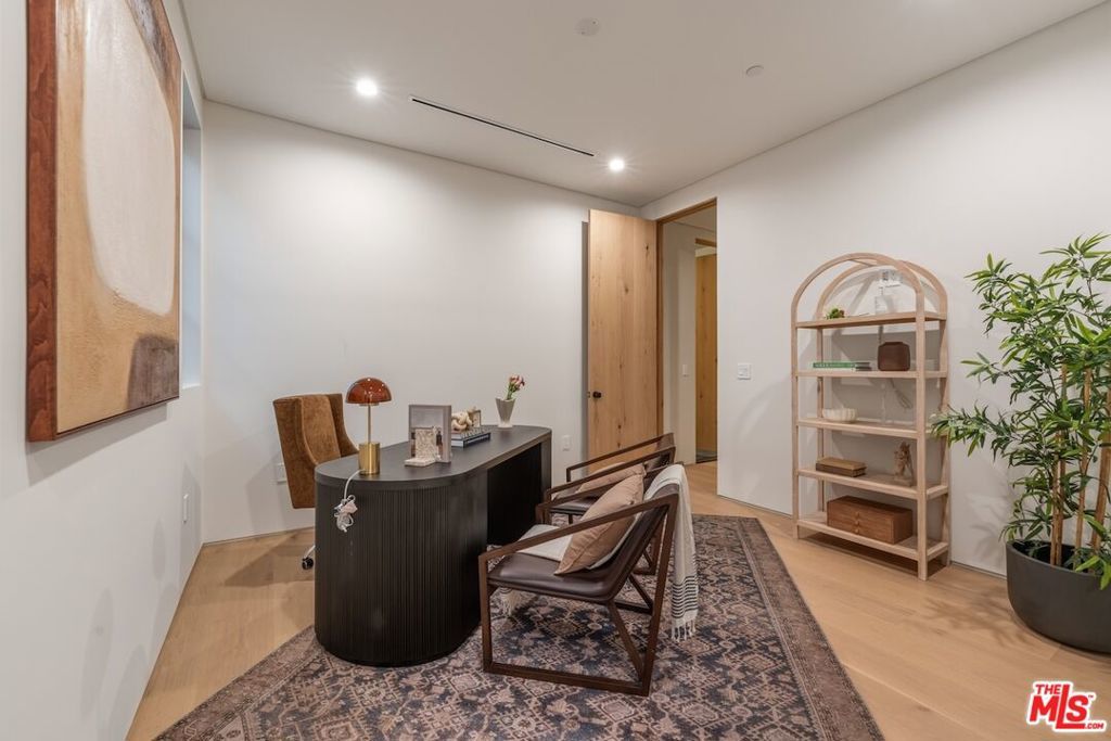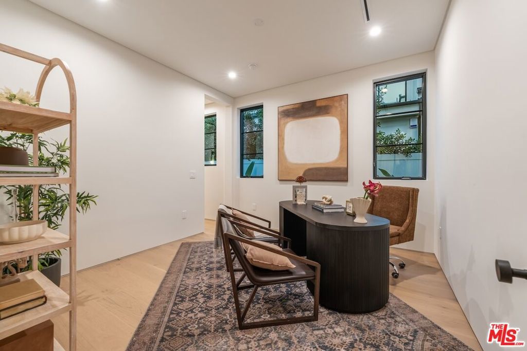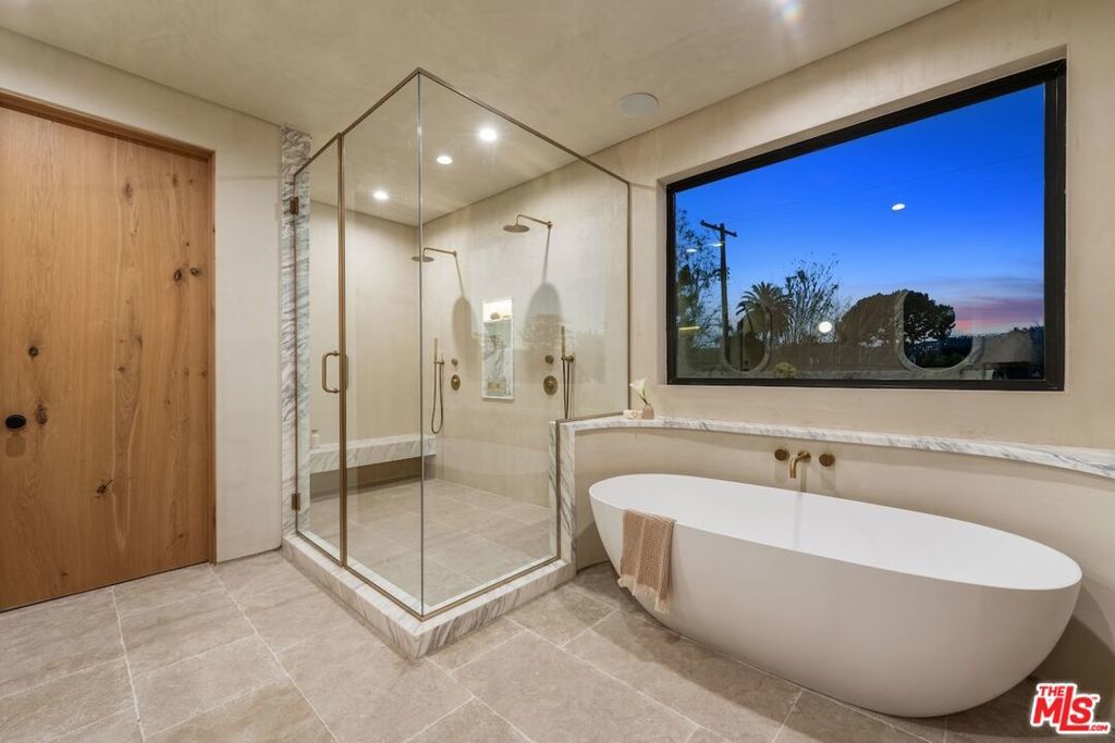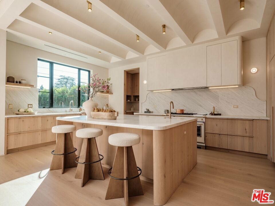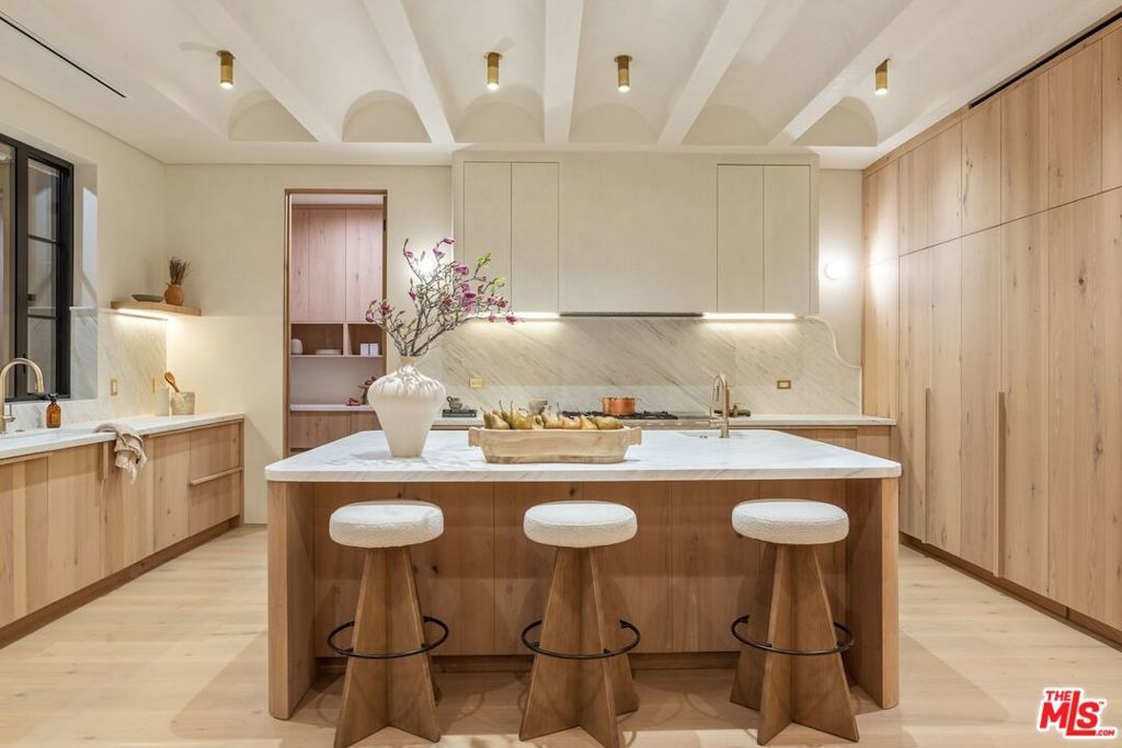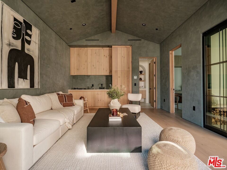 Introducing this breathtaking, one-of-a-kind home that blends sculptural architecture with warm organic materials for a serene, modern living experience. This custom-built home is situated within the highly esteemed Colfax Charter School District. Boasting 5BD/5.5BA, the property also includes a spacious casita offering open living space with an additional bedroom and bathroom. Upon entering the home, you're welcomed by hand plastered walls, curved aesthetics, and continuous wide-plank oak flooring that guides you through sun-filled spaces. The chef's kitchen is an organic showcase, centered around a gently rounded island, sculpted curved ceiling, rustic oak cabinetry, marble countertops, high-end appliances, and a walk-in pantry. The expansive family room features a sculpted fireplace wrapped in hand-finished brushed plaster and rustic curved shelving that enhances the warmth and texture of the space. Large sliding doors create a seamless transition between indoors and outdoors, revealing a resort-like sanctuary with a shimmering pool, spa, covered patio with a seating area and fireplace, and an outdoor cooking area, surrounded by lush greenery for ultimate privacy. The lower level features a cozy movie theater, an ensuite guest bedroom, and a powder room. Upstairs, the primary suite becomes a retreat of its own, boasting a softly rounded fireplace, a generous walk-in closet, and a large balcony with views of the tranquil, tropically landscaped yard. The spa-inspired primary bathroom offers a soaking tub, walk-in shower, and dual vanities finished in micro-cement and natural stone. Three additional ensuite bedrooms and a large laundry room complete the upper level. Enhanced with premium features including Control4 smart technology, whole-home surround sound, a security system with cameras, and energy-efficient solar panels, this home is both luxurious and thoughtfully connected. Located in the highly coveted community of Valley Village.
