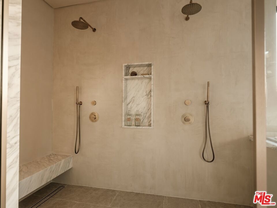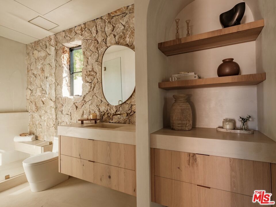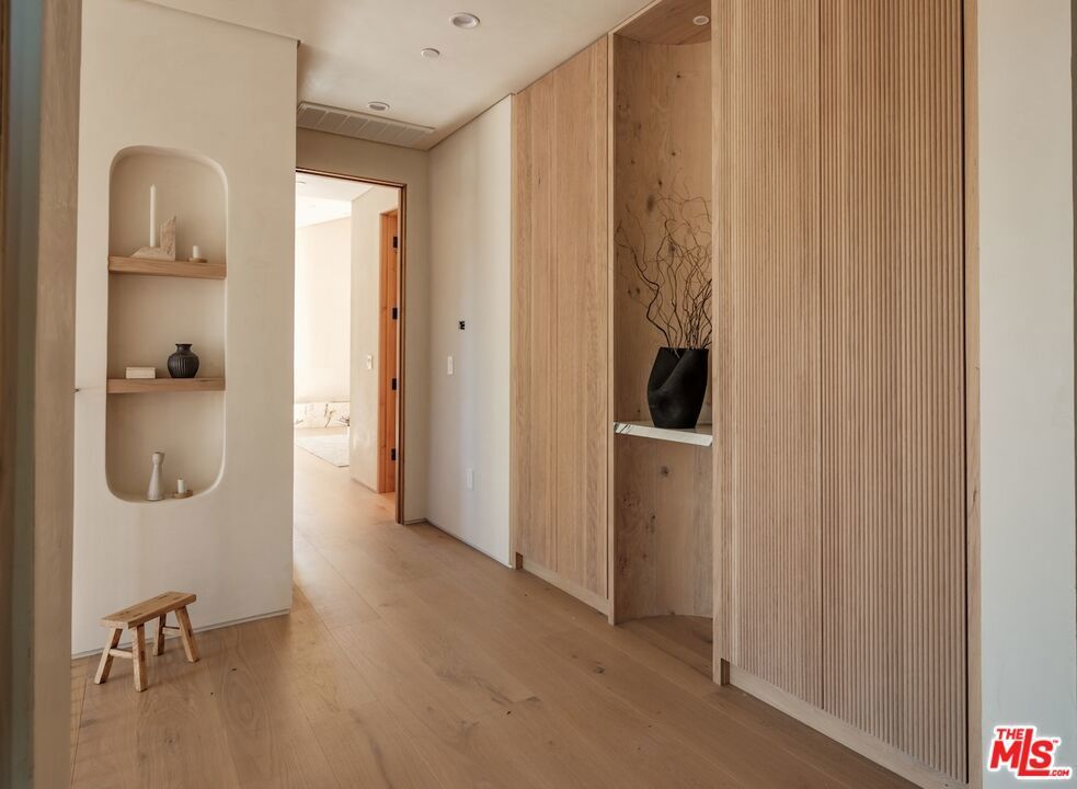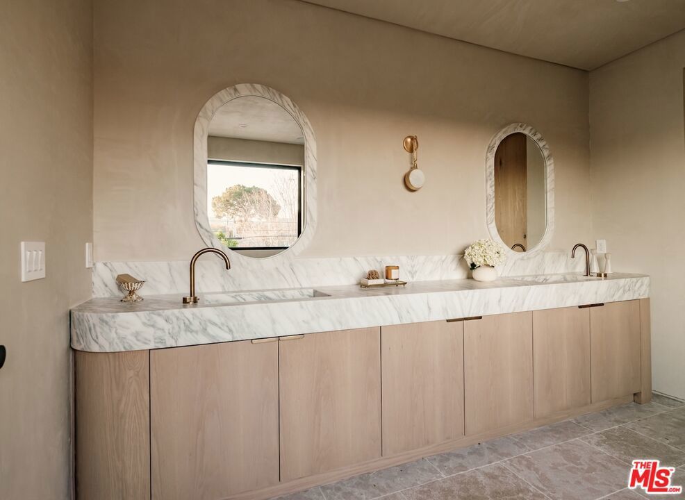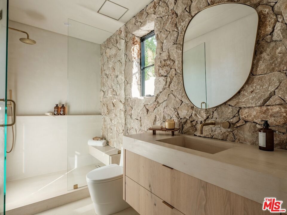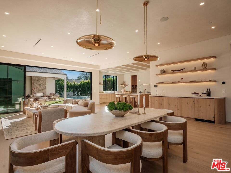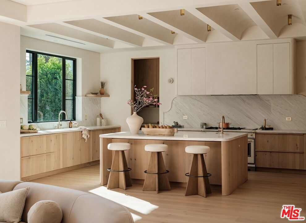 Introducing this breathtaking, one-of-a-kind home that blends sculptural architecture with warm organic materials for a serene, modern living experience. This custom-built home is situated within the highly esteemed Colfax Charter School District. Boasting 5BD/5.5BA, the property also includes a spacious casita offering open living space with an additional bedroom and bathroom. Upon entering the home, you're welcomed by hand plastered walls, curved aesthetics, and continuous wide-plank oak flooring that guides you through sun-filled spaces. The chef's kitchen is an organic showcase, centered around a gently rounded island, sculpted curved ceiling, rustic oak cabinetry, marble countertops, high-end appliances, and a walk-in pantry. The expansive family room features a sculpted fireplace wrapped in hand-finished brushed plaster and rustic curved shelving that enhances the warmth and texture of the space. Large sliding doors create a seamless transition between indoors and outdoors, revealing a resort-like sanctuary with a shimmering pool, spa, covered patio with a seating area and fireplace, and an outdoor cooking area, surrounded by lush greenery for ultimate privacy. The lower level features a cozy movie theater, an ensuite guest bedroom, and a powder room. Upstairs, the primary suite becomes a retreat of its own, boasting a softly rounded fireplace, a generous walk-in closet, and a large balcony with views of the tranquil, tropically landscaped yard. The spa-inspired primary bathroom offers a soaking tub, walk-in shower, and dual vanities finished in micro-cement and natural stone. Three additional ensuite bedrooms and a large laundry room complete the upper level. Enhanced with premium features including Control4 smart technology, whole-home surround sound, a security system with cameras, and energy-efficient solar panels, this home is both luxurious and thoughtfully connected. Located in the highly coveted community of Valley Village.