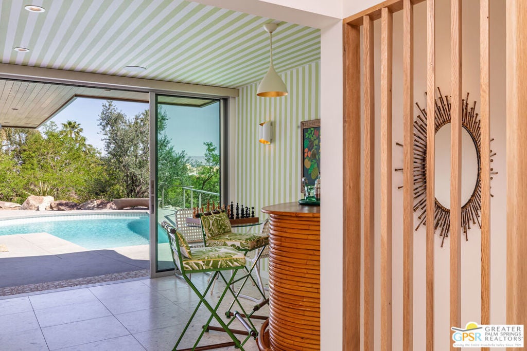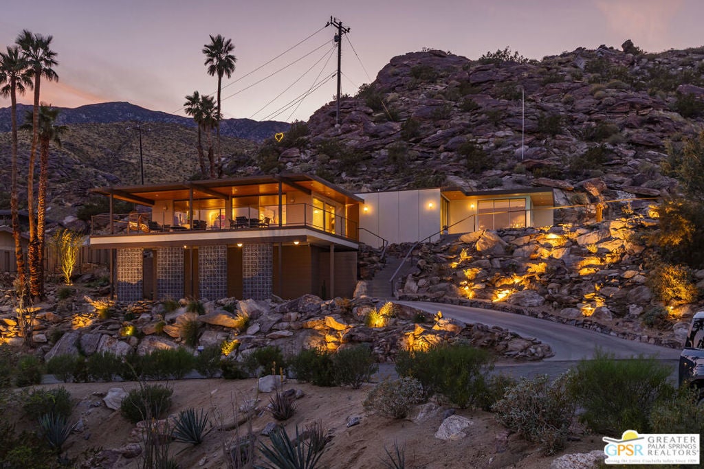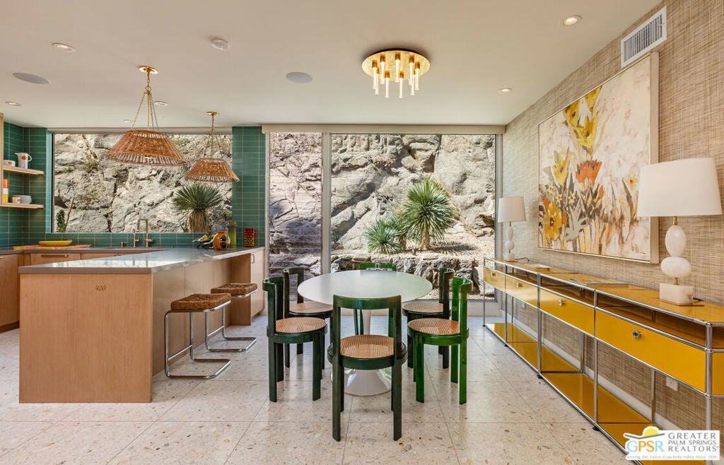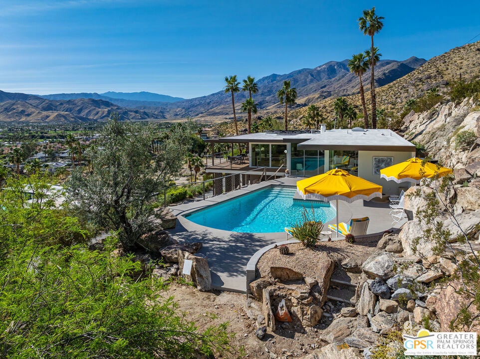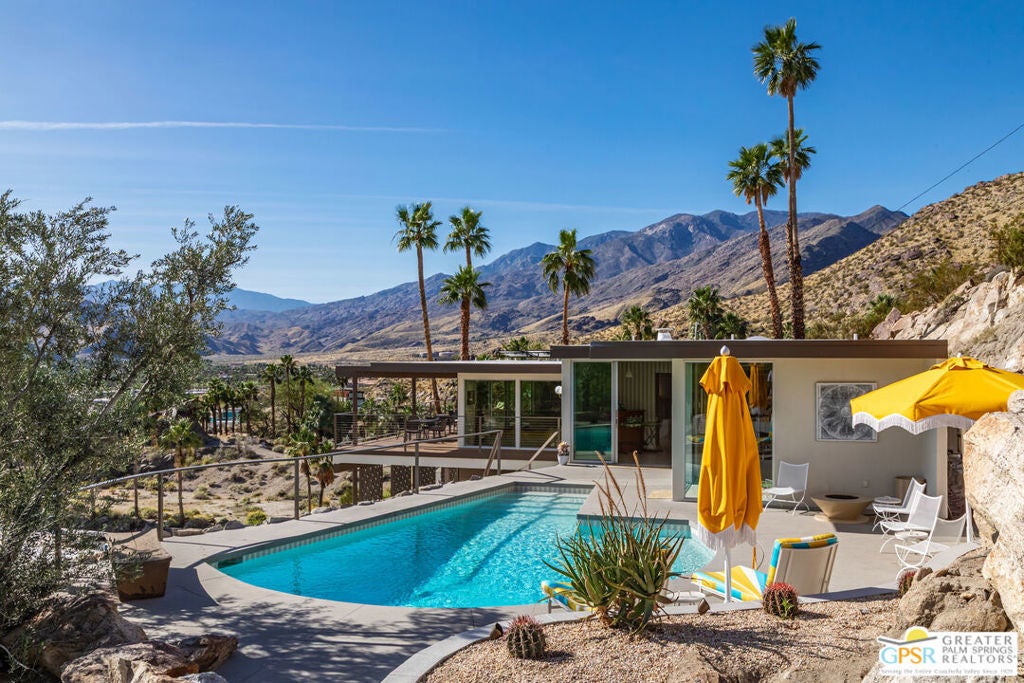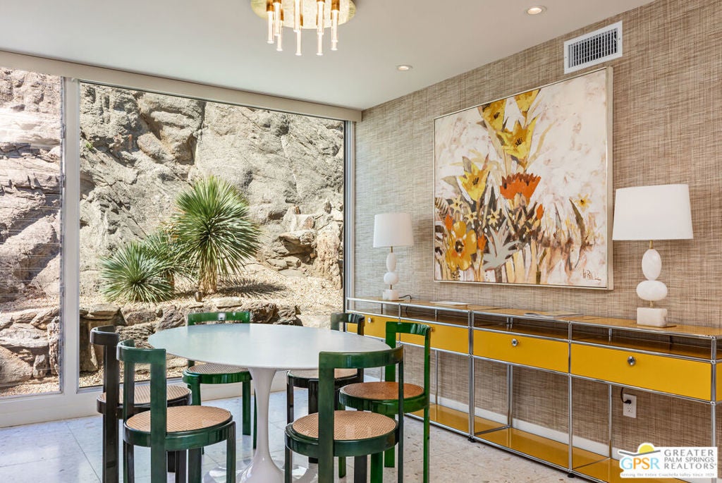 Designed in 1963 by acclaimed Los Angeles architect Harold Bissner, Sr., newly arrived in the desert following a long and distinguished career, the residence was originally commissioned by a local physician and remained in the same family for decades. Recently reimagined by fashion designer and Palm Springs style icon Trina Turk, it has been transformed into the radiant Soleil House. From the moment of entry, the home unfolds as a study in light, material, and horizon. Interior finishes from flooring and tile to wall treatments draw inspiration from the natural palette outdoors, creating a seamless dialogue between interior and landscape. Here, the immediacy of rugged, sculptural terrain meets the vast openness of the valley below, creating a dynamic spatial tension that animates every room. This dialogue is fully expressed in the dining room, where a monumental pane of glass dissolves the boundary between inside and out, pulling the craggy mountainside directly into the interior. With the slightest shift in perspective, the experience transforms from intimate proximity to the boulders to a sweeping, cinematic panorama across the desert floor. At the heart of the living room, a striking conversation pit anchors the space, both intimate and expansive, framing uninterrupted views while offering a warm, grounded connection to the fireplace. Just beyond, a generous deck projects outward, extending the architecture into the landscape and providing a commanding vantage point from which to observe the desert's ever-shifting light, color, and shadow. The floor plan is thoughtfully composed to enhance both privacy and flow. The primary suite is positioned poolside, immersed in light and landscape, while guest bedrooms are discreetly set apart at the opposite end of the home. The kitchen is large and luminous, with a huge picture window capturing the textured hillside and an overhead skylight that washes the space in natural light, an inspiring setting for daily living. Adjacent to the pool, a flexible bonus room offers an ideal retreat for a den, office, or studio. Arrival is both deliberate and architectural: a circular drive leads through a distinctive Trina Turk-designed breezeblock-clad carport, establishing rhythm, pattern, and permeability. Below, a substantial laundry room is complemented by an additional bonus space, well-suited for an office, artist's studio, or fitness room. Soleil House is a rare and compelling expression of Palm Springs modernism, where architecture, site, and sky converge in a continuous, immersive experience of space, light, and landscape.