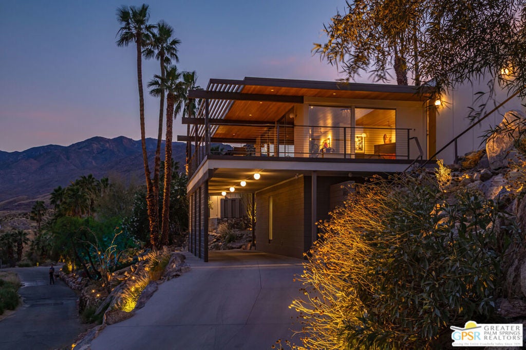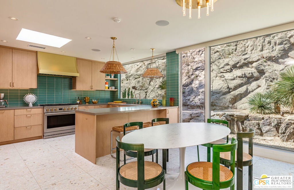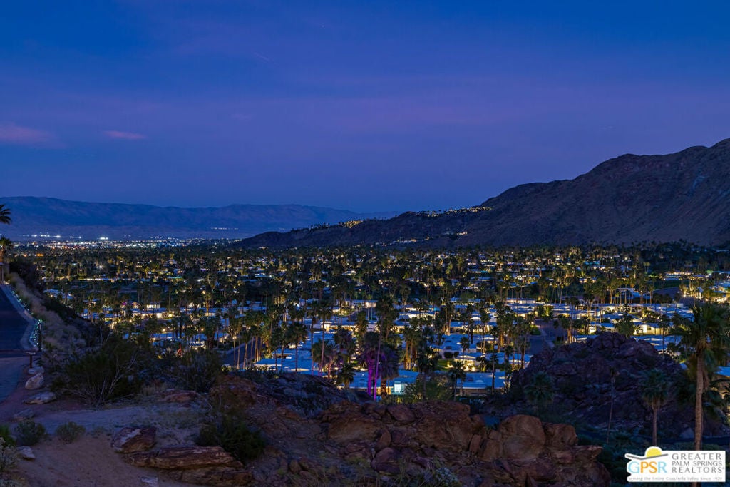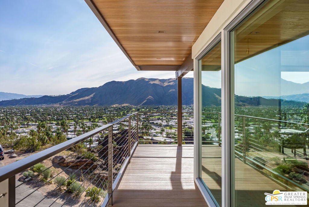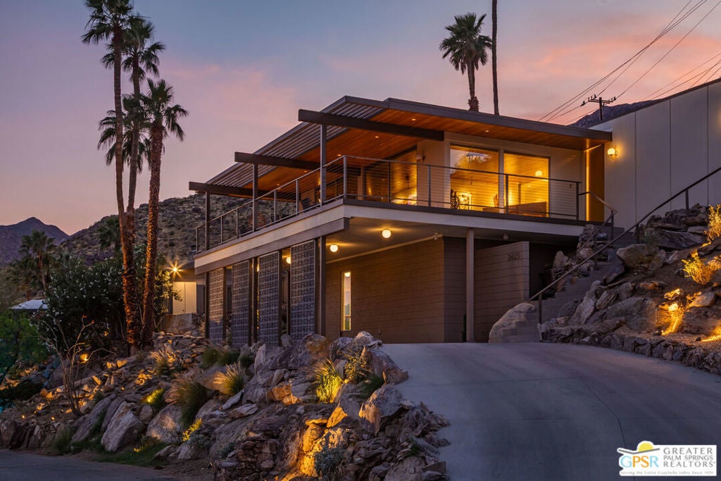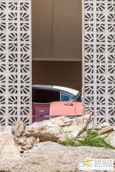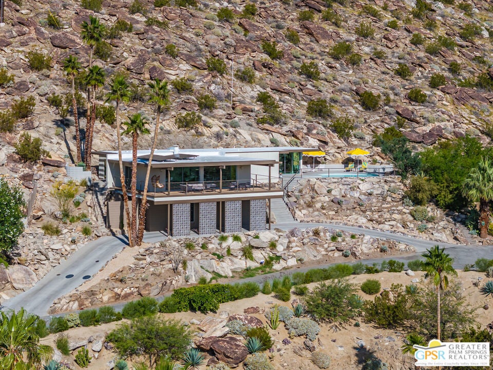 Designed in 1963 by acclaimed Los Angeles architect Harold Bissner, Sr., newly arrived in the desert following a long and distinguished career, the residence was originally commissioned by a local physician and remained in the same family for decades. Recently reimagined by fashion designer and Palm Springs style icon Trina Turk, it has been transformed into the radiant Soleil House. From the moment of entry, the home unfolds as a study in light, material, and horizon. Interior finishes from flooring and tile to wall treatments draw inspiration from the natural palette outdoors, creating a seamless dialogue between interior and landscape. Here, the immediacy of rugged, sculptural terrain meets the vast openness of the valley below, creating a dynamic spatial tension that animates every room. This dialogue is fully expressed in the dining room, where a monumental pane of glass dissolves the boundary between inside and out, pulling the craggy mountainside directly into the interior. With the slightest shift in perspective, the experience transforms from intimate proximity to the boulders to a sweeping, cinematic panorama across the desert floor. At the heart of the living room, a striking conversation pit anchors the space, both intimate and expansive, framing uninterrupted views while offering a warm, grounded connection to the fireplace. Just beyond, a generous deck projects outward, extending the architecture into the landscape and providing a commanding vantage point from which to observe the desert's ever-shifting light, color, and shadow. The floor plan is thoughtfully composed to enhance both privacy and flow. The primary suite is positioned poolside, immersed in light and landscape, while guest bedrooms are discreetly set apart at the opposite end of the home. The kitchen is large and luminous, with a huge picture window capturing the textured hillside and an overhead skylight that washes the space in natural light, an inspiring setting for daily living. Adjacent to the pool, a flexible bonus room offers an ideal retreat for a den, office, or studio. Arrival is both deliberate and architectural: a circular drive leads through a distinctive Trina Turk-designed breezeblock-clad carport, establishing rhythm, pattern, and permeability. Below, a substantial laundry room is complemented by an additional bonus space, well-suited for an office, artist's studio, or fitness room. Soleil House is a rare and compelling expression of Palm Springs modernism, where architecture, site, and sky converge in a continuous, immersive experience of space, light, and landscape.