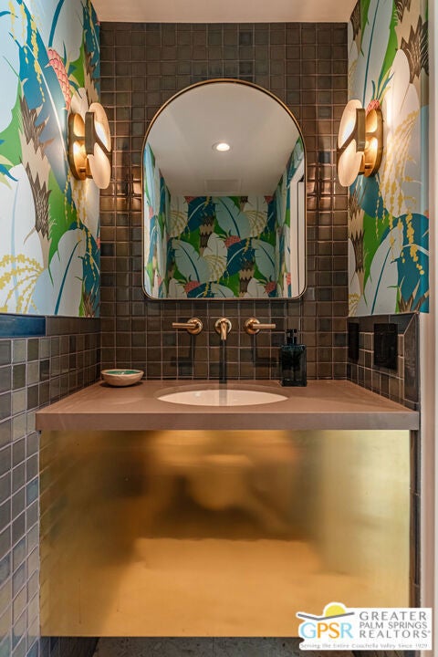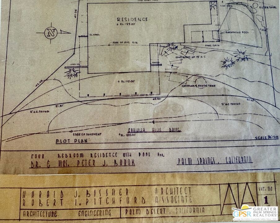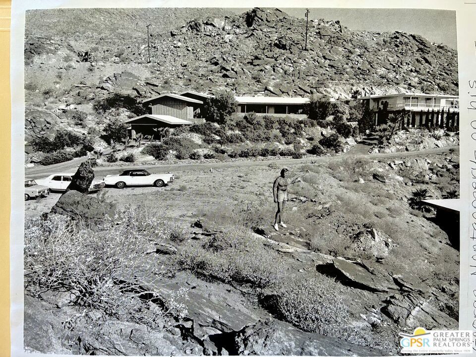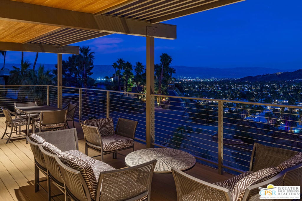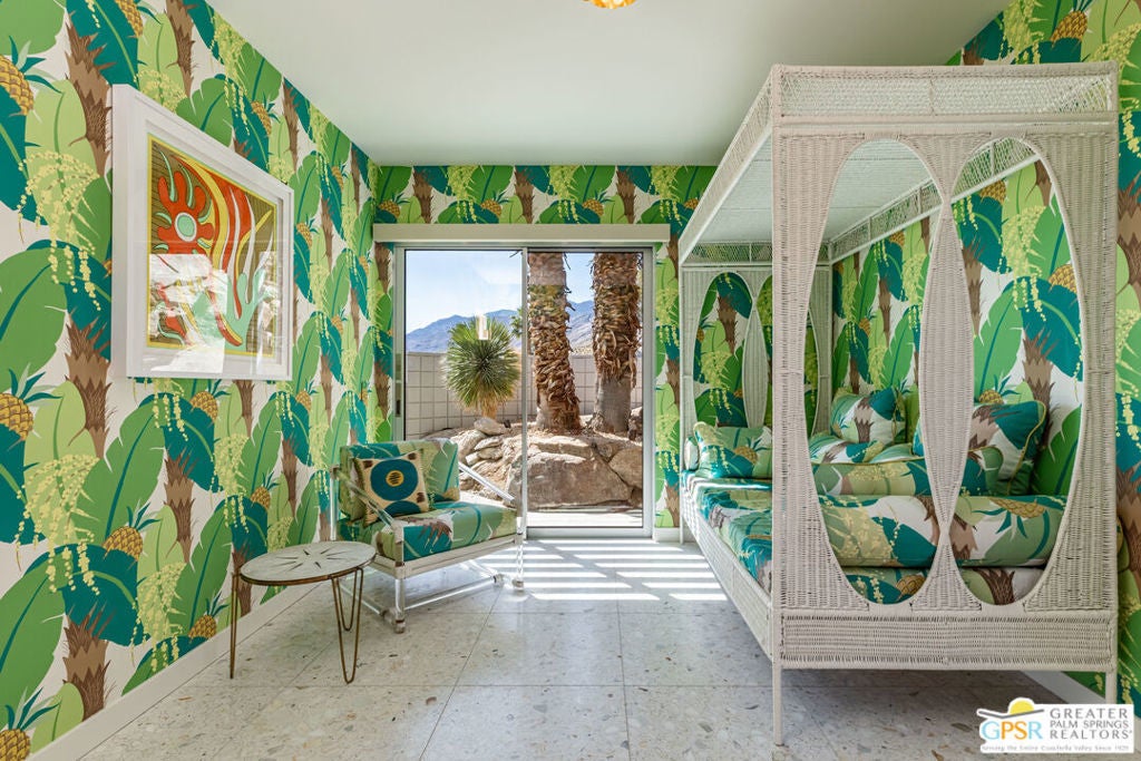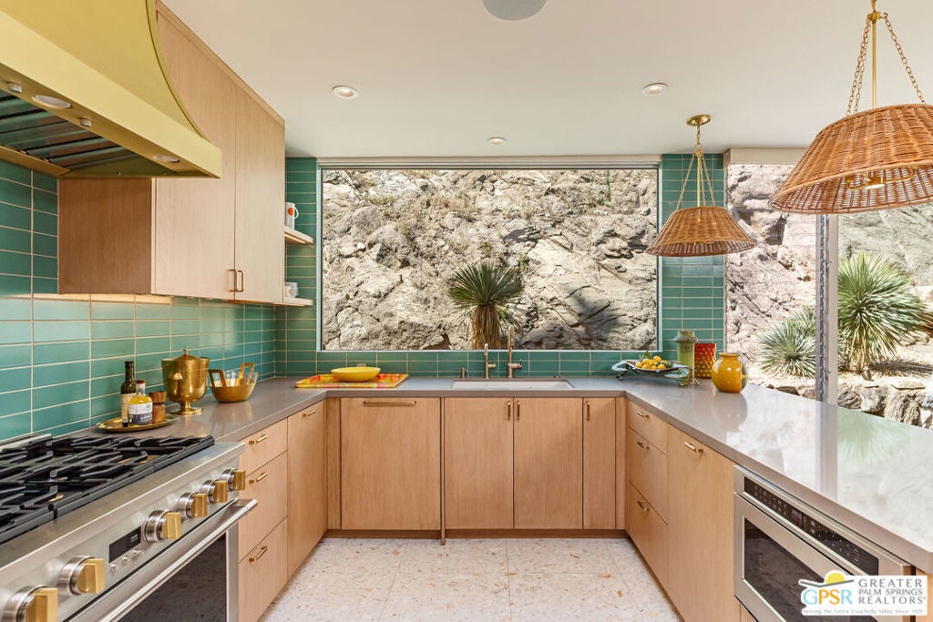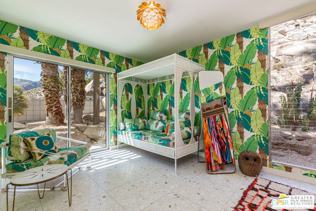 Designed in 1963 by acclaimed Los Angeles architect Harold Bissner, Sr., newly arrived in the desert following a long and distinguished career, the residence was originally commissioned by a local physician and remained in the same family for decades. Recently reimagined by fashion designer and Palm Springs style icon Trina Turk, it has been transformed into the radiant Soleil House. From the moment of entry, the home unfolds as a study in light, material, and horizon. Interior finishes from flooring and tile to wall treatments draw inspiration from the natural palette outdoors, creating a seamless dialogue between interior and landscape. Here, the immediacy of rugged, sculptural terrain meets the vast openness of the valley below, creating a dynamic spatial tension that animates every room. This dialogue is fully expressed in the dining room, where a monumental pane of glass dissolves the boundary between inside and out, pulling the craggy mountainside directly into the interior. With the slightest shift in perspective, the experience transforms from intimate proximity to the boulders to a sweeping, cinematic panorama across the desert floor. At the heart of the living room, a striking conversation pit anchors the space, both intimate and expansive, framing uninterrupted views while offering a warm, grounded connection to the fireplace. Just beyond, a generous deck projects outward, extending the architecture into the landscape and providing a commanding vantage point from which to observe the desert's ever-shifting light, color, and shadow. The floor plan is thoughtfully composed to enhance both privacy and flow. The primary suite is positioned poolside, immersed in light and landscape, while guest bedrooms are discreetly set apart at the opposite end of the home. The kitchen is large and luminous, with a huge picture window capturing the textured hillside and an overhead skylight that washes the space in natural light, an inspiring setting for daily living. Adjacent to the pool, a flexible bonus room offers an ideal retreat for a den, office, or studio. Arrival is both deliberate and architectural: a circular drive leads through a distinctive Trina Turk-designed breezeblock-clad carport, establishing rhythm, pattern, and permeability. Below, a substantial laundry room is complemented by an additional bonus space, well-suited for an office, artist's studio, or fitness room. Soleil House is a rare and compelling expression of Palm Springs modernism, where architecture, site, and sky converge in a continuous, immersive experience of space, light, and landscape.
