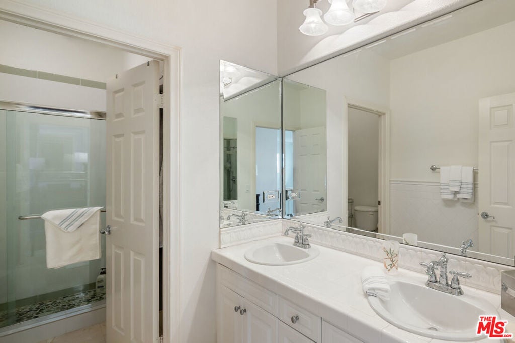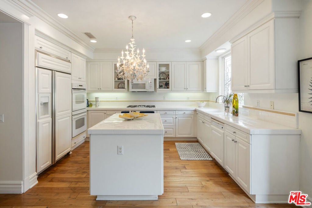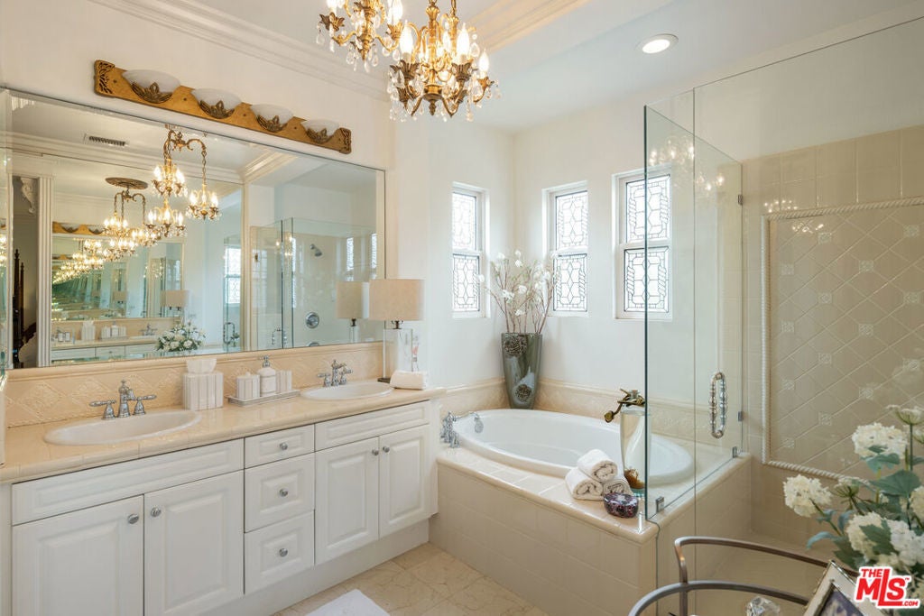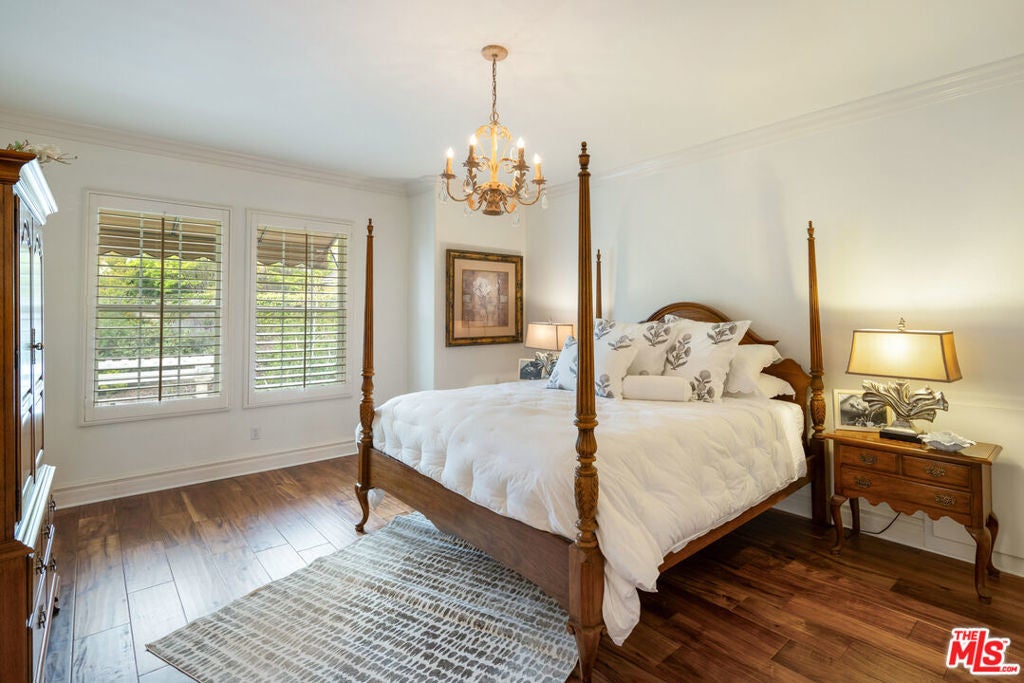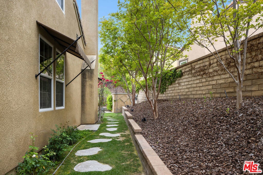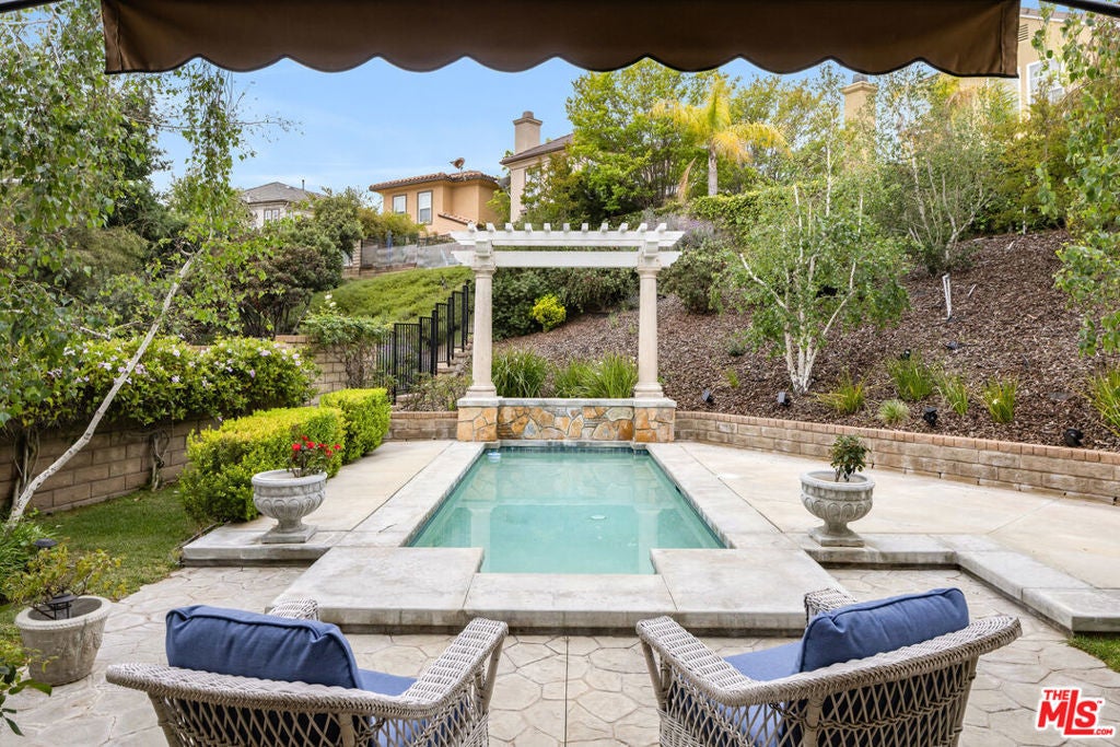 Welcome to this stunning residence situated within the highly sought-after gated community of Westridge in Valencia. Upon entry, you are greeted by soaring double-height ceilings and an abundance of natural light that flows effortlessly throughout the home, creating a warm and inviting atmosphere. This spacious floor plan features 5 bedrooms and 3 full bathrooms, including a desirable downstairs bedroom, currently used as a den and a full bath perfect for guests or multi-generational living. The open-concept design connects the formal dining room, cozy family room, and chef's kitchen, making it ideal for entertaining. The white and bright kitchen is beautifully appointed with a large island, built-in refrigerator, dishwasher, and custom cabinetry with pull-out drawers. French doors open to a private backyard retreat featuring a sparkling pool, tranquil fountains, and a large patio space designed for effortless indoor-outdoor living. Additional highlights include hardwood flooring, wood shutters, crown molding, a pre-hardwired security system, a downstairs laundry room with washer and dryer, and a spacious 2-car garage with direct entrance. Enjoy resort-style amenities including two Jr. Olympic-size pools, spas, a clubhouse, parks, tennis courts, basketball courts, and BBQ areas all with no Mello Roos and a low HOA. Located within walking distance to top-rated schools, golf at The Oaks Club, shops, dining, and just minutes from the 5 Freeway, this home truly has it all.