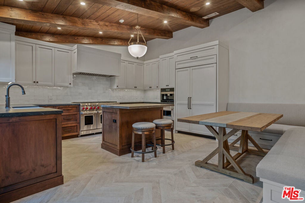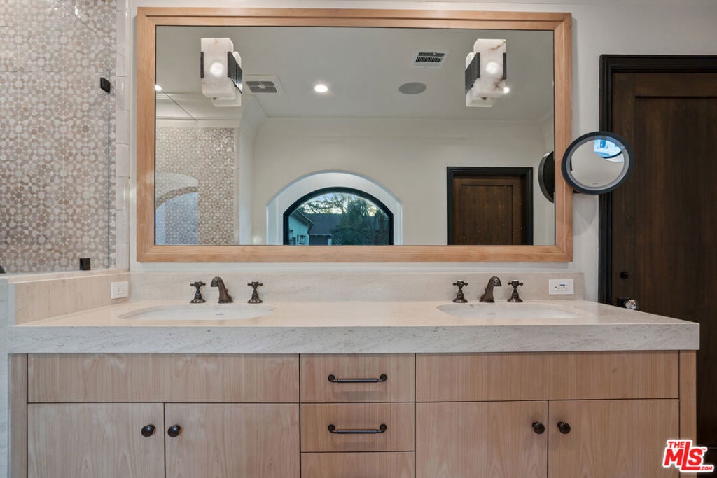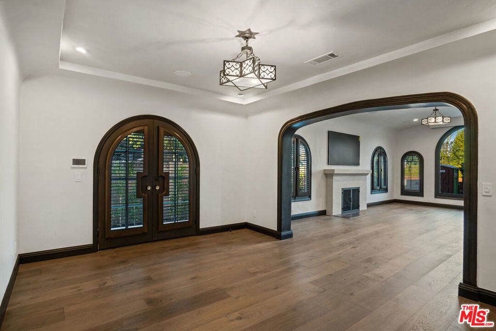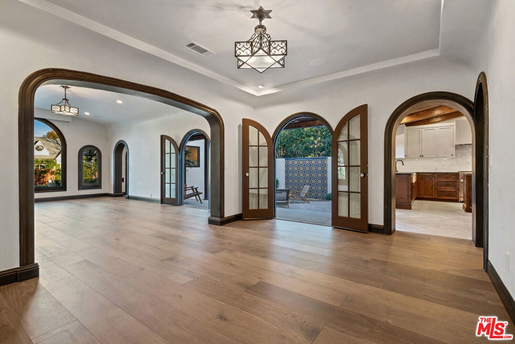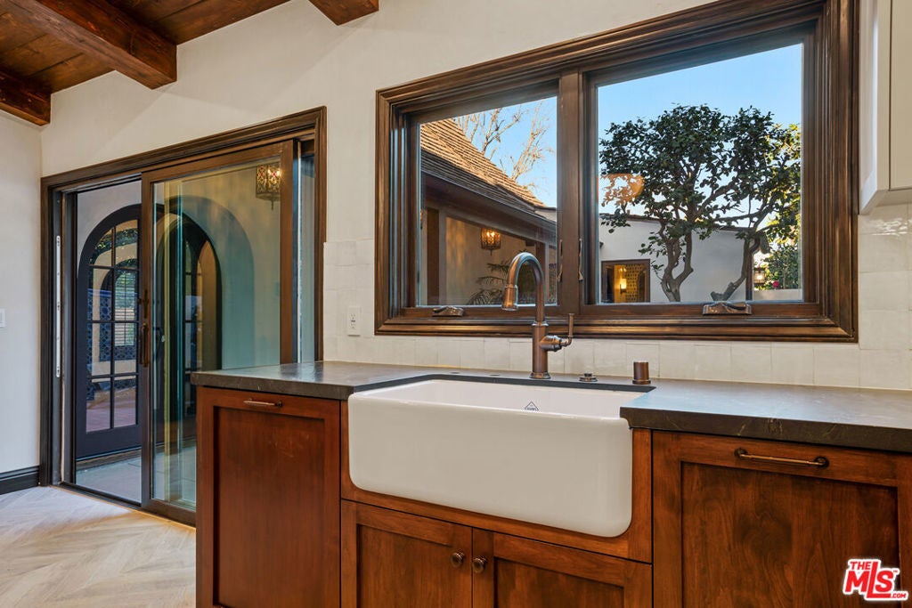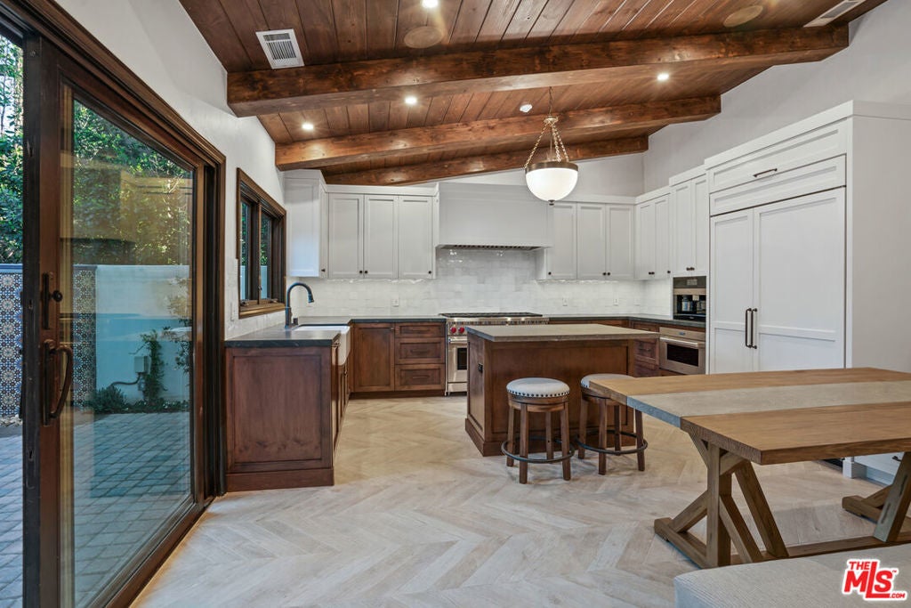 From the moment you walk across the front garden, you're welcomed into a storybook setting where classic Tudor charm meets elevated, modern design. Step into this masterfully reimagined home in the heart of Toluca Lake, a beautifully remodeled 2-bedroom, 2.5-bath residence that showcases a thoughtful blend of craftsmanship and luxury, complete with a fully detached studio ADU perfect for guests, a creative workspace, additional bedroom, gym or home office. Inside, the home is rich with curated details: elegant engineered hardwood floors flow throughout, complemented by striking designer wall finishes that add depth and personality to each space. French doors open seamlessly to the outdoors, enhancing the indoor-outdoor flow and inviting in natural light. The kitchen and baths feature exquisite Zellige tile, porcelain surfaces and refined marble accents, creating a sophisticated yet inviting aesthetic. The chef's kitchen is a true delight, featuring a charming built-in banquette for casual dining and gathering, and outfitted with premium appliances including a Wolf range, Sub-Zero refrigerator, built-in Miele coffee maker and Miele dishwasher perfectly designed for both everyday living and elevated entertaining. Custom, handcrafted iron light fixtures designed by a Santa Barbara artisan serve as statement pieces, each enhanced with distinctive glass inserts that cast a warm, ambient glow. Vaulted ceilings elevate the living spaces, filling the home with natural light and an airy sense of openness. The primary suite offers a true retreat, highlighted by a spa-inspired bath with a soaking tub framed by innovative smart glass delivering both privacy and a touch of modern luxury. At the heart of the property, the private courtyard is a true show piece, an entertainer's dream featuring a tiled waterfall fountain, cozy firepit, and outdoor BBQ, creating a seamless indoor-outdoor lifestyle perfect for relaxing or hosting under the stars. Beyond the interior, a gated entrance provides privacy and security, while the detached studio ADU adds versatility and value to this exceptional property. A rare blend of classic Tudor charm and contemporary sophistication, this Toluca Lake gem is designed to impress at every turn. Conveniently close to renowned dining, outstanding shopping and just a short drive to the Westside, beaches and freeways. Create your California lifestyle.