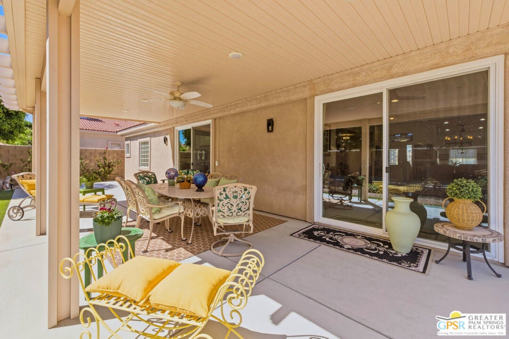 Welcome to this charming and well-maintained home! It is situated at the end of an extremely quiet cul-de-sac in Sedona Estates, one of Bermuda Dunes' most desirable communities. This residence offers style, comfort and value in our desert oasis. Walking up to the entry you will discover well maintained Desertscaping. As you enter the front door you will observe an abundance of natural light. The home offers a warm, open floor plan designed for both everyday living and entertaining. The kitchen features newer S/S appliances and elegant updated cabinet hardware. An enjoyable breakfast nook with lots of natural light is an easy flow into the main living areas. The spacious layout with high ceilings, windows and a slider create natural daylight. The extra sitting room with a window offers day light for added flexibility. The primary suite is generously sized to unwind with a Roman tub for soaking. The suite offers a walk-in closet, new tiles, a private water closet with its own additional sink. The second spacious bedroom enjoys a full ensuite bathroom, ideal for extended family, teenagers, guests, multigenerational living. The third bedroom is currently being used as an office. The oversized garage was built as a three-car with a window in lieu of a door. A conversion is easily accomplished! The south facing extra-large concrete patio with Alumawood cover, lights, ceiling fan is great for outdoor living year round. The backyard offers a natural desert landscape, immaculately trimmed Ficus trees lining the perimeter, creating a polished and private setting. Looking for a pool? There is ample space to design your dream backyard aquascape. Come experience the warmth, comfort, and charm of this beautifully maintained home and imagine making it your own. This home has over 2,100 sq.ft. of living space with three-year-old S/S appliances, along with new LED ceiling lights, concrete walkways, extended concrete for a three car garage, cabinet hardware throughout, tiles, beveled glass front door, sliders, blinds, drapes, fans, light fixtures, faucets, doorknobs. HOA dues $28/mo., IID electric service for lower costs, within one mile of Bermuda Dunes CC, close to Indian Wells Tennis, Polo Fields, PGA West, shopping, Restaurants.