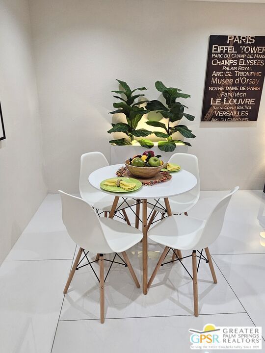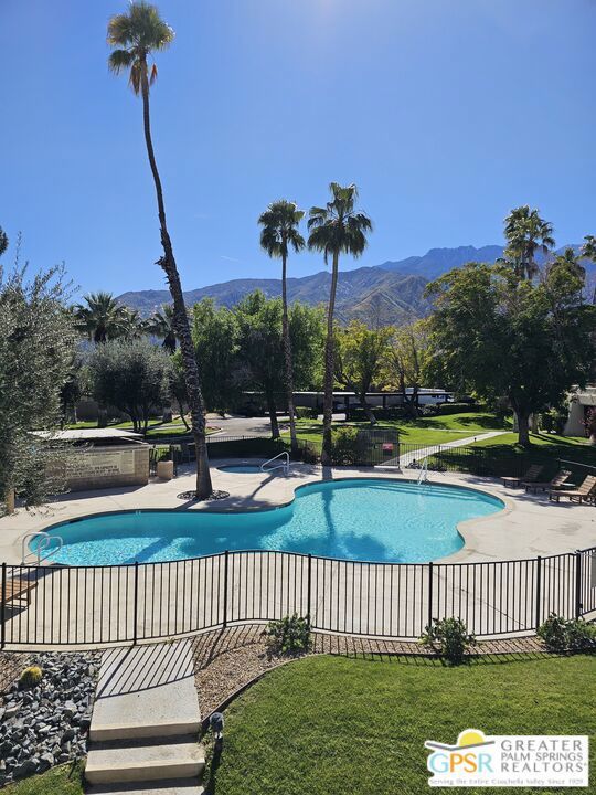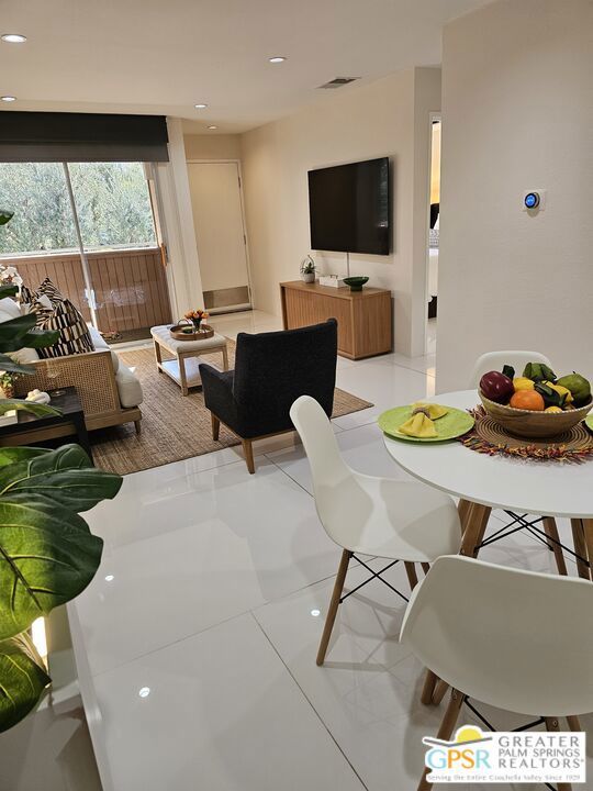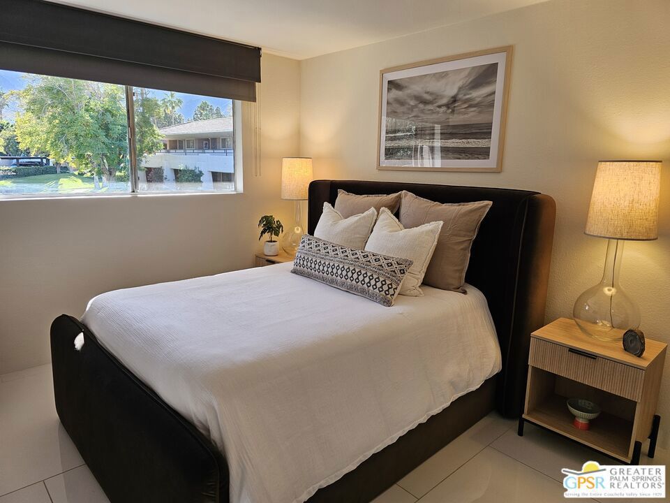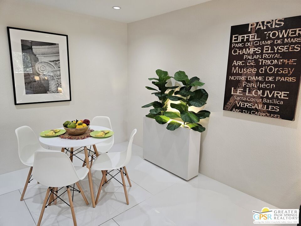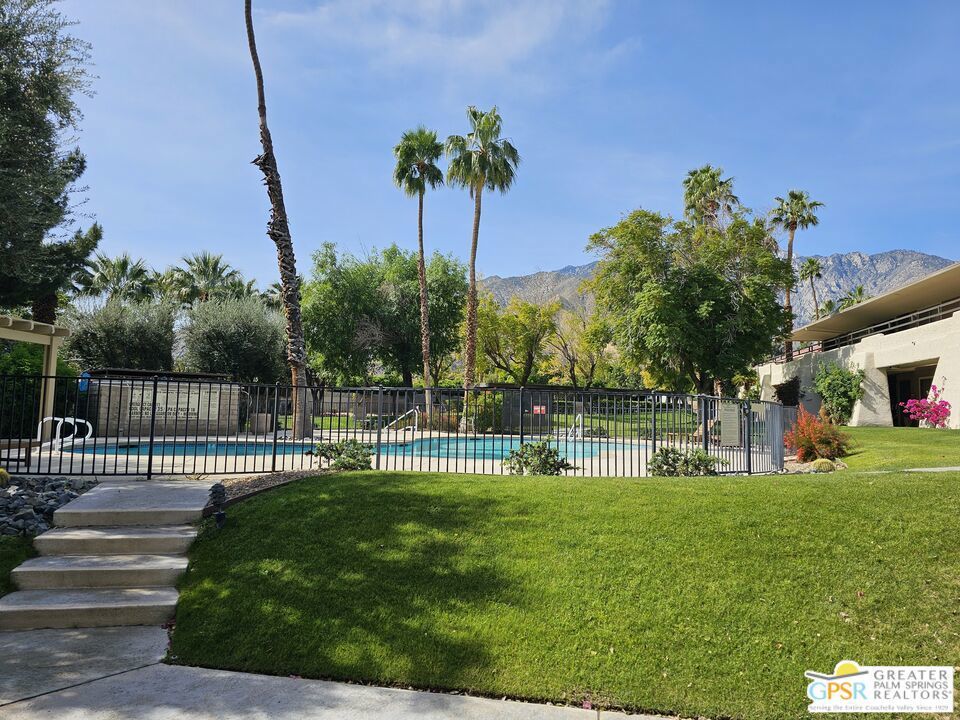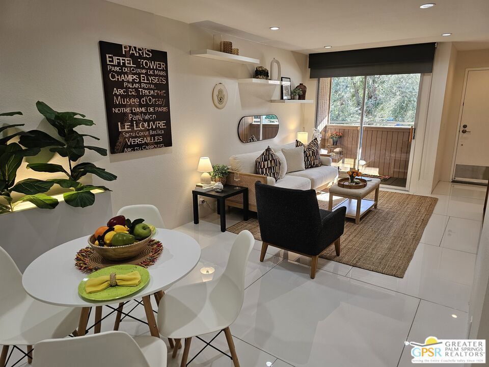 Your stylish Palm Springs escape is beautiful and ready for use! This turn-key furnished desert get-away is in sunny Palm Springs on Fee Simple land and is located in the sought-after Palm Springs Villas I community. This quiet upper-level condo has had a newer renovation with the kitchen, bath and flooring all replaced with sleek modern finishes: fresh wall paint, recessed lighting, two-tiered window blinds for filtered light or black-out, white 48 inch floor tiles from Spain, quartz countertops, stainless steel appliances, brand new French door refrigerator with icemaker, & new living room and dining furniture. This condo is so well-kept, even the HVAC is only 4 years old! The unit offers the ultimate blend of convenience, comfort, and resort-style amenities and is situated near the pool, covered parking, and lush green spaces. Whether you're seeking a low-maintenance vacation home or a smart long-term investment, this turn-key residence delivers. Your bedroom view overlooks the park-like grounds and the crystal blue pool with the panoramic views of San Jacinta mountains just beyond. Finally, you can have a place that takes care of YOU instead of a place that you just take care of. Wake up to mountain views, sip your coffee by the pool, and embrace the care-free lifestyle that makes Palm Springs iconic. This fenced community offers 5 heated pools and spas, 4 tennis courts, beautifully maintained lush grounds, and pet-friendly grassy areas all included with your reasonable $550/month HOA, (which covers water, sewer, trash, and even hot water!). You'll also enjoy the peace of mind in knowing that you own the land and there are no additional land lease fees to pay! This community is ideally positioned across from the Aerial Tramway and just 5 minutes from downtown's best dining, shopping, entertainment and the famous weekly VillageFest! You'll be perfectly situated to enjoy everything this vibrant city has to offer. The HOA allows for a 30-day rental minimum (No short-term rentals) (No FHA financing). A modern well-equipped community laundry room is available & nearby. This is your chance to enjoy a piece of paradise on land that you own! **Some staging items belong to the listing agent and are not included in the transaction. **Buyer is advised to independently verify the accuracy of all information.