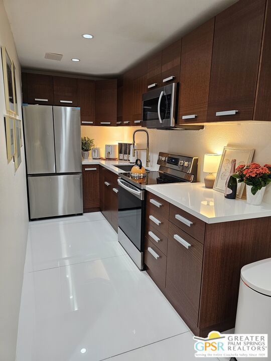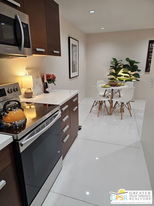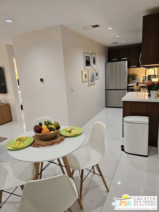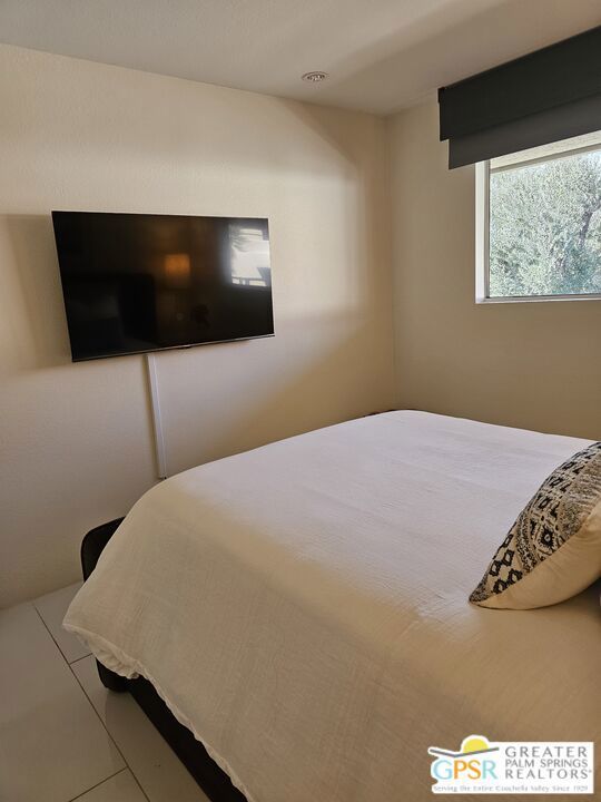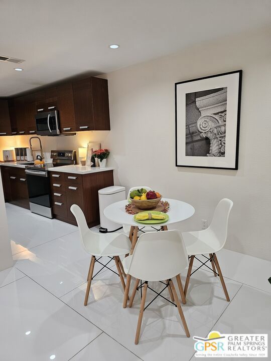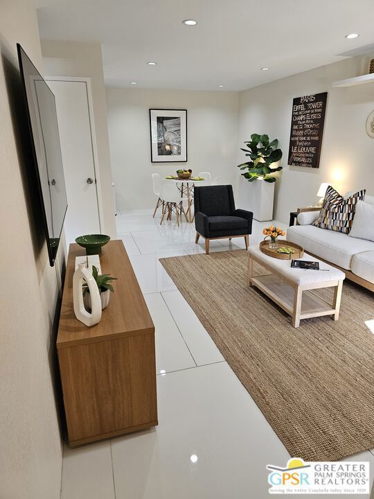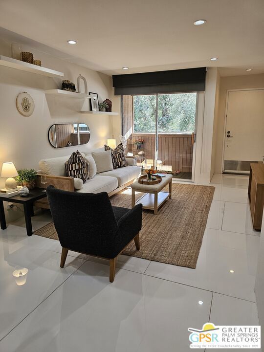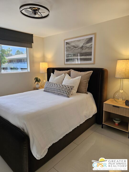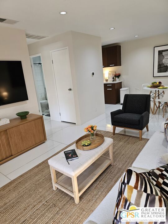 Your stylish Palm Springs escape is beautiful and ready for use! This turn-key furnished desert get-away is in sunny Palm Springs on Fee Simple land and is located in the sought-after Palm Springs Villas I community. This quiet upper-level condo has had a newer renovation with the kitchen, bath and flooring all replaced with sleek modern finishes: fresh wall paint, recessed lighting, two-tiered window blinds for filtered light or black-out, white 48 inch floor tiles from Spain, quartz countertops, stainless steel appliances, brand new French door refrigerator with icemaker, & new living room and dining furniture. This condo is so well-kept, even the HVAC is only 4 years old! The unit offers the ultimate blend of convenience, comfort, and resort-style amenities and is situated near the pool, covered parking, and lush green spaces. Whether you're seeking a low-maintenance vacation home or a smart long-term investment, this turn-key residence delivers. Your bedroom view overlooks the park-like grounds and the crystal blue pool with the panoramic views of San Jacinta mountains just beyond. Finally, you can have a place that takes care of YOU instead of a place that you just take care of. Wake up to mountain views, sip your coffee by the pool, and embrace the care-free lifestyle that makes Palm Springs iconic. This fenced community offers 5 heated pools and spas, 4 tennis courts, beautifully maintained lush grounds, and pet-friendly grassy areas all included with your reasonable $550/month HOA, (which covers water, sewer, trash, and even hot water!). You'll also enjoy the peace of mind in knowing that you own the land and there are no additional land lease fees to pay! This community is ideally positioned across from the Aerial Tramway and just 5 minutes from downtown's best dining, shopping, entertainment and the famous weekly VillageFest! You'll be perfectly situated to enjoy everything this vibrant city has to offer. The HOA allows for a 30-day rental minimum (No short-term rentals) (No FHA financing). A modern well-equipped community laundry room is available & nearby. This is your chance to enjoy a piece of paradise on land that you own! **Some staging items belong to the listing agent and are not included in the transaction. **Buyer is advised to independently verify the accuracy of all information.