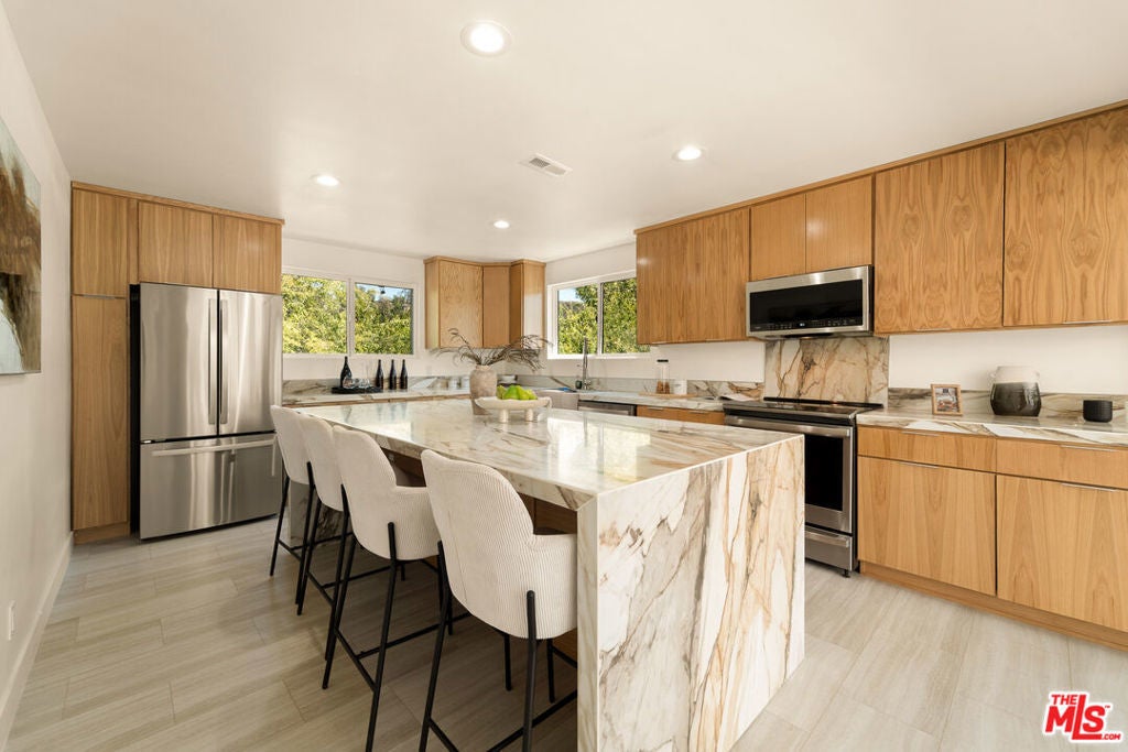 Topanga compound retreat set on more than half an acre of fully usable land. Two separate street entrances provide effortless arrival and abundant parking for residents and guests. Indoor and outdoor living define the home. Fleetwood windows open the main living areas to expansive patios beneath open skies, framing sweeping views of the Santa Monica Mountains. A generous front patio sets the stage for al fresco dining and relaxed gatherings, while the pool enjoys its own private area away from the main living spaces, creating a serene environment for lounging or entertaining. Inside, the living room, dining area, and family room connect with natural flow, designed for both comfort and conversation. The cook's kitchen stands at the center with a large island offering plentiful prep space and storage. A vaulted wood ceiling crowns the family room, where windows capture the landscape and bathe the interiors in natural light. The primary suite is spacious and features a private bath with dual vanities, a soaking tub, an expansive shower, and a walk-in closet. Two additional bedrooms are located on the main floor alongside a full bathroom with an oversized shower. The lower level adds versatile space to suit your lifestyle. A lounge can serve as a media or game room and easily function as an additional bedroom if desired. A full bathroom is also on this level, along with a separate room with its own entrance, ideal for an office, studio, guest quarters, or extra storage. Outdoors, the grounds invite both relaxation and gatherings, whether by the pool, on the patios, or across the broad usable lot. Nearby are scenic trailheads and beloved local favorites, with convenient access to both the Westside and the Valley.