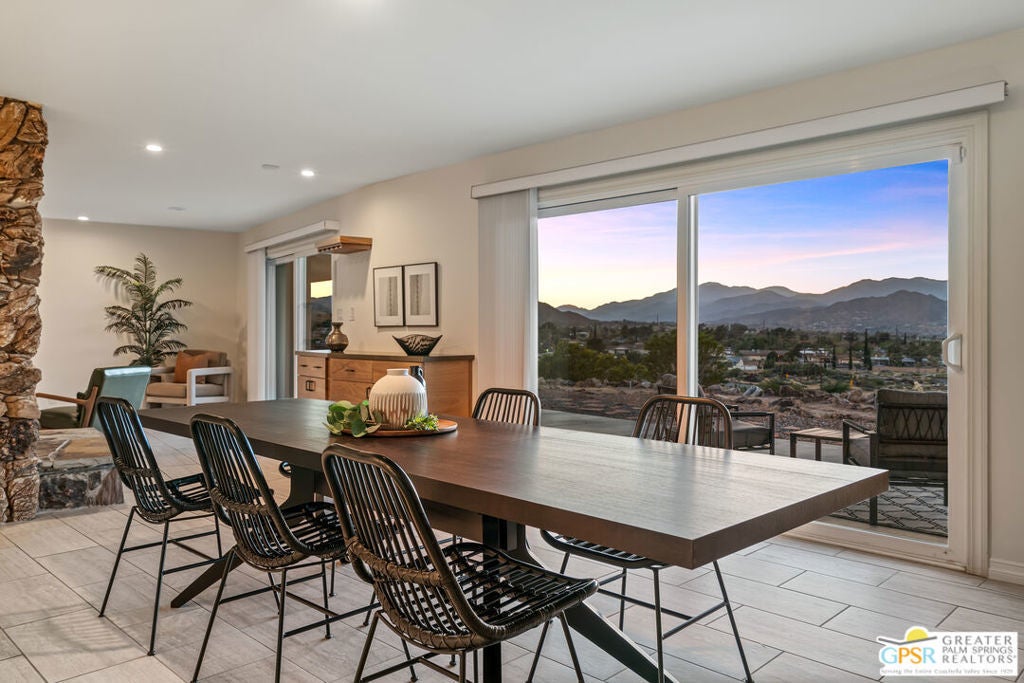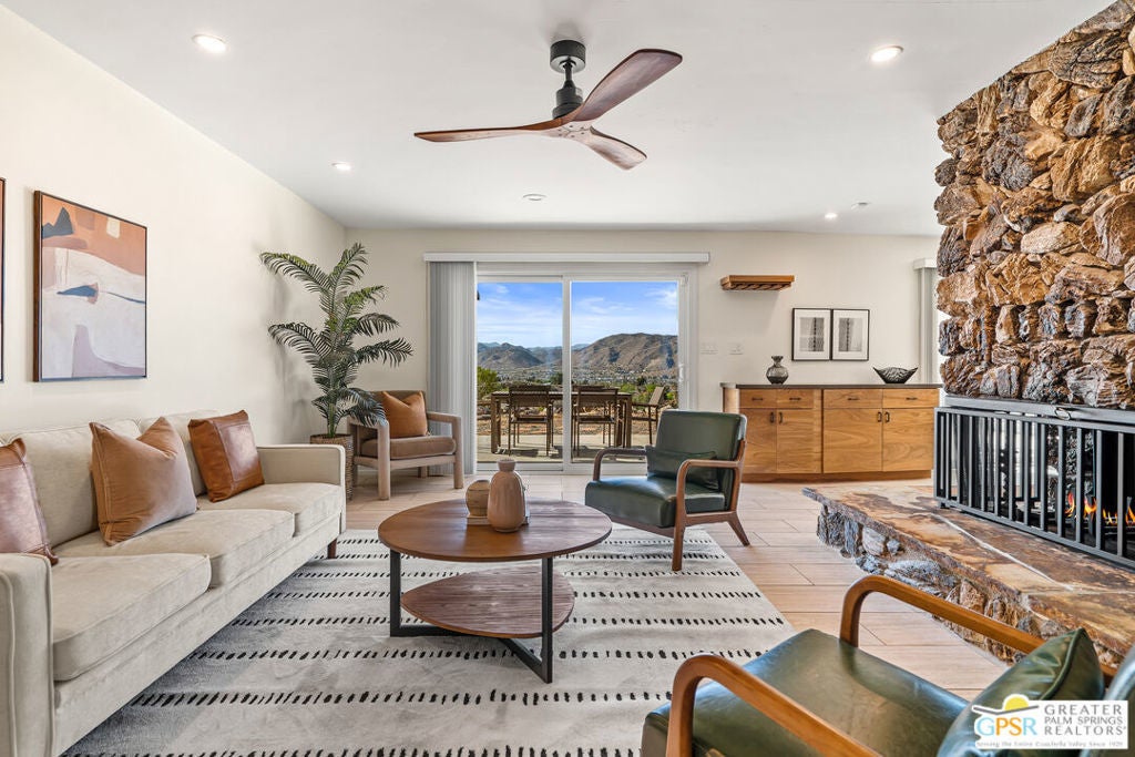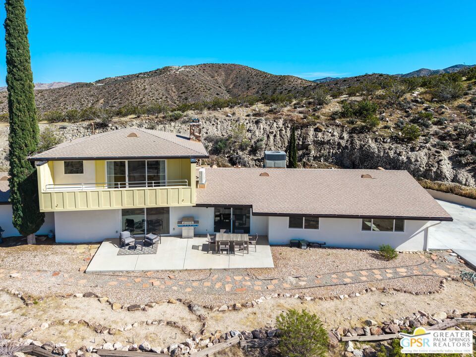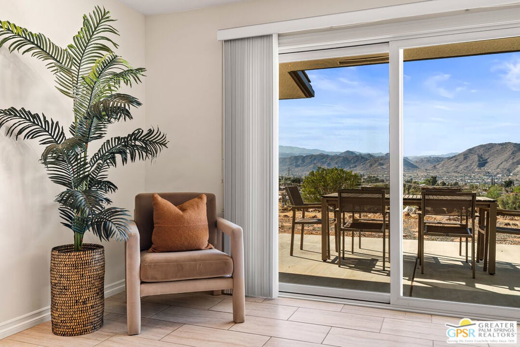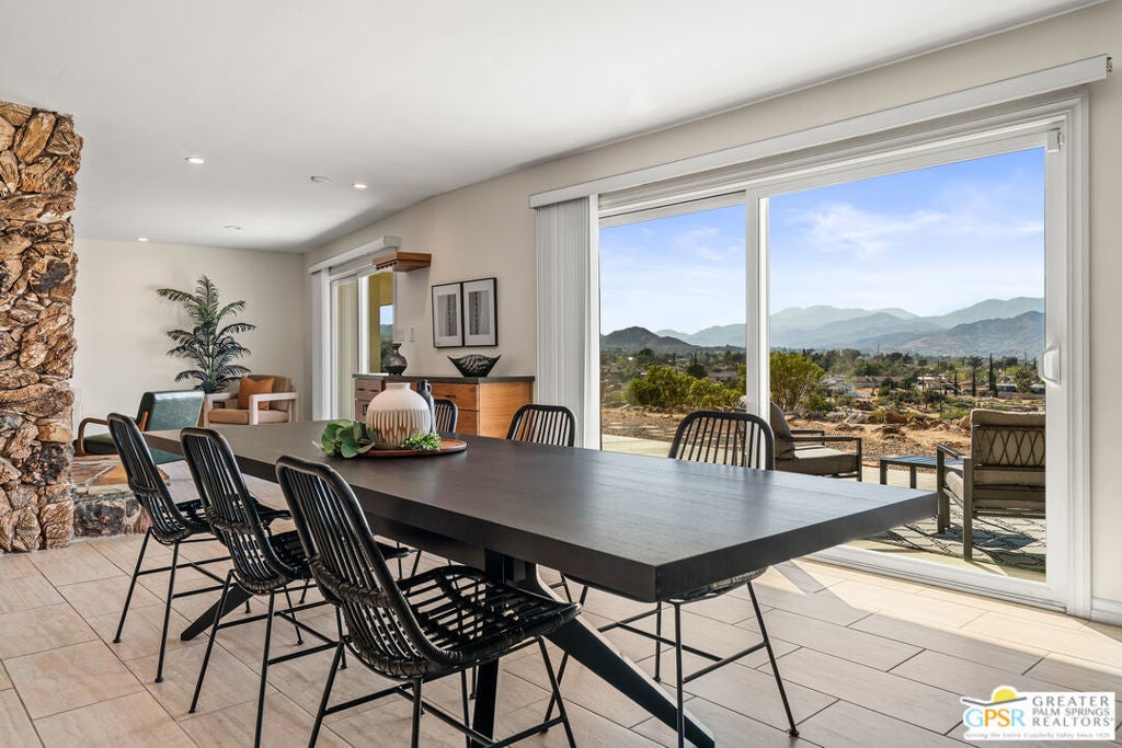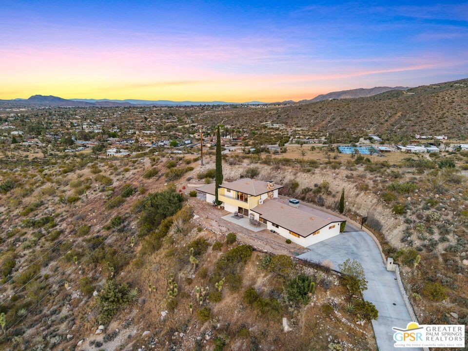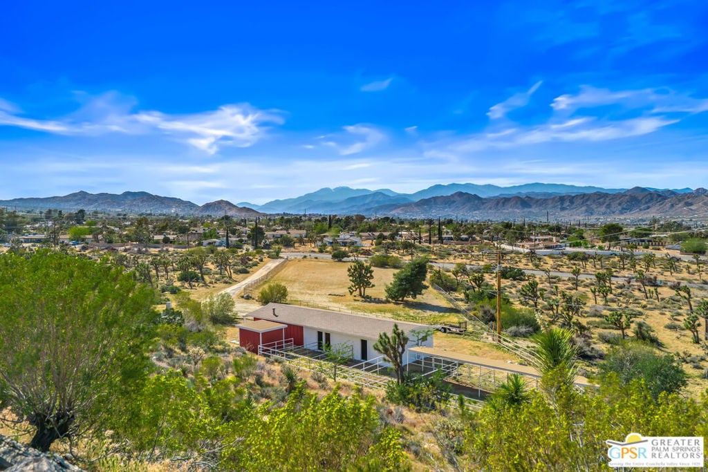 HORSE PROPERTY WITH VIEWS! Yucca Valley 4 BD | 3.5 BA | 3,065 SF | Barn & Corral | 5 Acres | Two Parcels Perched atop a hill, this striking mid-century home offers sweeping panoramic views and a rare combination of privacy and convenience, just minutes from town. The expansive open floor plan is anchored by a stunning natural rock fireplace that enhances both the living and dining areas. Custom rock detailing continues on the staircase, thoughtfully designed to showcase art and sculpture. The main level features three bedrooms; a junior primary suite, a guest bedroom, and a gym. Guest bedroom and gym share hall bath. Beautiful wood built-in cabinetry for ample storage. A powder room and laundry area are conveniently located just off the kitchen. Upstairs, the spacious primary suite captures breathtaking "forever" views and includes a walk-in closet, dedicated A/C, and a luxurious bathroom with dual vanities, and shower. The galley kitchen offers a breakfast bar, separate beverage and wine coolers, opens to the dining area, and frames the home's incredible vistas. The oversized garage features epoxy flooring, a work area, and is wired for an electric vehicle charger. Equestrian amenities include a barn with four stables and a corral. This home is all electric. Call for your private showing!