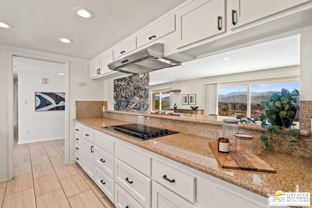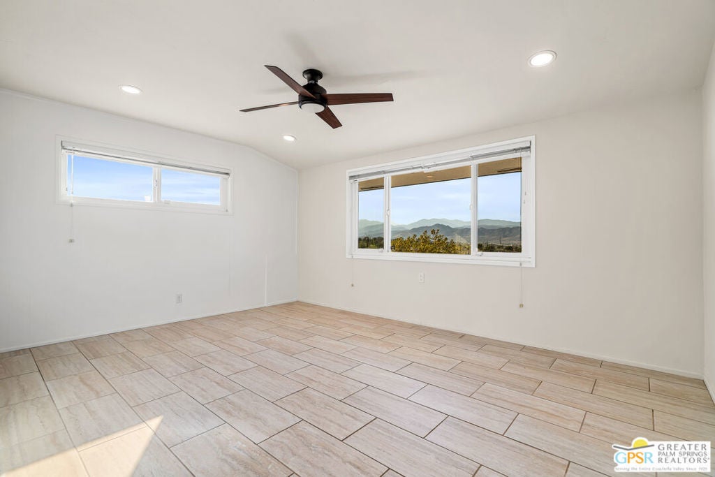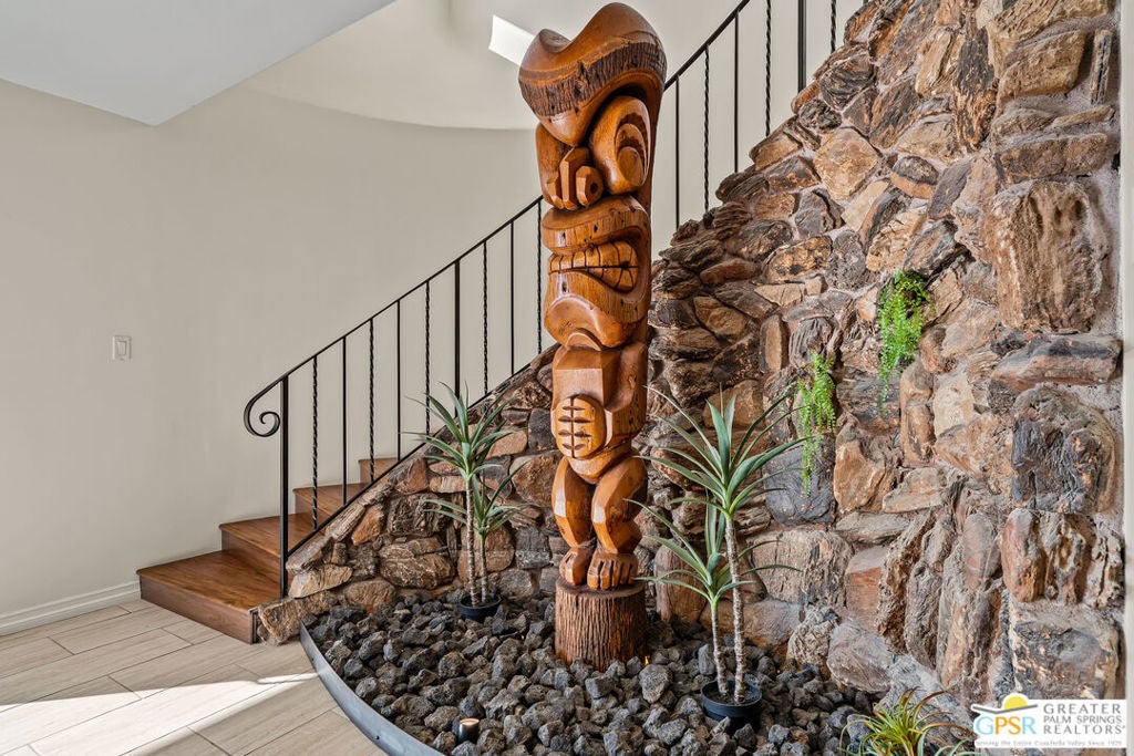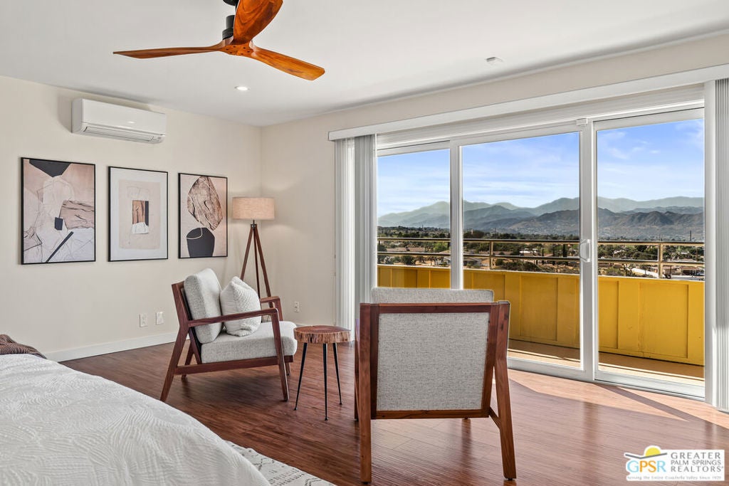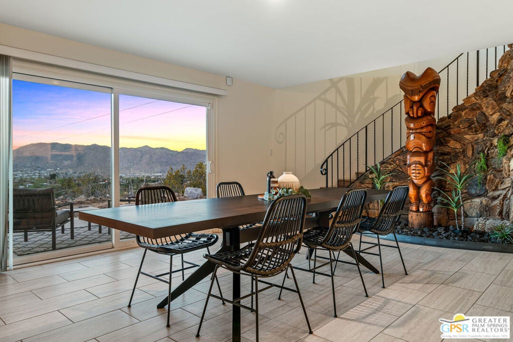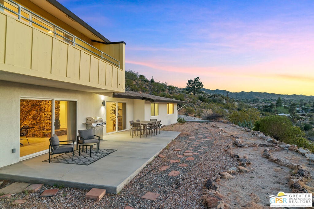 HORSE PROPERTY WITH VIEWS! Yucca Valley 4 BD | 3.5 BA | 3,065 SF | Barn & Corral | 5 Acres | Two Parcels Perched atop a hill, this striking mid-century home offers sweeping panoramic views and a rare combination of privacy and convenience, just minutes from town. The expansive open floor plan is anchored by a stunning natural rock fireplace that enhances both the living and dining areas. Custom rock detailing continues on the staircase, thoughtfully designed to showcase art and sculpture. The main level features three bedrooms; a junior primary suite, a guest bedroom, and a gym. Guest bedroom and gym share hall bath. Beautiful wood built-in cabinetry for ample storage. A powder room and laundry area are conveniently located just off the kitchen. Upstairs, the spacious primary suite captures breathtaking "forever" views and includes a walk-in closet, dedicated A/C, and a luxurious bathroom with dual vanities, and shower. The galley kitchen offers a breakfast bar, separate beverage and wine coolers, opens to the dining area, and frames the home's incredible vistas. The oversized garage features epoxy flooring, a work area, and is wired for an electric vehicle charger. Equestrian amenities include a barn with four stables and a corral. This home is all electric. Call for your private showing!