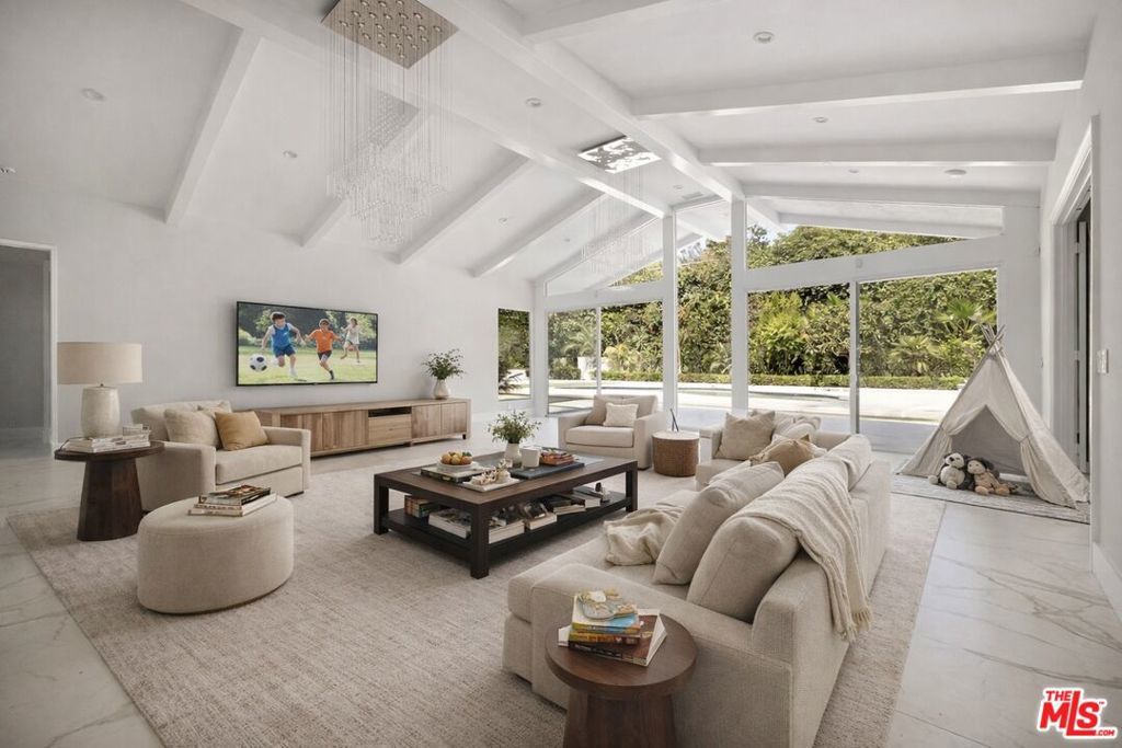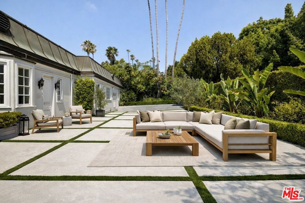 Welcome to this beautifully renovated single-story Hollywood Regency estate, ideally positioned in the coveted Flats of Beverly Hills. Set behind gates on an expansive 24,300+ sq. ft. lot, this nearly 5,800 sq. ft. residence offers a rare combination of scale, privacy, and effortless indoor-outdoor living all on one level. Designed for both refined living and entertaining, the home features four spacious bedrooms and six well-appointed bathrooms, including a serene primary suite with a spa-inspired bath and generous walk-in closet. The main living spaces are thoughtfully laid out, with multiple formal and informal areas, a gourmet kitchen, and a dedicated dining room creates a seamless flow for everyday living or larger gatherings. Outdoors, the estate transforms into a private resort. Lush, mature landscaping surrounds a sparkling pool and expansive patio areas, offering complete privacy and a tranquil setting for entertaining or relaxation. A large motor court provides exceptional on-site parking for 15+ vehicles an uncommon amenity in this location. Moments from the best of Beverly Hills, this property delivers a rare opportunity combining scale, security, and timeless design in one of the city's most sought-after neighborhoods. Available furnished - inquire for pricing. Photos have been staged virtually by AI.