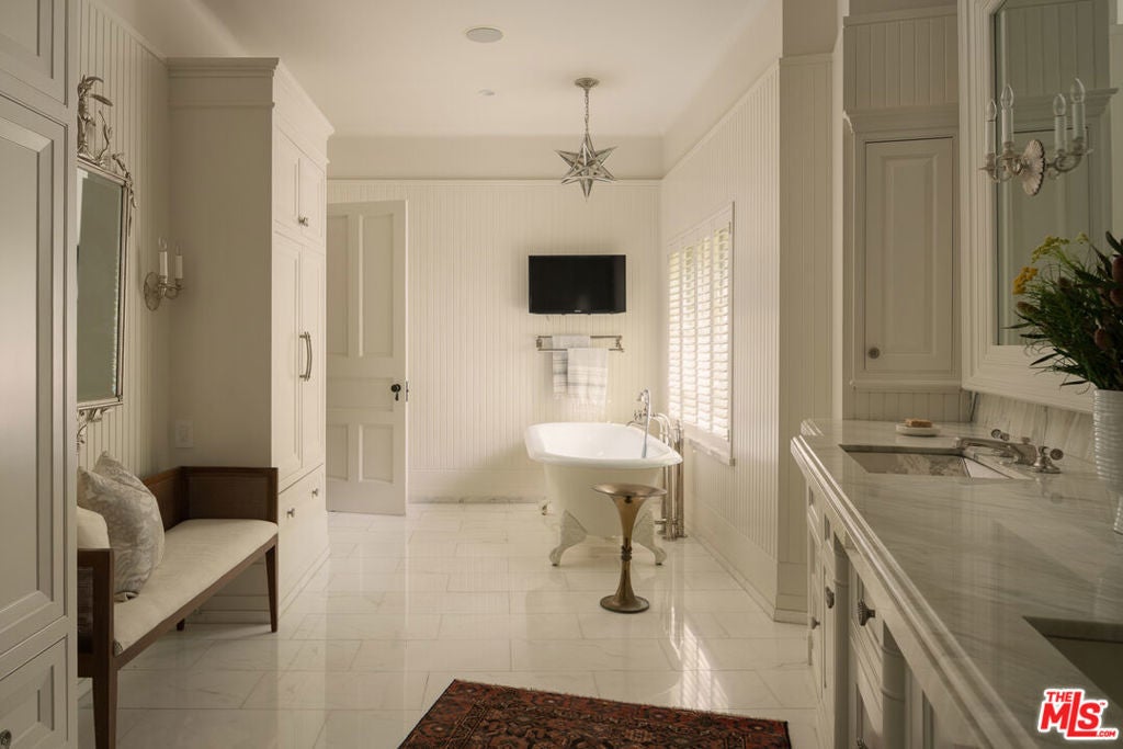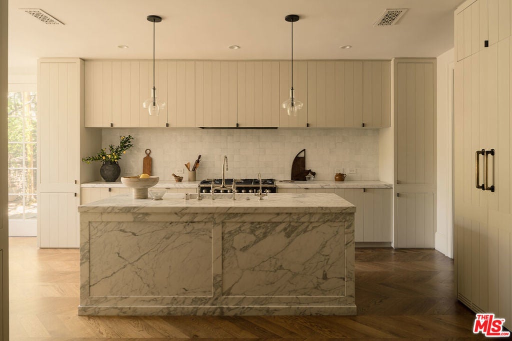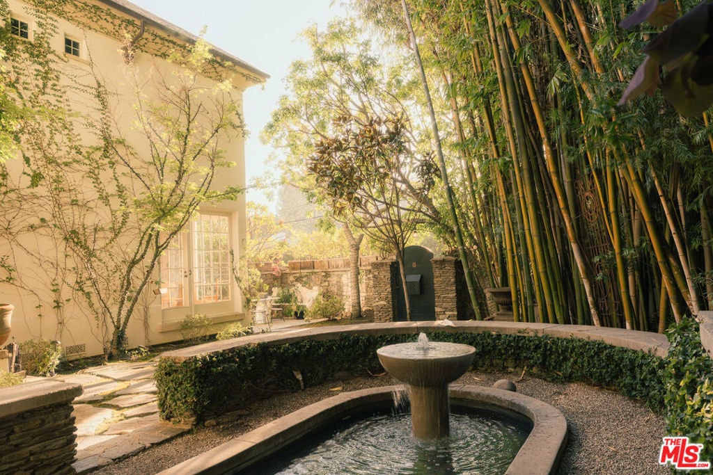 Located in the coveted guard-gated enclave of Hidden Valley Estates, this beautifully renovated French Traditional residence designed by AD100 firm Clements Design spans approximately 5,500 square feet. Privately set behind lush landscaping, the 5-bedroom, 6-bathroom home blends timeless architecture with modern comfort. The custom kitchen features a La Cornue range, built-in Miele coffee system, and a Carrara marble island that opens to the formal dining area. A sunlit, west-facing breakfast nook flows into a serene outdoor seating space surrounded by mature greenery, stonework, a koi pond, and multiple water features. Custom marble floors lead to the formal living room with a stunning wood-burning fireplace and an adjacent newly built screened porch outfitted with electric heaters. A spacious family room with handcrafted shelving, generous storage, and a sleek bar equipped with a wine and beverage fridge and icemaker offers a versatile space ideal for entertaining or relaxed lounging. A cozy en-suite bedroom completes the main level. The upper level, accessible by two separate staircases, offers four beautifully appointed en-suite bedrooms, including a luxurious, oversized primary suite with a sitting area, private balcony, and generously sized walk-in closet. The park-like grounds feature a 40-foot swimming pool, two fire pits, and multiple seating areas across over 13,000 square foot lot delivering a private, verdant landscaped retreat that perfectly embodies refined California living. First time offered in over a decade, this is a rare opportunity combining exceptional design, tranquility, and one of the most sought-after addresses in the area.