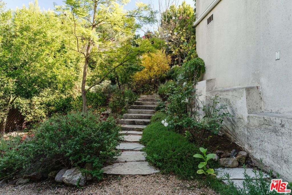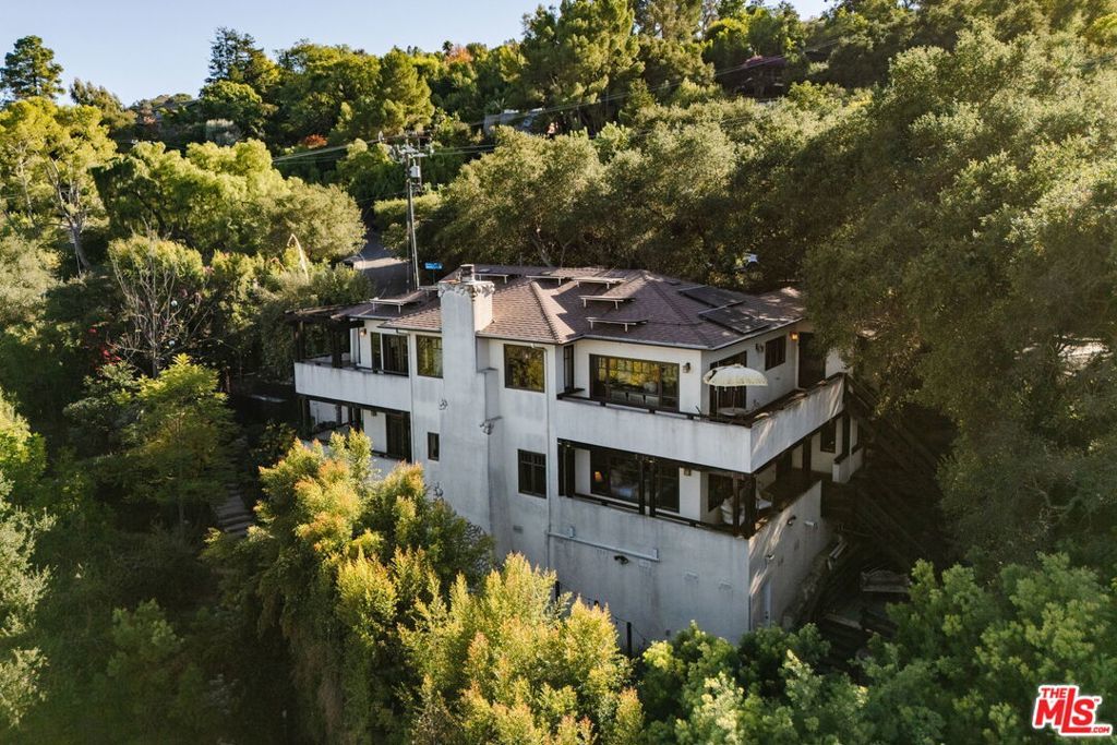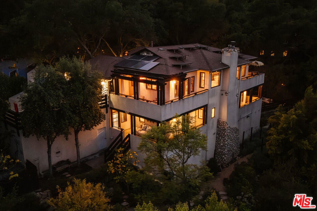 Romance in the Mountains. Perched among ancient oaks in upper Fernwood, just a mile from Topanga's village center, this timeless Arts & Crafts home rises like a handcrafted treehouse, embracing the canyon's rhythm and light. Framed in wood, stone, and glass, it captures cinematic cross-canyon vistas that shift with the day's mood. Morning mist drifts across the ridgelines, sunlight spills under beamed ceilings, and the scent of pine, lavender, and rosemary fills the air. Terraced gardens, alive with fruit trees and flowers, weave through decomposed granite paths that recall the landscapes of southern Europe. A handmade gate and wooden bridge lead to the welcoming front porch, setting the tone for the comfort and artistry within. The living and dining rooms share a glowing Batchelder-tiled fireplace, the heart of the home, where French doors and wide windows erase the line between indoors and out. Venetian plaster walls, custom lighting, and soaring beamed ceilings create warmth and grandeur, while fine woodwork and inlaid hardwood floors showcase the mark of the maker. The gourmet kitchen, fitted with Viking appliances and granite countertops, opens to a view-filled den and one of several decks. A cozy main-level office with its own balcony offers a private escape framed by canyon light. Downstairs, the romantic primary suite feels like a retreat in the treetops, with French doors opening to a secluded deck above the canyon. The luxurious bath, wrapped in windows, invites long soaks beside the garden's quiet hum. Two additional bedrooms, one with a wraparound deck, share a bright bath, while a large media room with built-in screen and surround sound doubles as a screening lounge, studio, or gym. Outside, nature flourishes. Pomegranates, blood oranges, lemons, grapes, and fragrant herbs fill the terraced gardens carved among boulders. The fenced backyard offers privacy for play, gardening, or quiet reflection. A gazebo and hidden nooks invite gatherings or moments of solitude beneath the oaks. A new roof, solar with two Tesla batteries, and thoughtful updates bring sustainability to this handcrafted haven. With a two-car garage, large driveway, generous storage, and deep caissons anchoring the home to the canyon's bedrock, comfort and stability abound. Here in Fernwood's coveted microclimate, cool coastal breezes meet warm canyon sun, a perfect balance of energy and ease. Every window reveals beauty: the sweep of Topanga State Park, the dance of light through leaves, the gentle contours of the surrounding hills. Trails, beaches, cafes, and galleries are moments away, while the valley, westside, and city remain within easy reach. More than a home, this is a place of quiet grandeur and creative soul, a handcrafted refuge where nature and design live in timeless harmony, and every day feels like a page in a story still unfolding.