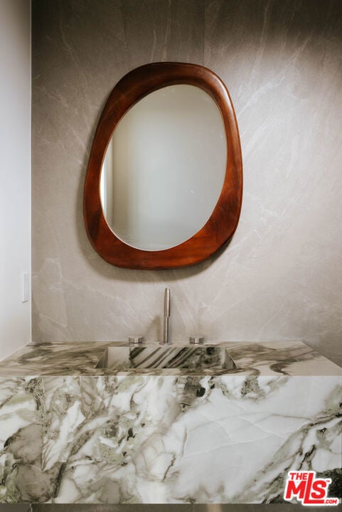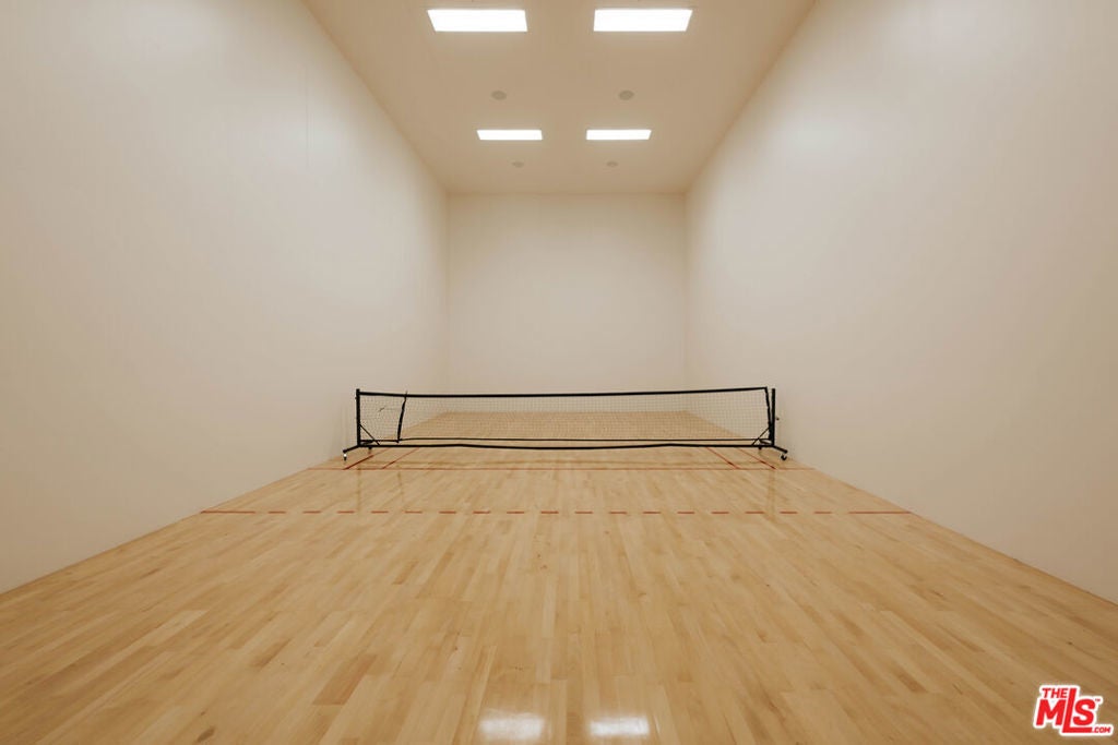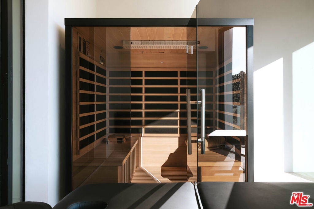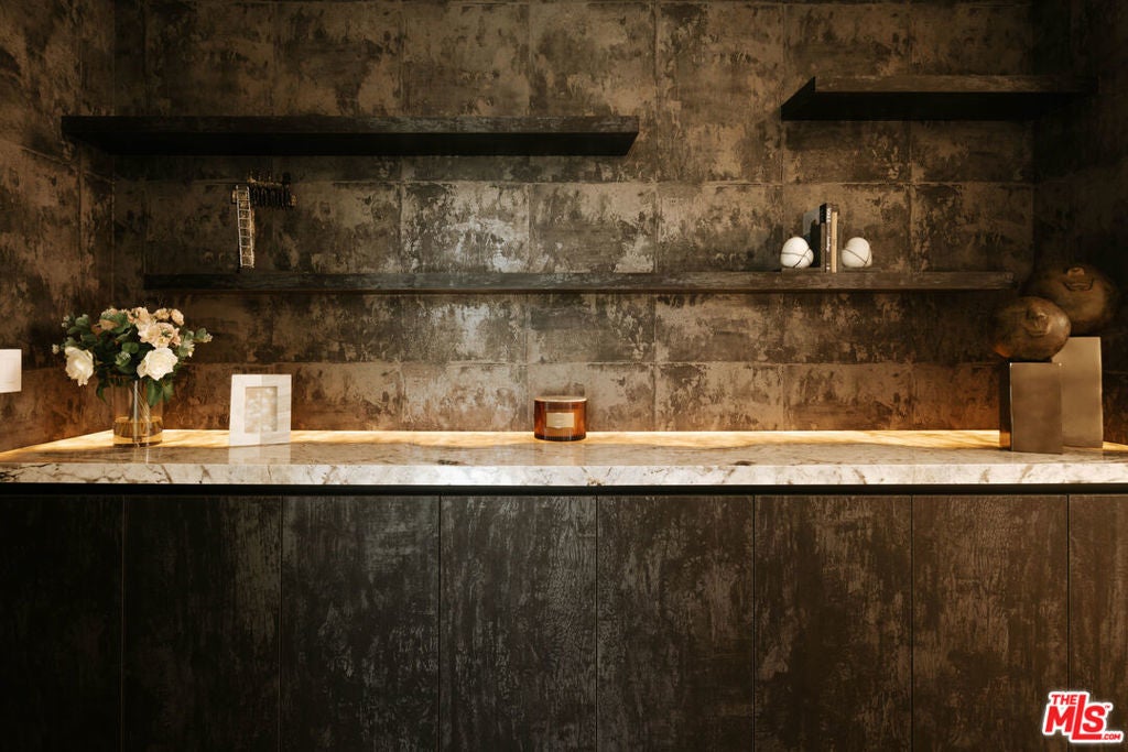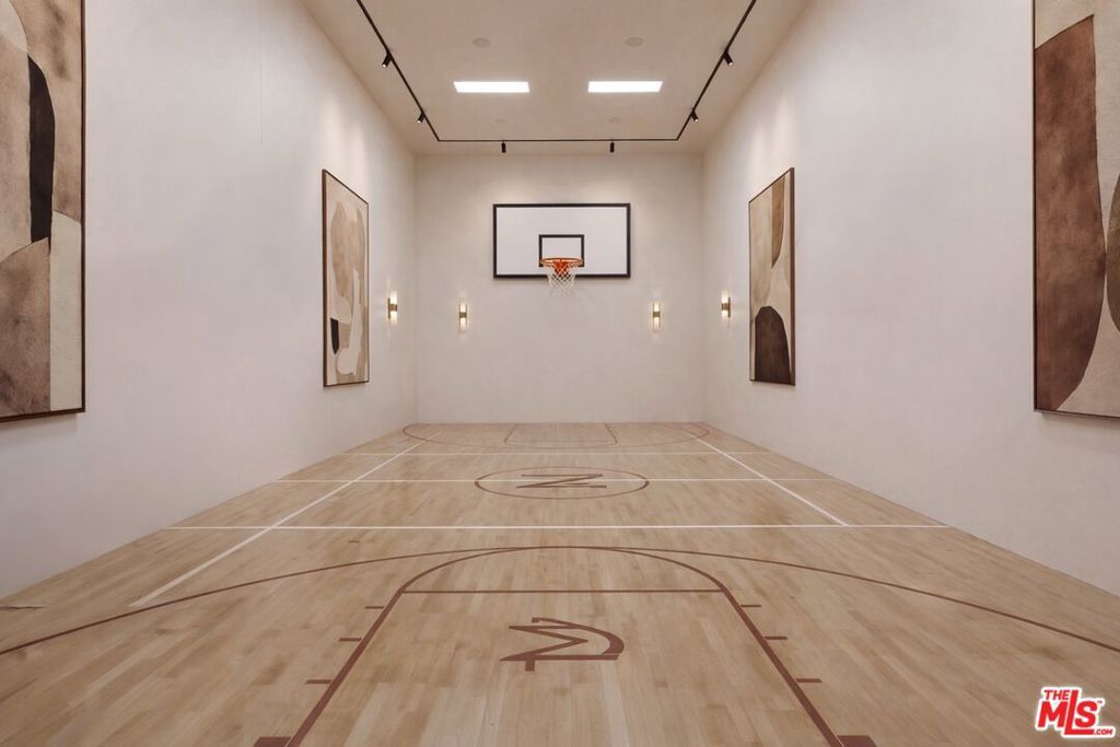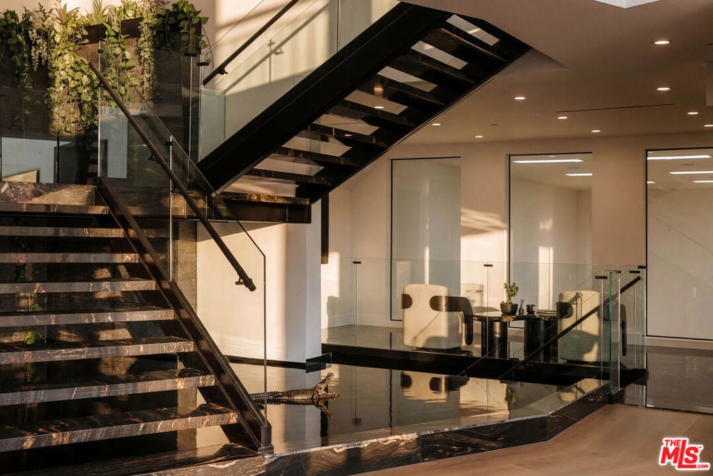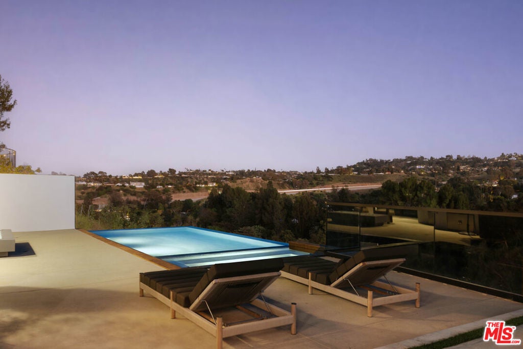 Welcome to a truly exceptional estate in the prestigious Royal Oaks enclave of Encino, where elevated design, breathtaking views, and modern luxury come together seamlessly. Meticulously curated materials and finishes are showcased throughout this five bedroom plus an office, nine bathroom residence. Upon entry, soaring ceilings, expansive walls of glass, and a light-filled open layout create a seamless connection to the surrounding landscape. A striking titanium gold staircase with an integrated water feature serves as a sculptural centerpiece, setting the tone for the level of design and detail carried throughout. The formal dining room is complemented by a temperature-controlled wine cellar, while a nearby powder room is finished in Brazilian green marble, adding a refined touch. The culinary experience is elevated through a dual-kitchen concept. The main kitchen showcases a fluted natural stone island and white onyx countertops paired with custom German cabinetry, finished with aluminum and leather accents. A secondary kitchen provides additional functionality, ideal for both everyday living and entertaining. The primary suite serves as a private sanctuary, capturing stunning views and offering a spa-inspired bathroom with bookmatched stone. Designed for both wellness and entertainment, the home features an indoor sports court ideal for racquetball or basketball, a game room, and a fully equipped fitness area with a red light sauna and cold plunge. A private theater and expansive entertainment level with a custom bar finished in agate blue stone create the perfect setting for hosting, seamlessly opening to outdoor living spaces. The outdoor setting features an infinity edge pool, and a rooftop deck, all designed to enhance the overall sense of luxury and relaxation. This new construction estate offers a rare combination of scale, design, and lifestyle in one of Encino's most sought-after neighborhoods.Additional features include a five car garage with high ceilings, elevator, and Control4 smart home automation system.This is a rare opportunity to own a statement property where design, views, and lifestyle converge at the highest level.