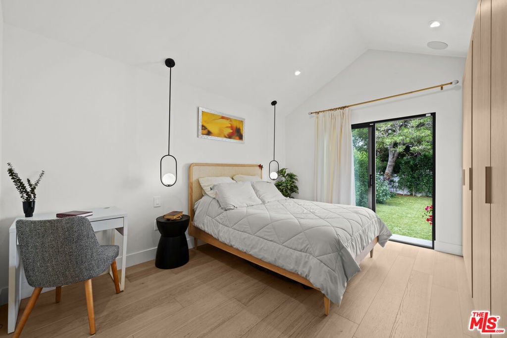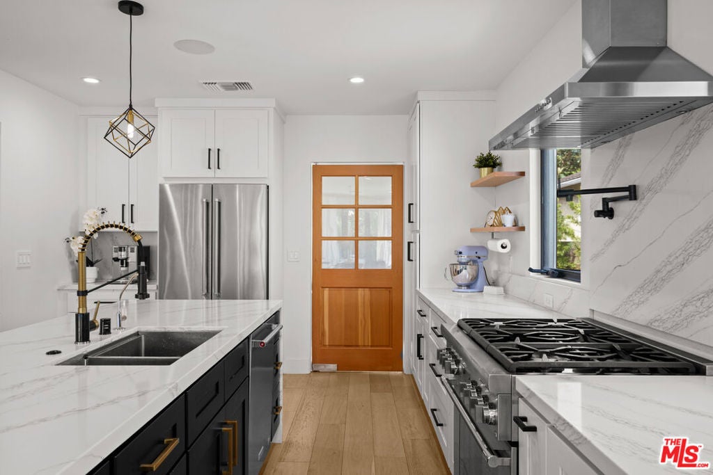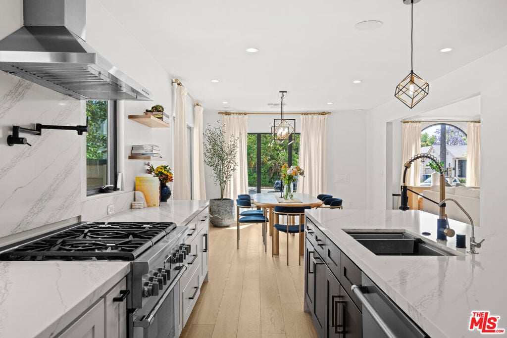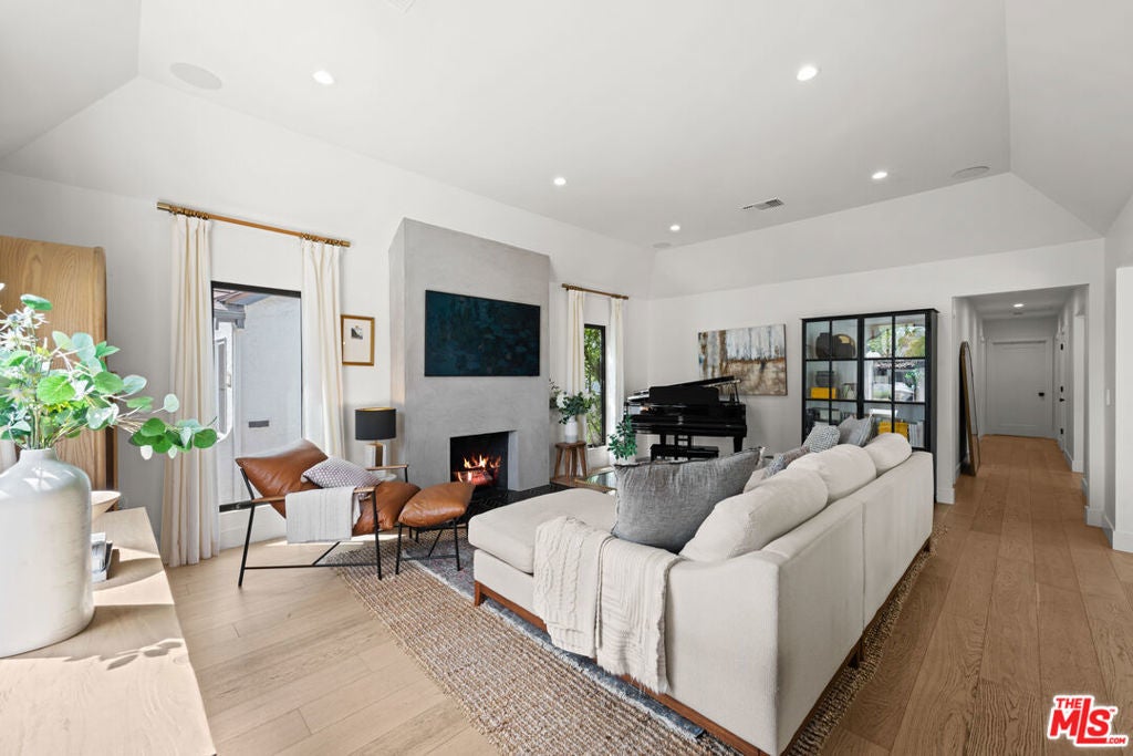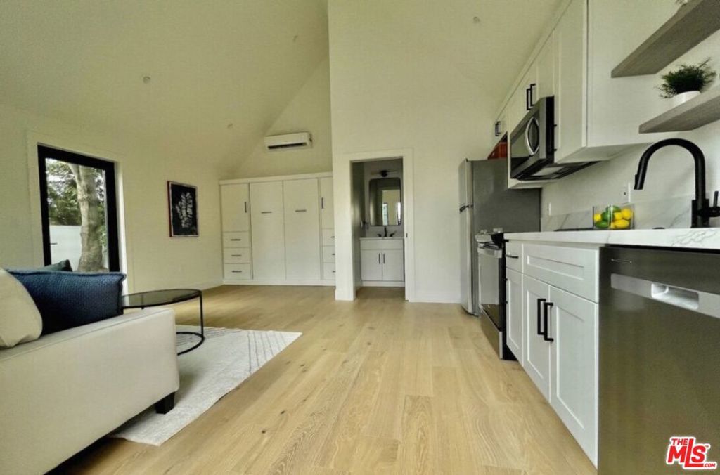 This stunning, fully remodeled residence with a permitted ADU has been reimagined from the studs up, with over $400,000 in thoughtful updates in 2023. Designed for modern living, the open-concept floor plan blends comfort and style with soaring 10-foot ceilings, rich engineered European oak floors, and a cozy wood-burning smooth stucco fireplace. The heart of the home is the chef's kitchen, complete with a striking 9-foot island with waterfall quartz counters, floating white oak shelves, coffee station, and abundant pantry space, perfect for both entertaining and everyday living. A light-filled laundry room with side-by-side machines adds convenience just off the kitchen. The private wing features three spacious bedrooms, including a gorgeous primary suite with vaulted ceilings, backyard access, walk-in closet, and a spa-like bath with freestanding tub, double vanity, heated marble floors, and a walk-in shower. The secondary bath offers timeless subway tile and marble finishes. Step outside to beautifully landscaped front and back yards, featuring new hardscape, lush privacy hedges, artificial turf, smart irrigation, and plenty of room to host family and friends. The permitted ADU is equally impressive, with high vaulted ceilings, plentiful storage space above the bathroom, a full kitchen, bathroom, Murphy bed, and its own HVAC, ideal for guests, extended family, or rental income. Additional upgrades ensure peace of mind: new roof, updated electrical, copper plumbing, new sewer lines, Milgard double-pane windows, redwood fencing, concrete driveway, Ring security system, in-ceiling Klipsch speakers, Cat6 wiring, and a prewired EV charger. Every detail has been carefully considered-inside and out. Don't miss this rare opportunity to own a home that truly has it all. Centrally located close to UCLA, Westfield Century City, shops, dining, Westwood Charter Elementary School. Schedule your private showing today