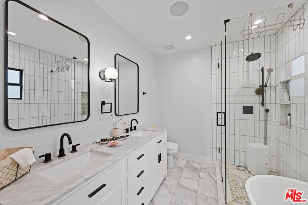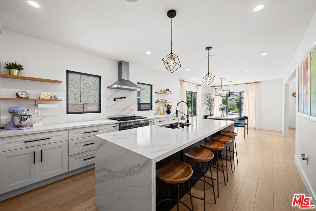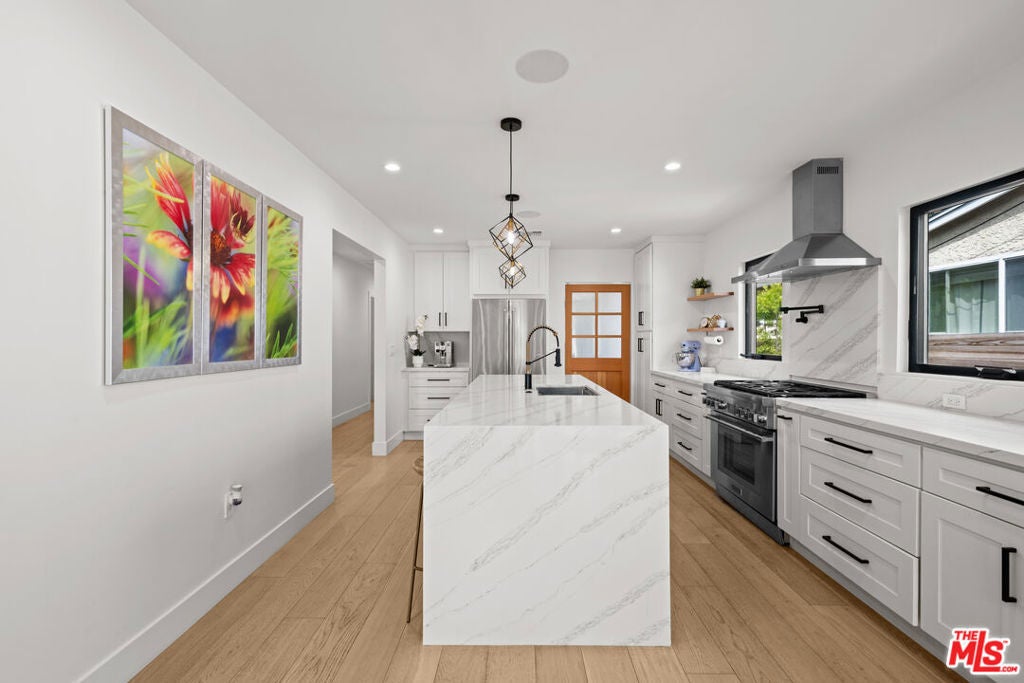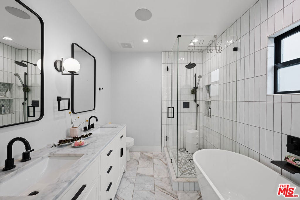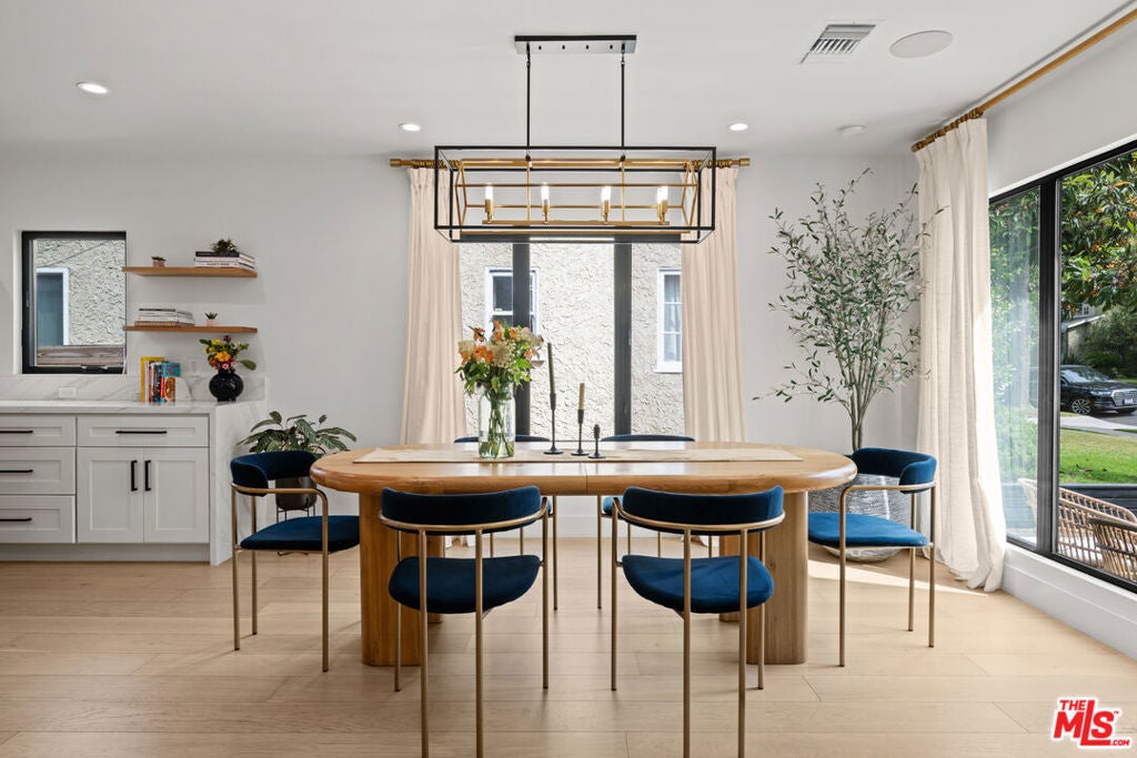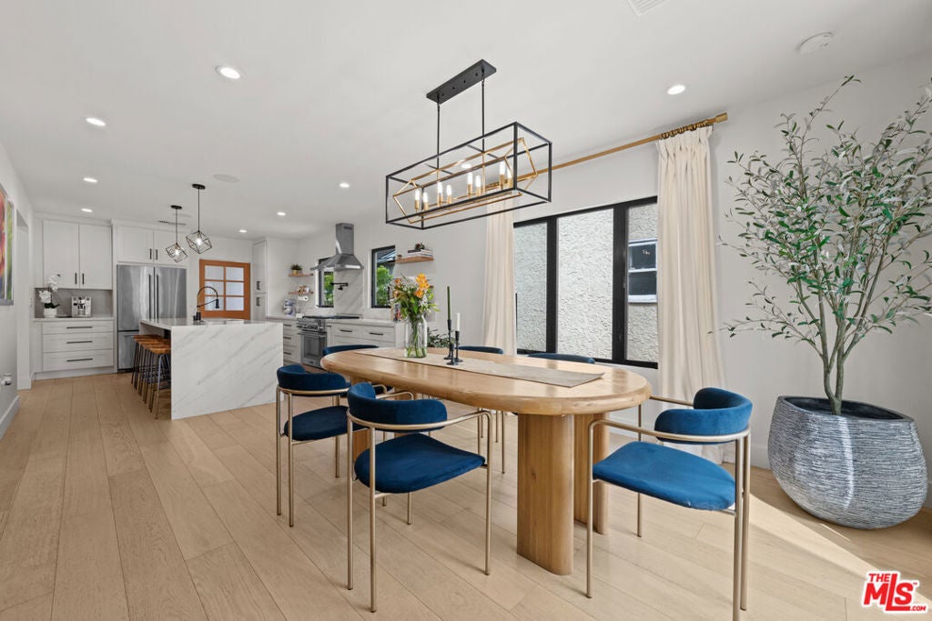 This stunning, fully remodeled residence with a permitted ADU has been reimagined from the studs up, with over $400,000 in thoughtful updates in 2023. Designed for modern living, the open-concept floor plan blends comfort and style with soaring 10-foot ceilings, rich engineered European oak floors, and a cozy wood-burning smooth stucco fireplace. The heart of the home is the chef's kitchen, complete with a striking 9-foot island with waterfall quartz counters, floating white oak shelves, coffee station, and abundant pantry space, perfect for both entertaining and everyday living. A light-filled laundry room with side-by-side machines adds convenience just off the kitchen. The private wing features three spacious bedrooms, including a gorgeous primary suite with vaulted ceilings, backyard access, walk-in closet, and a spa-like bath with freestanding tub, double vanity, heated marble floors, and a walk-in shower. The secondary bath offers timeless subway tile and marble finishes. Step outside to beautifully landscaped front and back yards, featuring new hardscape, lush privacy hedges, artificial turf, smart irrigation, and plenty of room to host family and friends. The permitted ADU is equally impressive, with high vaulted ceilings, plentiful storage space above the bathroom, a full kitchen, bathroom, Murphy bed, and its own HVAC, ideal for guests, extended family, or rental income. Additional upgrades ensure peace of mind: new roof, updated electrical, copper plumbing, new sewer lines, Milgard double-pane windows, redwood fencing, concrete driveway, Ring security system, in-ceiling Klipsch speakers, Cat6 wiring, and a prewired EV charger. Every detail has been carefully considered-inside and out. Don't miss this rare opportunity to own a home that truly has it all. Centrally located close to UCLA, Westfield Century City, shops, dining, Westwood Charter Elementary School. Schedule your private showing today