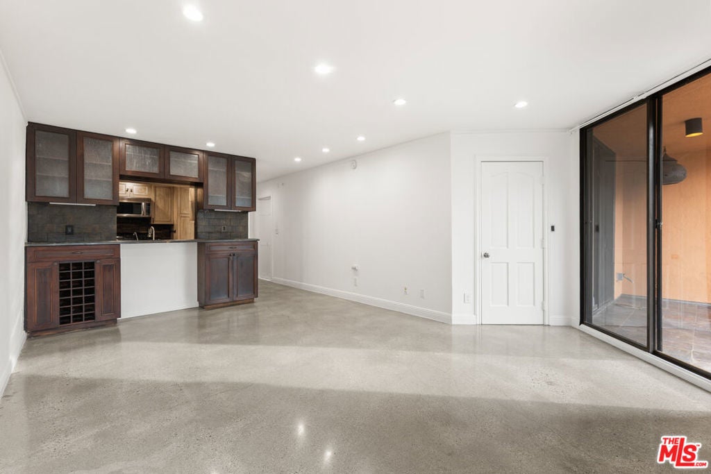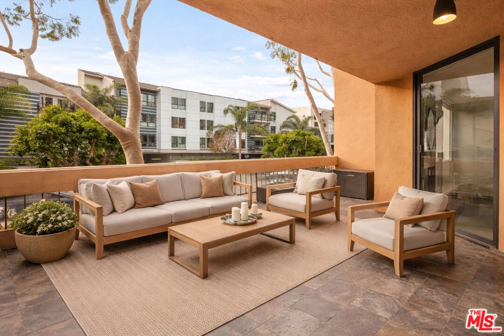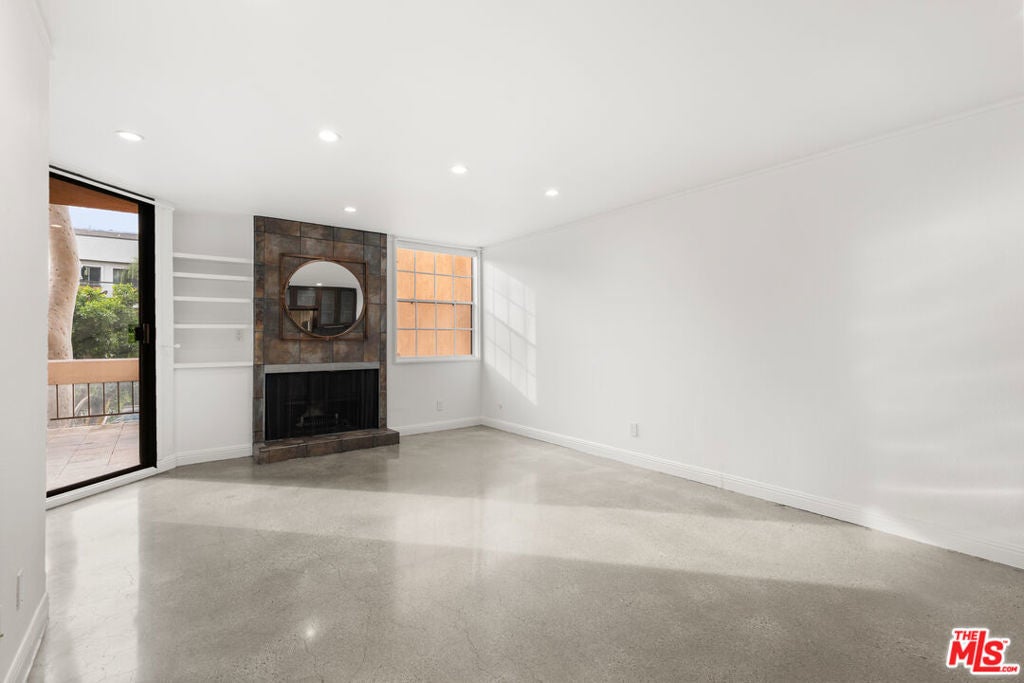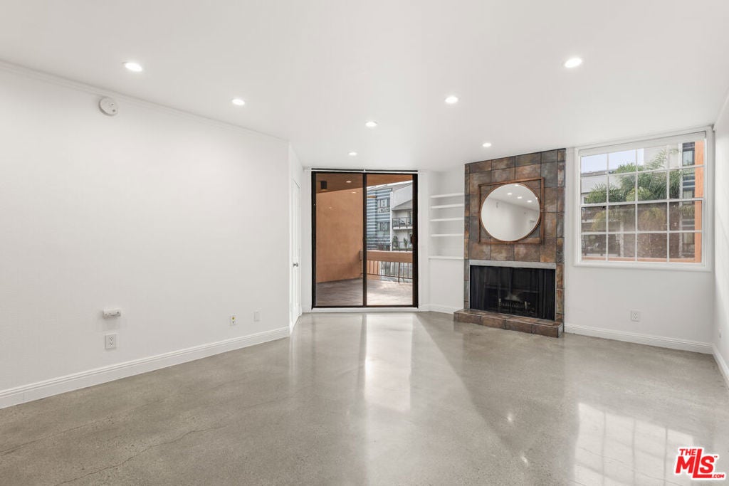 Welcome to effortless city living in this beautifully updated one-bedroom, one-bath residence, where modern design meets everyday comfort. Sleek concrete floors create a clean, contemporary foundation, while the thoughtfully designed kitchen - complete with stone countertops and stylish tile flooring - offers both functionality and a refined aesthetic. The bedroom serves as a peaceful retreat, opening directly to an expansive private balcony that fills the space with natural light. Perfect for morning coffee or evening unwinding, the balcony easily accommodates a BBQ and lounge seating for relaxed indoor-outdoor living. Generous closet space and additional linen storage enhance the home's everyday ease. The spa-inspired bathroom offers a calming escape, featuring an oversized jetted tub, stone shower, and stone flooring - ideal for slowing down at the end of the day. Residents also enjoy access to a shared upstairs sun deck, an inviting setting to relax, entertain, and take in sweeping city views. Thoughtfully designed and quietly sophisticated, this home offers a seamless blend of comfort and elevated urban living. Please note: The final three images are digitally staged and do not represent current furnishings. The fireplace is decorative only and not operational.