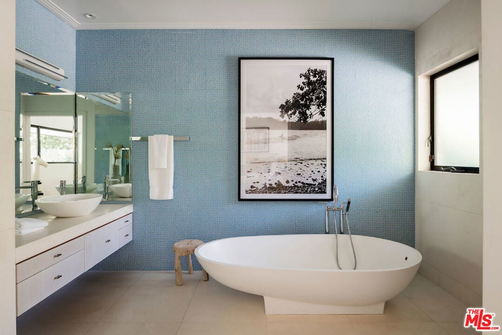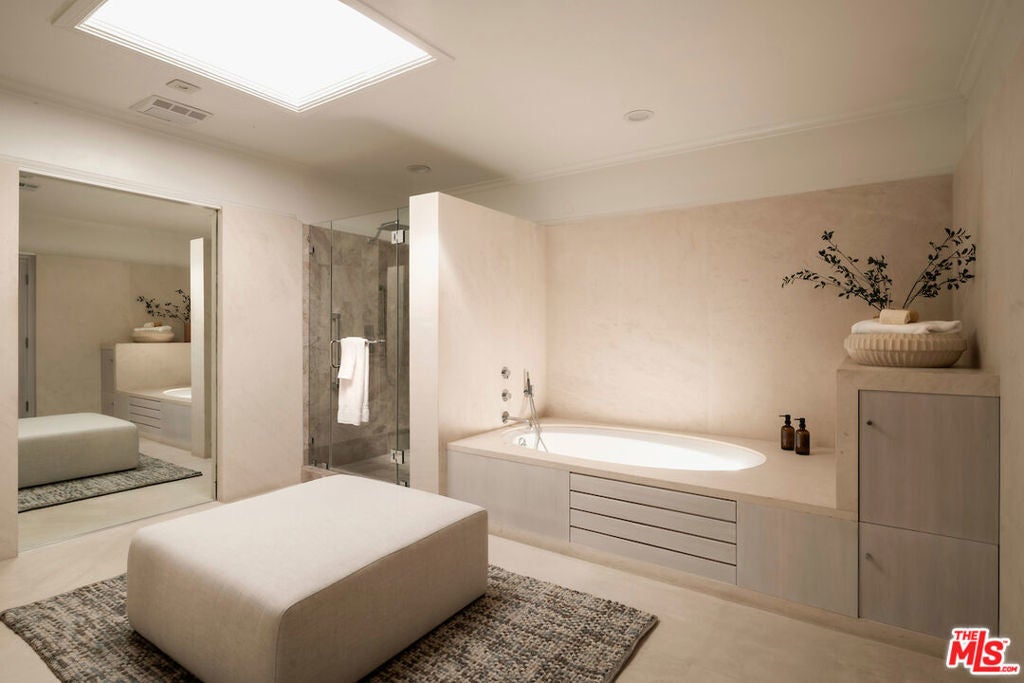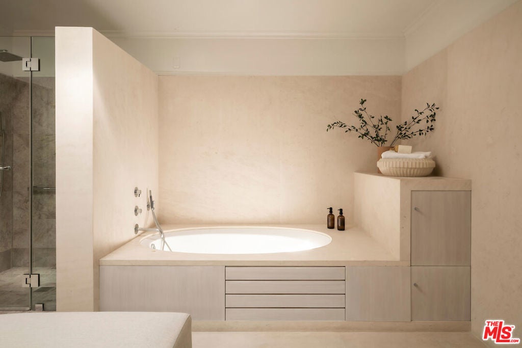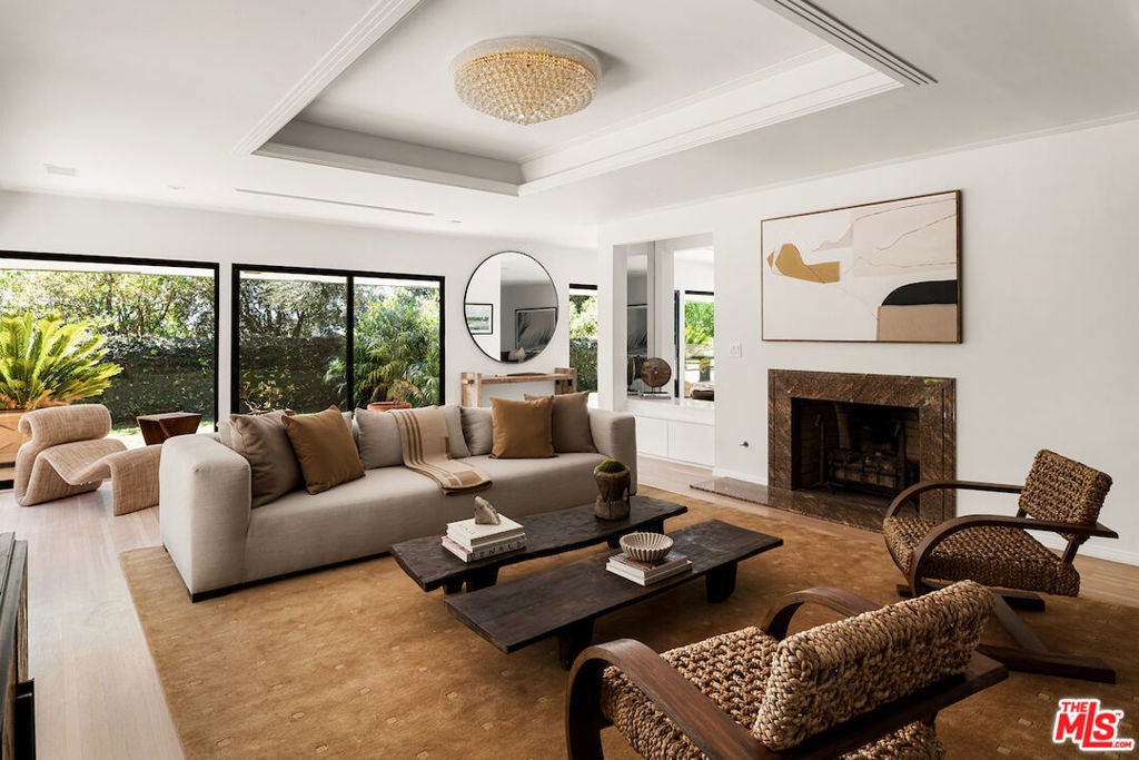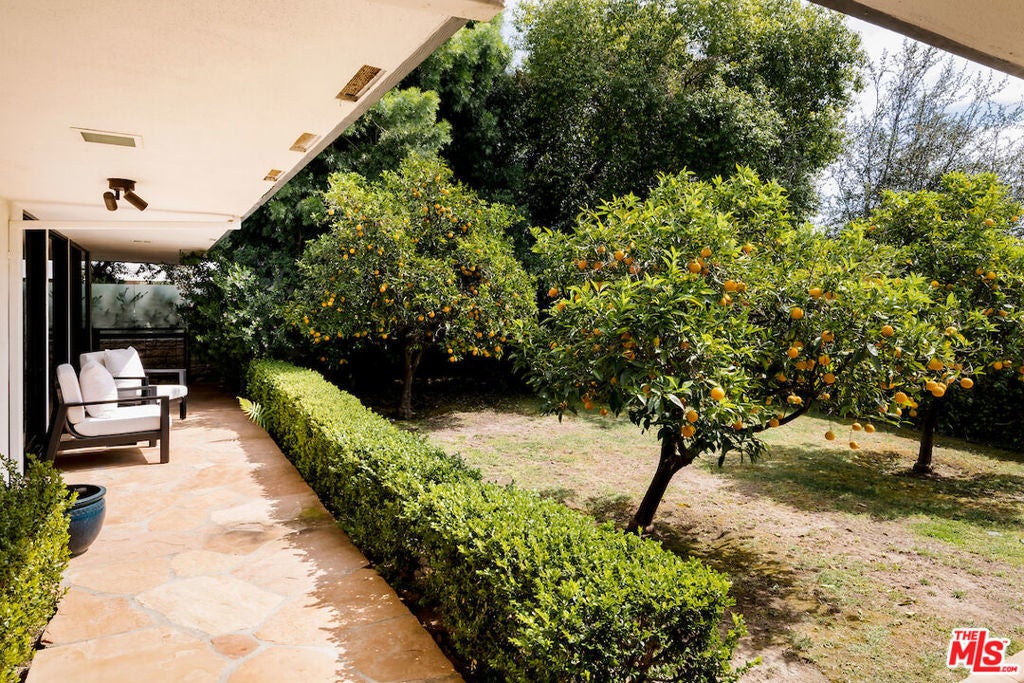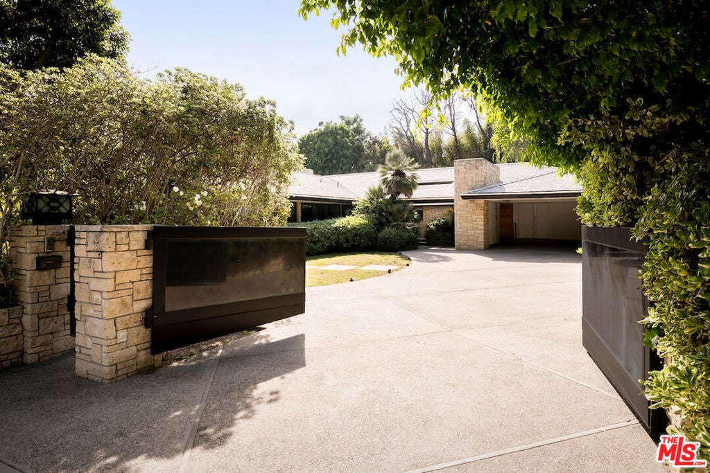 Situated in the coveted lower Trousdale Estates of Beverly Hills, this gated Mid-Century residence offers single-level living on a sprawling 21,600-square-foot lot. Clean architectural lines and a refined, open layout define the interiors, offering a seamless blend of classic design and modern livability. A formal entry unfolds into a refined composition of living spaces, including a formal living room with fireplace, an intimate den with a second fireplace, and a formal dining room, each framed by walls of floor-to-ceiling glass and sliding doors that bathe the interiors in natural light while seamlessly dissolving the boundary between indoors and out. The newly updated kitchen is both functional and striking, featuring dual islands, top-tier appliances, and a substantial walk-in pantry. A private office is thoughtfully integrated into the layout. The main residence comprises four bedrooms, anchored by an expansive primary suite offering dual walk-in closets and a spa-caliber en-suite bath appointed with a soaking tub, separate shower, and a generously scaled vanity. A detached approximately 950-square-foot guest house with one bedroom and one bathroom provides a private and well-appointed retreat for guests. The grounds evoke a tranquil, resort-like setting, enveloped by mature landscaping and dotted with abundant citrus trees that enhance both privacy and ambiance. A large pool with a diving board serves as the focal point of the outdoor experience, complemented by a covered patio with fireplace and a fully equipped outdoor kitchen designed for effortless al fresco living and entertaining. Subtle peek-a-boo city views complete the offering. A rare opportunity to own a timeless Mid-Century residence in one of Beverly Hills' most prestigious enclaves, moments from the city's finest dining, shopping, and entertainment.