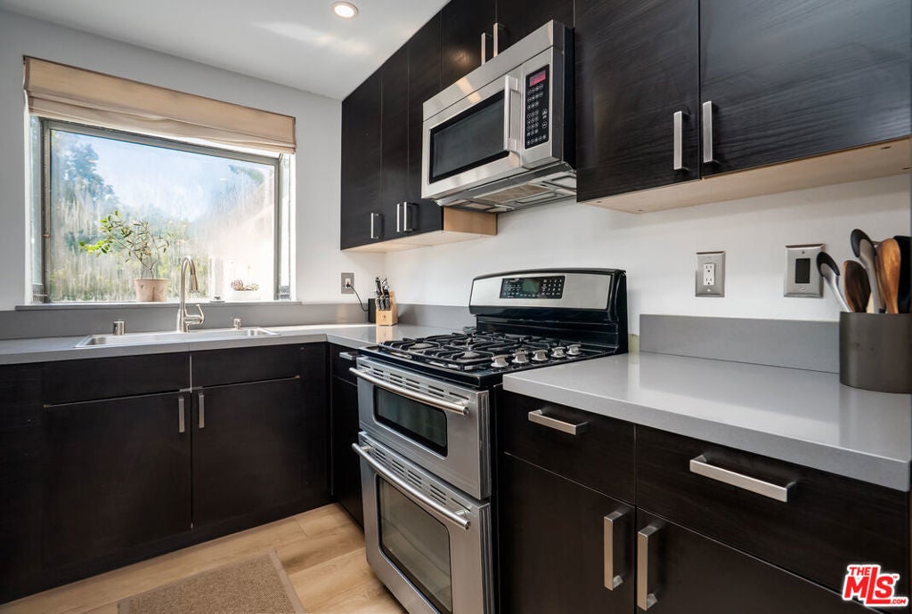 Welcome to this light-filled, inviting corner townhome nestled in the highly sought-after Malibu Canyon Villas community in Calabasas. Thoughtfully updated with new floors and paint throughout, this home effortlessly blends comfort, style, and convenience. Vaulted ceilings and abundant natural light create an airy, open feel throughout the main living space. The upper level features a warm and welcoming living room with fireplace, flowing seamlessly into the dining area perfect for both everyday living and entertaining. The beautifully upgraded galley kitchen is a standout, showcasing quartz countertops, stainless steel appliances, a farmhouse sink, and rich dark wood cabinetry. A charming bay window offers the perfect spot for an herb garden while bringing in soft natural light. Step outside to a private patio ideal for morning coffee or unwinding at the end of the day. The spacious primary suite features a large custom closet and an updated bathroom with a newly remodeled shower and modern vanity. A versatile secondary bedroom offers a generous closet and can easily function as a home office or guest room. The guest bathroom has a newly remodeled shower, and additional hallway storage adds to the home's functionality. Downstairs, you'll find a dedicated laundry room with extra storage and direct access to a two-car garage. Ample guest parking adds everyday convenience. Residents enjoy resort-style amenities including two sparkling pools, a spa, and a BBQ area. Ideally located within the award-winning Las Virgenes Unified School District and A.E. Wright Middle School. Just minutes from scenic hiking trails, close proximity to Malibu's best beaches and convenient access to the 101 freeway. This location offers the best of both nature and lifestyle. A newly added trail along the creek behind the community enhances the serene setting. This is a rare opportunity to own a stylish, turnkey home in one of Calabasas' most desirable communities