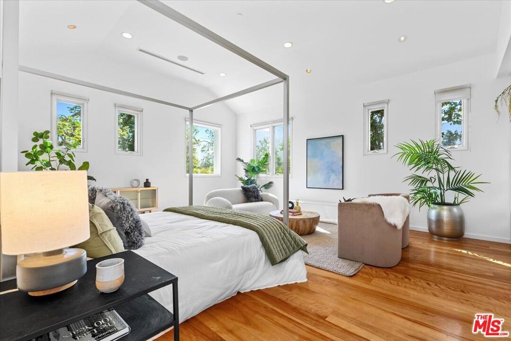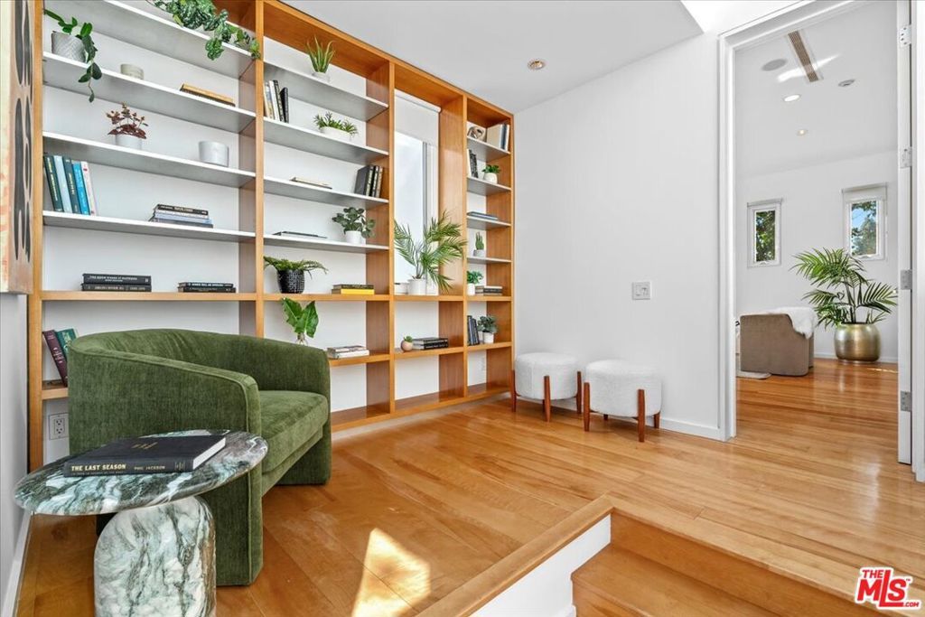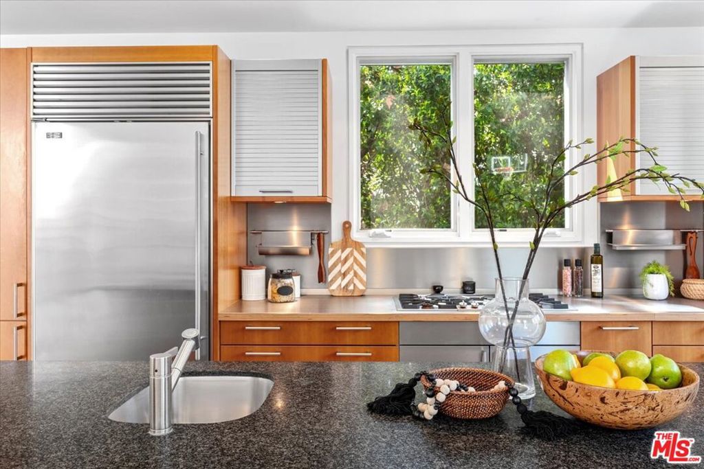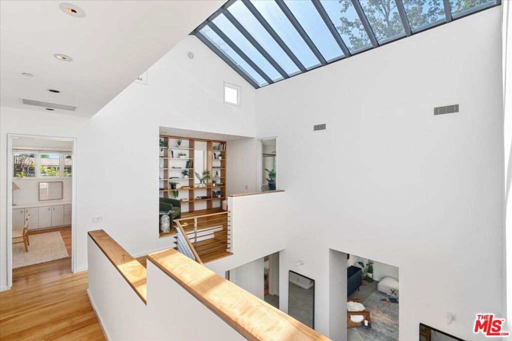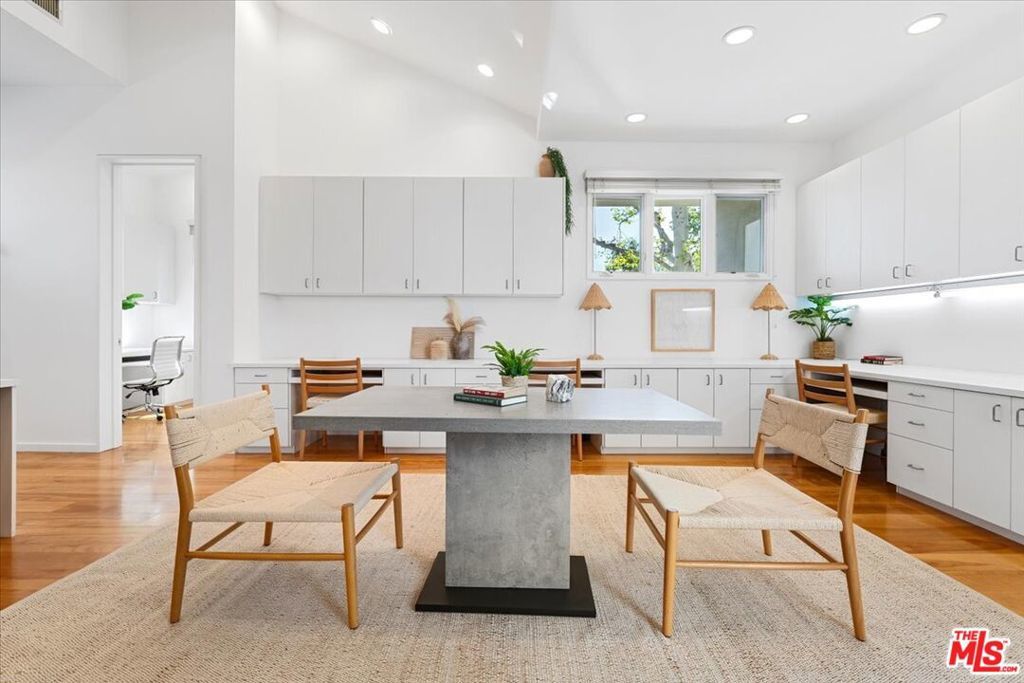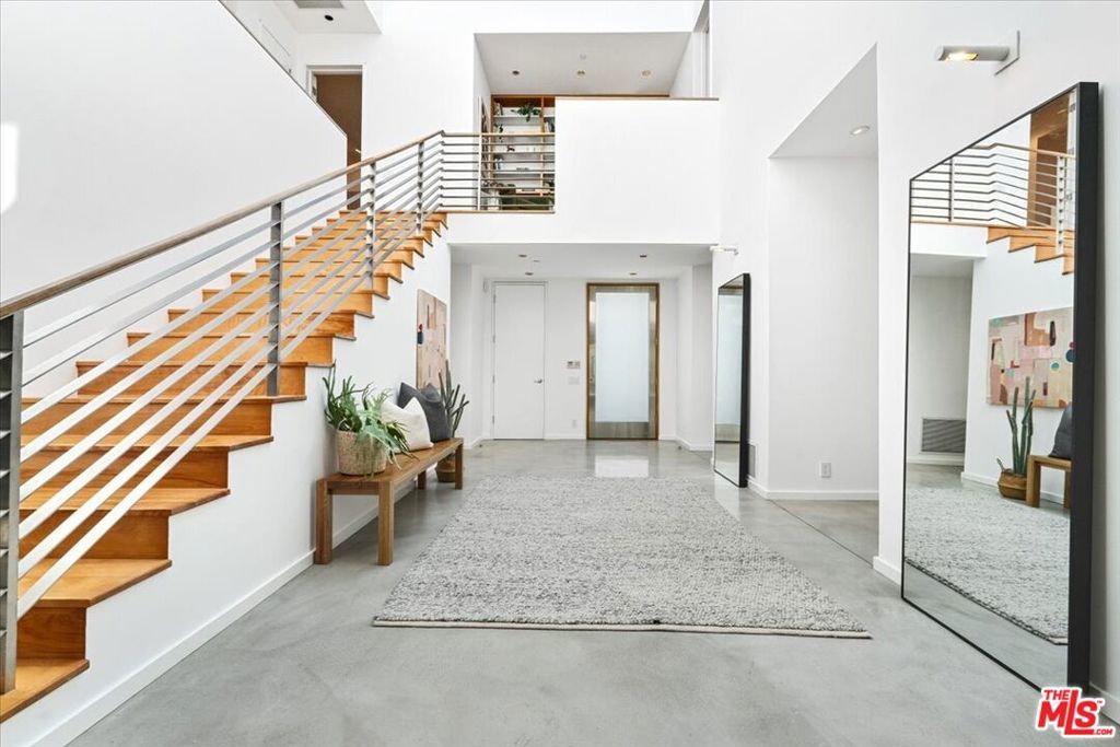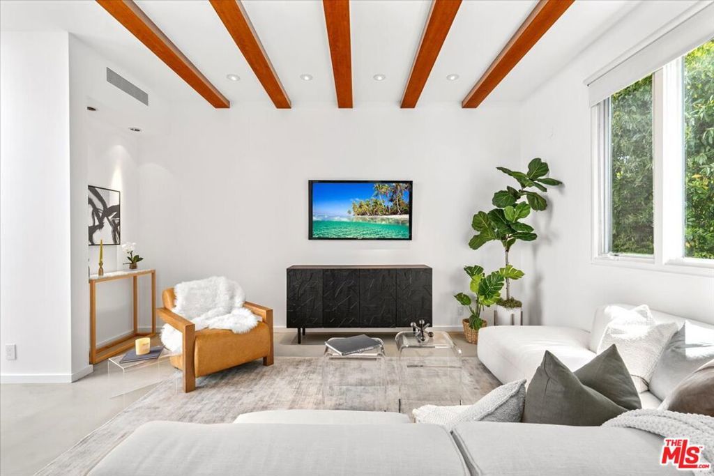 Tucked into one of the most sought-after streets in the Toluca Lake/Burbank pocket, this architectural home sits within a tightly held enclave of just 23 residences, a location that rarely comes available and is well known locally for its privacy and feel. The home pairs clean, modern design with warmth and livability, using materials like glazed concrete, birch, and cherry wood to create a refined, grounded aesthetic throughout. A two-story atrium and expansive skylights bring in natural light, enhancing the open main level that connects the living, dining, and kitchen spaces. The kitchen features Bulthaup cabinetry, Miele and Sub-Zero appliances, granite countertops, and custom wood finishes. Large sliding doors open to a private backyard designed for both everyday use and entertaining, with a pool, spa, firepit, and mature palms creating a true indoor-outdoor flow. The first floor also includes a powder room, a guest suite with its own patio, and a flexible bonus space ideal for a media room, gym, or office. Upstairs, the primary suite offers high ceilings, dual walk-in closets, and a well-appointed bath. A separate office suite with its own workspace and balcony adds flexibility, along with three additional bedrooms and a tucked-away reading nook. Located near the studios and the shops and restaurants in the Village of Toluca Lake along Riverside Drive, with easy access to the 134, 101, and 5, this home offers a rare combination of privacy, design, and convenience.