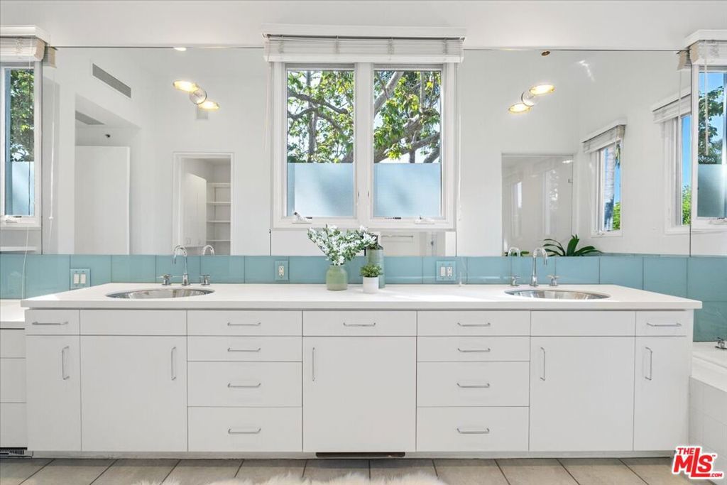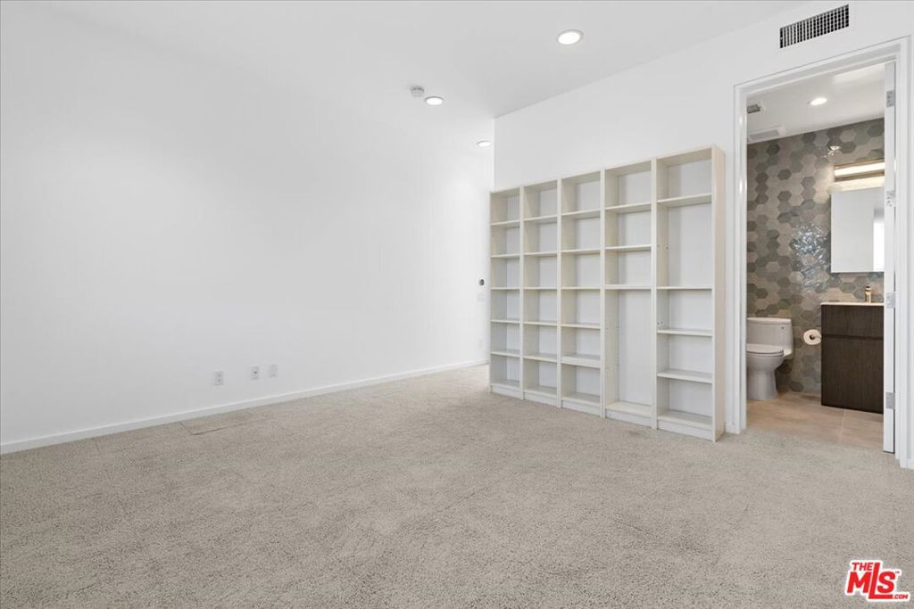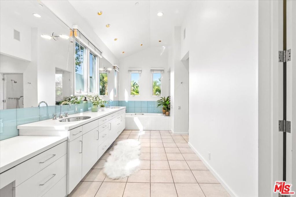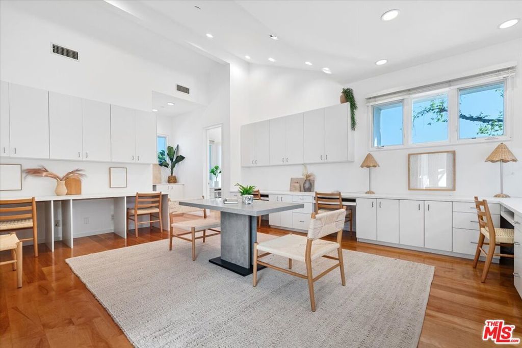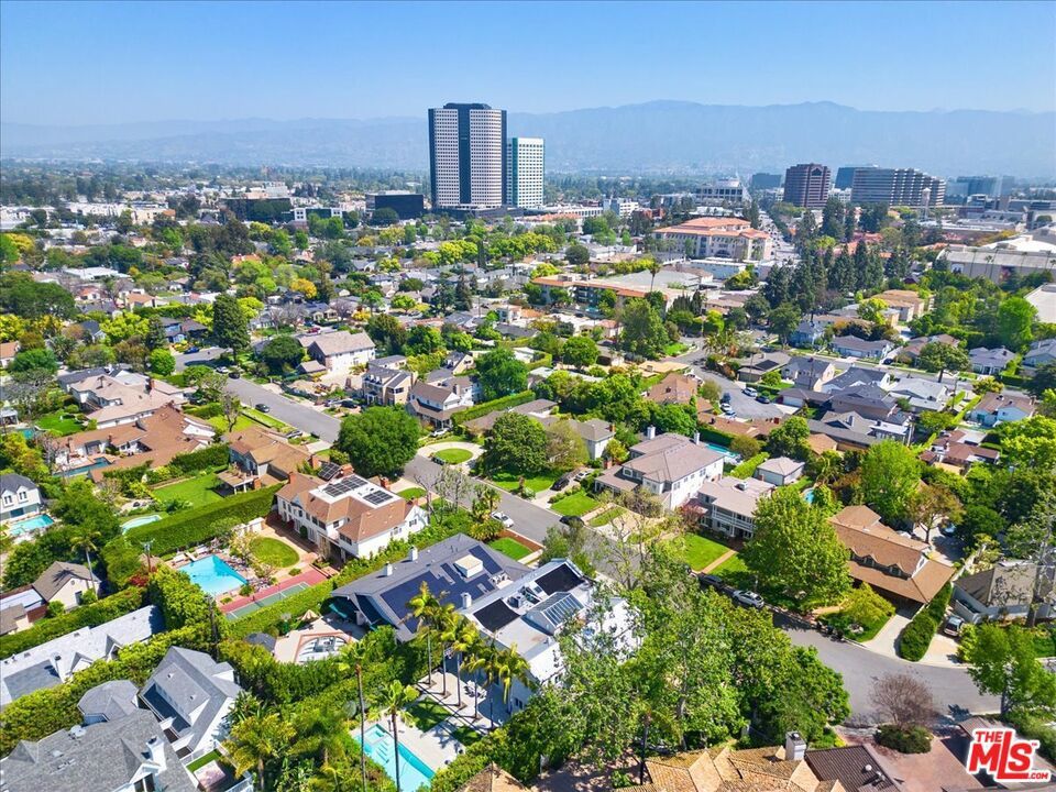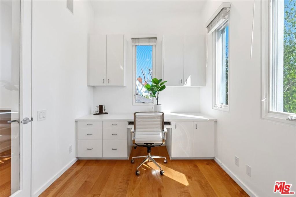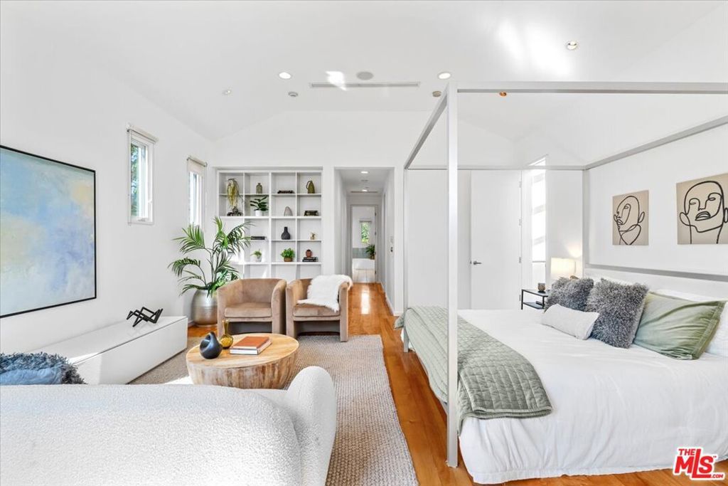 Tucked into one of the most sought-after streets in the Toluca Lake/Burbank pocket, this architectural home sits within a tightly held enclave of just 23 residences, a location that rarely comes available and is well known locally for its privacy and feel. The home pairs clean, modern design with warmth and livability, using materials like glazed concrete, birch, and cherry wood to create a refined, grounded aesthetic throughout. A two-story atrium and expansive skylights bring in natural light, enhancing the open main level that connects the living, dining, and kitchen spaces. The kitchen features Bulthaup cabinetry, Miele and Sub-Zero appliances, granite countertops, and custom wood finishes. Large sliding doors open to a private backyard designed for both everyday use and entertaining, with a pool, spa, firepit, and mature palms creating a true indoor-outdoor flow. The first floor also includes a powder room, a guest suite with its own patio, and a flexible bonus space ideal for a media room, gym, or office. Upstairs, the primary suite offers high ceilings, dual walk-in closets, and a well-appointed bath. A separate office suite with its own workspace and balcony adds flexibility, along with three additional bedrooms and a tucked-away reading nook. Located near the studios and the shops and restaurants in the Village of Toluca Lake along Riverside Drive, with easy access to the 134, 101, and 5, this home offers a rare combination of privacy, design, and convenience.
