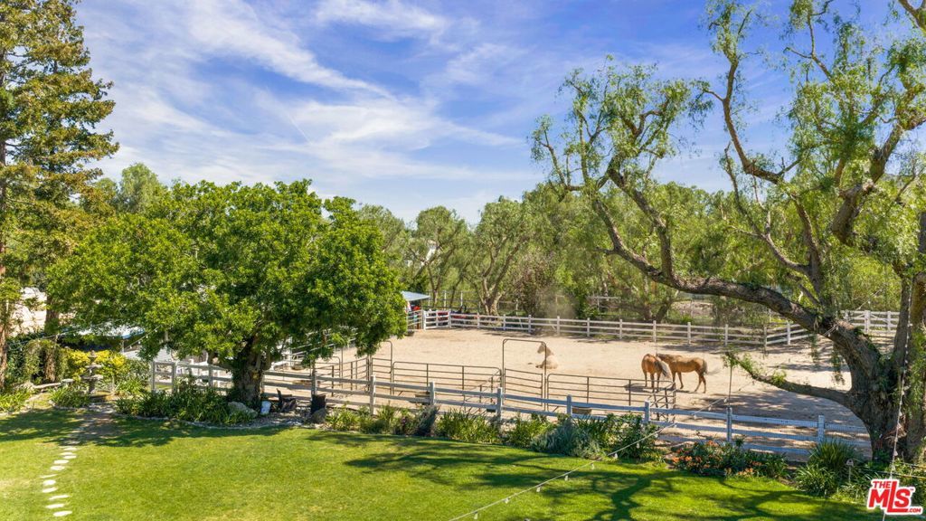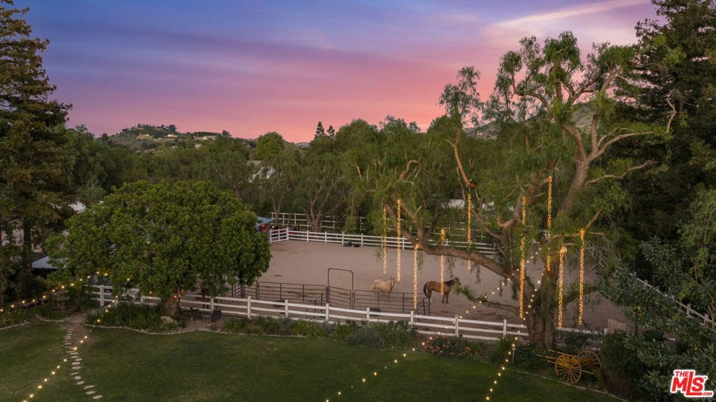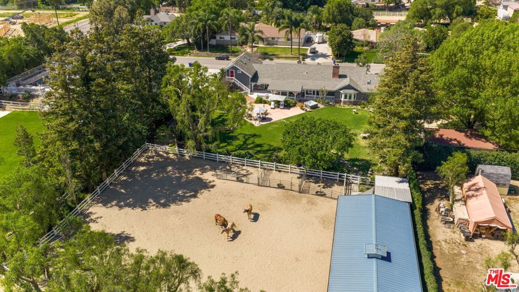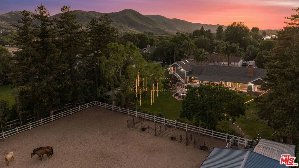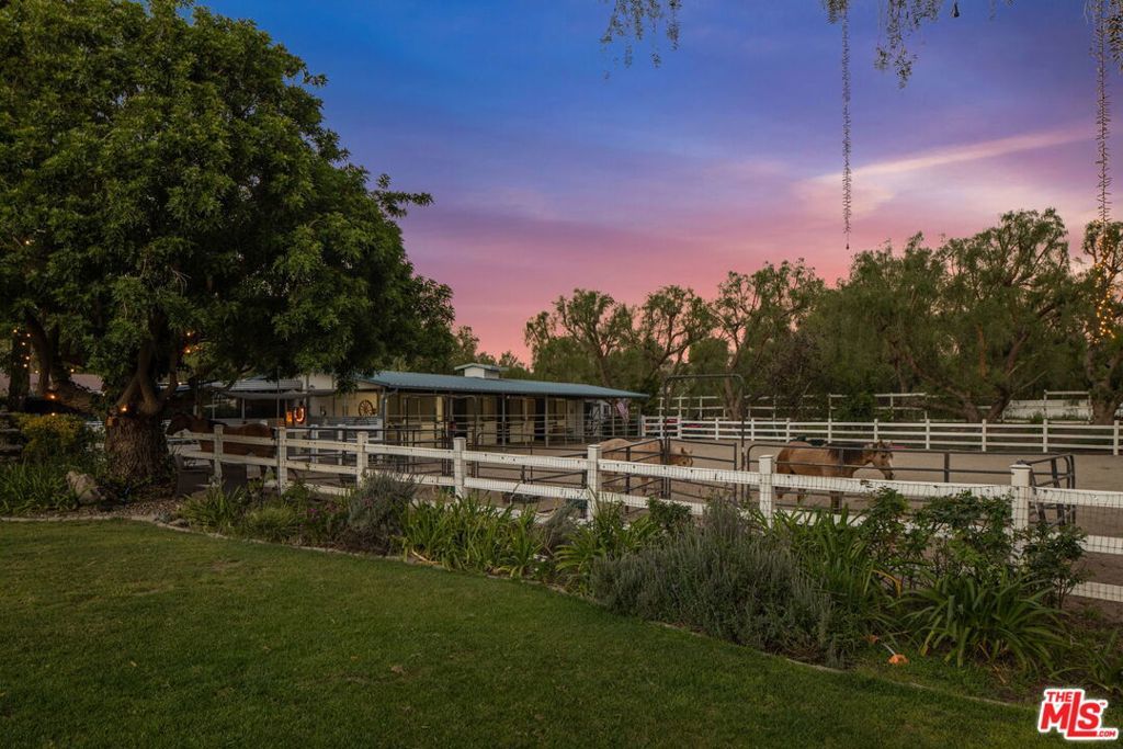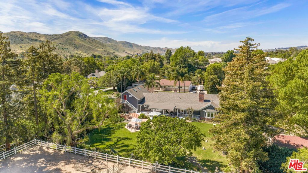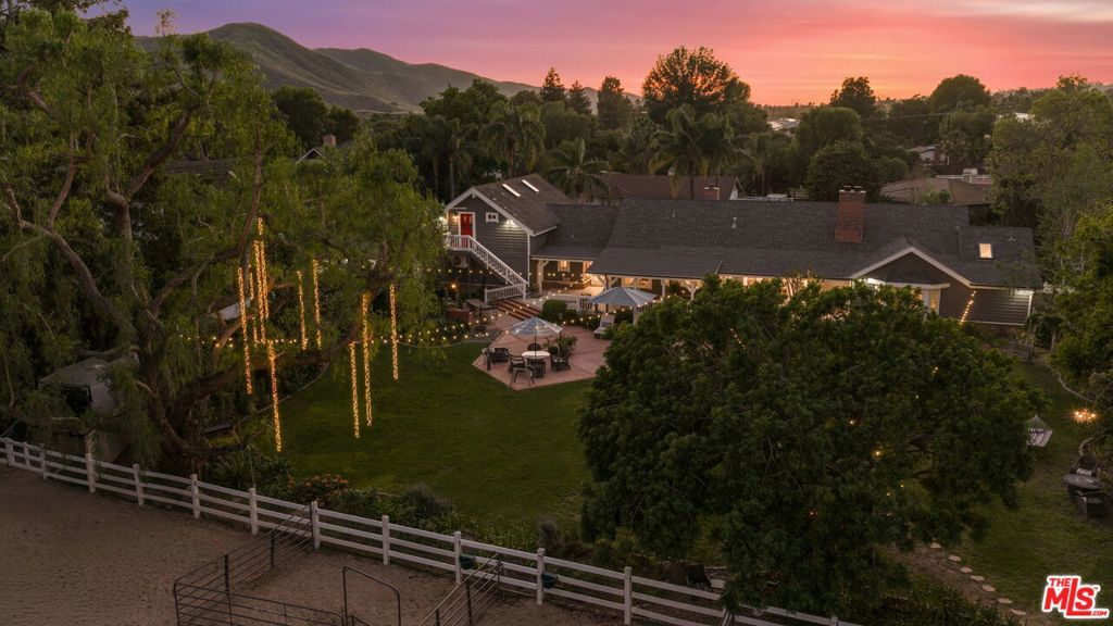 Turnkey Exceptional Equestrian Ride-Out Ranch with Direct Trail Access. Coveted equestrian property with direct riding trail access in the highly sought-after and exclusive community of Santa Rosa Valley. This rare offering is set on over one flat, usable, fully fenced and gated acre, showcasing pride of ownership throughout. The private ranch-style property offers rear gated access directly onto Santa Rosa Valley's extensive riding trail system, allowing you to saddle up and ride straight from your own property-no trailering required. This is true California ranch living at its finest. Designed for a horse-ready lifestyle, the property features equestrian facilities including a large, fenced sand arena, four-stall breezeway barn with tack and feed rooms, chicken coop, automated water and fly systems, trailer and RV parking, and convenient side access for deliveries. The layout is functional, efficient, and thoughtfully designed for daily riding, training, and animal care-making this a one-of-a-kind ride-out ranch. The ranch-style home offers 5 bedrooms and 5 bathrooms, including a 1-bedroom, 1-bath upstairs ADU with separate entrance, and a classic, traditional floor plan with distinct living spaces. Interior highlights include multiple fireplaces, a kitchen with center island, breakfast bar, breakfast area, and walk-in pantry, formal dining room, and den. The kitchen, dining area, den, primary suite, back covered patio and ADU all enjoy beautiful backyard views overlooking the sand arena, horse facilities, and mature landscaping, reinforcing the connection between home, land, and your horses. The large primary suite is a private retreat, featuring a beautiful fireplace with built-in shelving, direct patio access, and grand views of the back yard and the equestrian grounds. The spa-style en-suite bath includes a double-sink vanity, walk-in closet, skylights, and heated floors, offering comfort and relaxation. The home is designed for true indoor-outdoor living, with covered patios ideal for everyday enjoyment and entertaining, complemented by BBQ, pizza oven, and spa. The grounds are landscaped with redwood, pine, and pepper trees, rose bushes, and tree lighting, creating a private and magical ranch setting. The many newer renovations and upgrades include: Life Source water filtration system, four bathrooms, copper piping, LED lighting and switches, electric panel wired for portable backup generator, two on demand water heaters, garage door openers, new window coverings with shutters, invisible screens, and painting. The Ranch Retreat is located near the acclaimed Santa Rosa Technology Magnet School for TK-8 and short distances to Southern California's world-renowned coastal beach areas. Come and experience this private magical equestrian retreat for your ultimate lifestyle dreams!