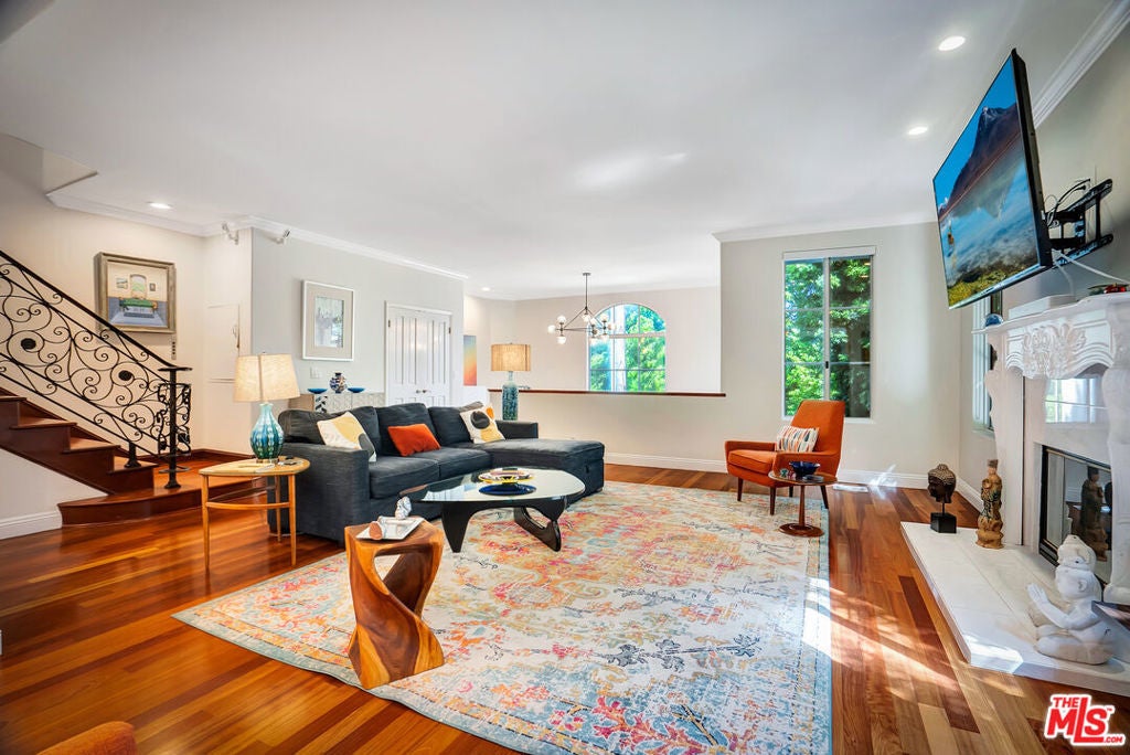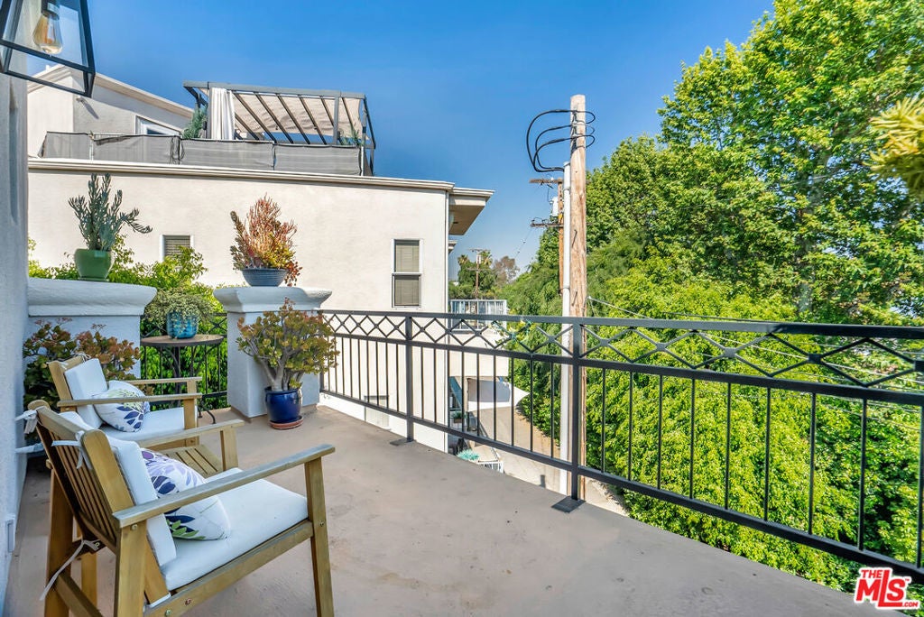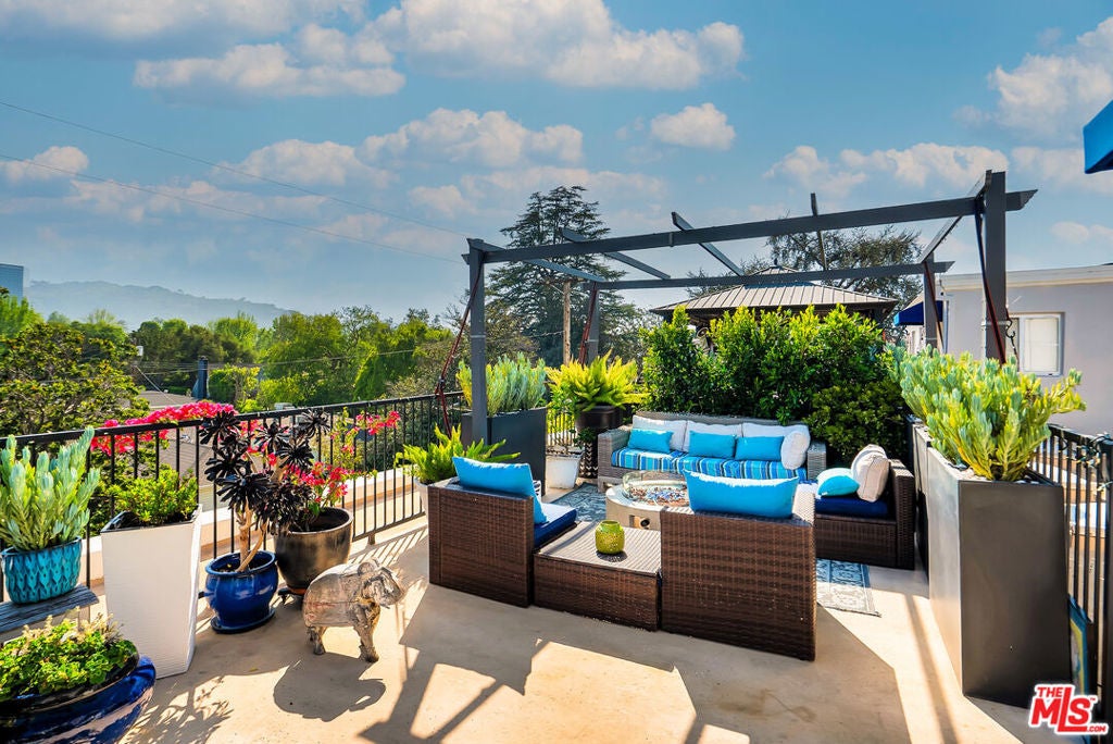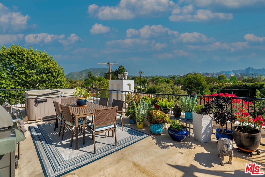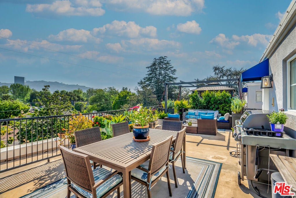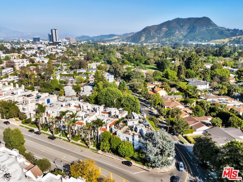 Luxurious townhome with an expansive private rooftop deck, ideally situated in prestigious Toluca Lake. This exceptional 3-bedroom, 3.5-bath residence welcomes you with a bright, open floor plan enhanced by modern designer finishes throughout. A dramatic two-story marble foyer with ornamental wrought iron detailing sets the tone, leading into an elegant layout designed for both everyday living and effortless entertaining. Rich cherry wood floors run throughout, while abundant windows fill the home with natural light.The formal living room is anchored by a beautiful fireplace and flows seamlessly into the adjoining dining room, complete with a sleek wet bar. The crisp white chef's kitchen features quartz countertops, breakfast bar, a Sub-Zero refrigerator, and a separate eating area. Upstairs, the stunning primary suite serves as a true cozy retreat, an oversized walk-in closet, a private balcony with views, and a large spa-inspired bathroom with a jetted soaking tub. A secondary bedroom suite is also located on this level, providing comfort and privacy. On the first floor, an additional bedroom suite offers ideal flexibility, perfect for guests, an executive home office, or private workspace. At the top, the show-stopping private rooftop deck captures the essence of Southern California living featuring a hot tub, dedicated dining and lounge areas, and a gas hookup for BBQ. Enjoy unobstructed sunrise views behind Griffith Park, Holidays watch parties of Universal Studios and WB Studios fireworks, creating a dynamic backdrop perfect for year-round entertaining.Additional highlights include a private two-car garage and a convenient dumbwaiter. Ideally located near major motion picture studios, shopping, dining, and all that Toluca Lake has to offer.