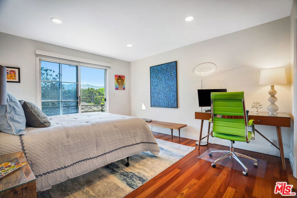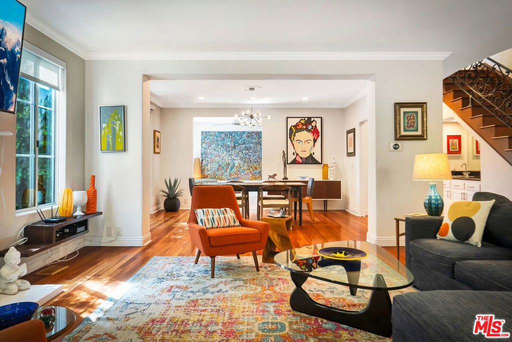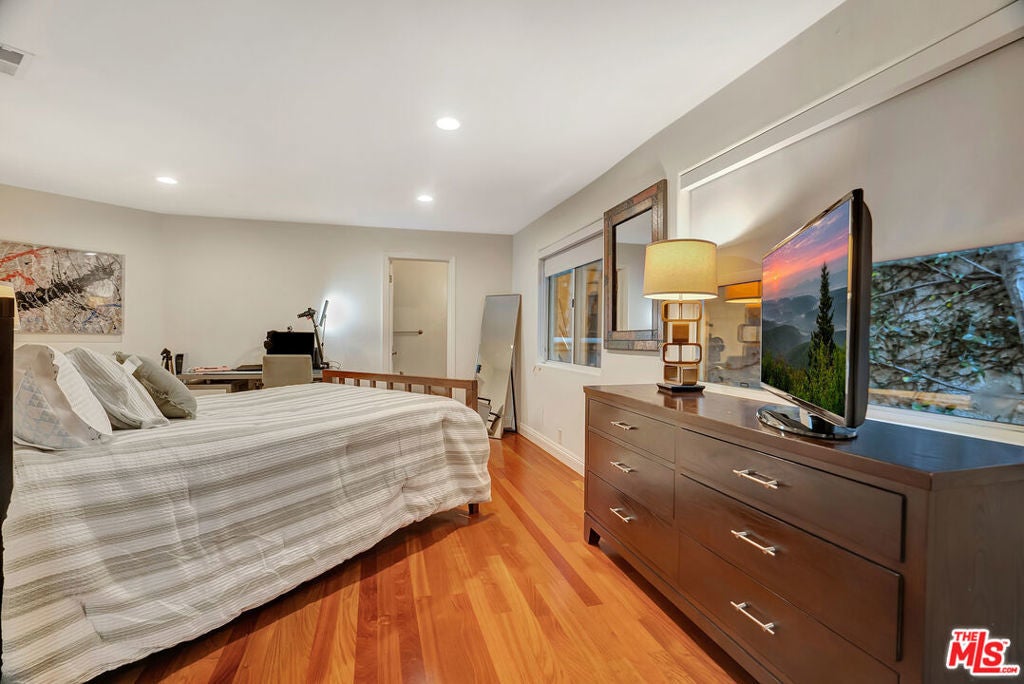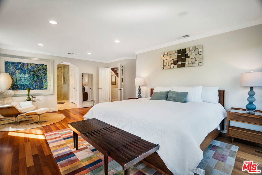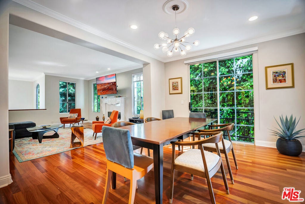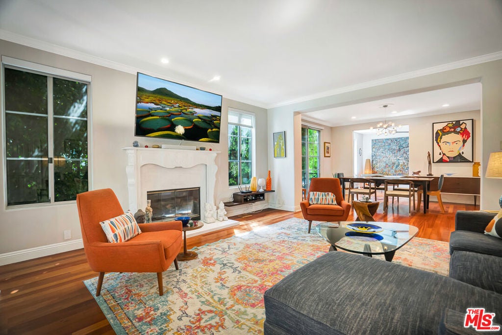 Luxurious townhome with an expansive private rooftop deck, ideally situated in prestigious Toluca Lake. This exceptional 3-bedroom, 3.5-bath residence welcomes you with a bright, open floor plan enhanced by modern designer finishes throughout. A dramatic two-story marble foyer with ornamental wrought iron detailing sets the tone, leading into an elegant layout designed for both everyday living and effortless entertaining. Rich cherry wood floors run throughout, while abundant windows fill the home with natural light.The formal living room is anchored by a beautiful fireplace and flows seamlessly into the adjoining dining room, complete with a sleek wet bar. The crisp white chef's kitchen features quartz countertops, breakfast bar, a Sub-Zero refrigerator, and a separate eating area. Upstairs, the stunning primary suite serves as a true cozy retreat, an oversized walk-in closet, a private balcony with views, and a large spa-inspired bathroom with a jetted soaking tub. A secondary bedroom suite is also located on this level, providing comfort and privacy. On the first floor, an additional bedroom suite offers ideal flexibility, perfect for guests, an executive home office, or private workspace. At the top, the show-stopping private rooftop deck captures the essence of Southern California living featuring a hot tub, dedicated dining and lounge areas, and a gas hookup for BBQ. Enjoy unobstructed sunrise views behind Griffith Park, Holidays watch parties of Universal Studios and WB Studios fireworks, creating a dynamic backdrop perfect for year-round entertaining.Additional highlights include a private two-car garage and a convenient dumbwaiter. Ideally located near major motion picture studios, shopping, dining, and all that Toluca Lake has to offer.