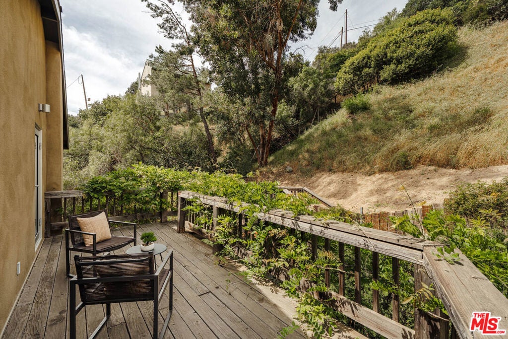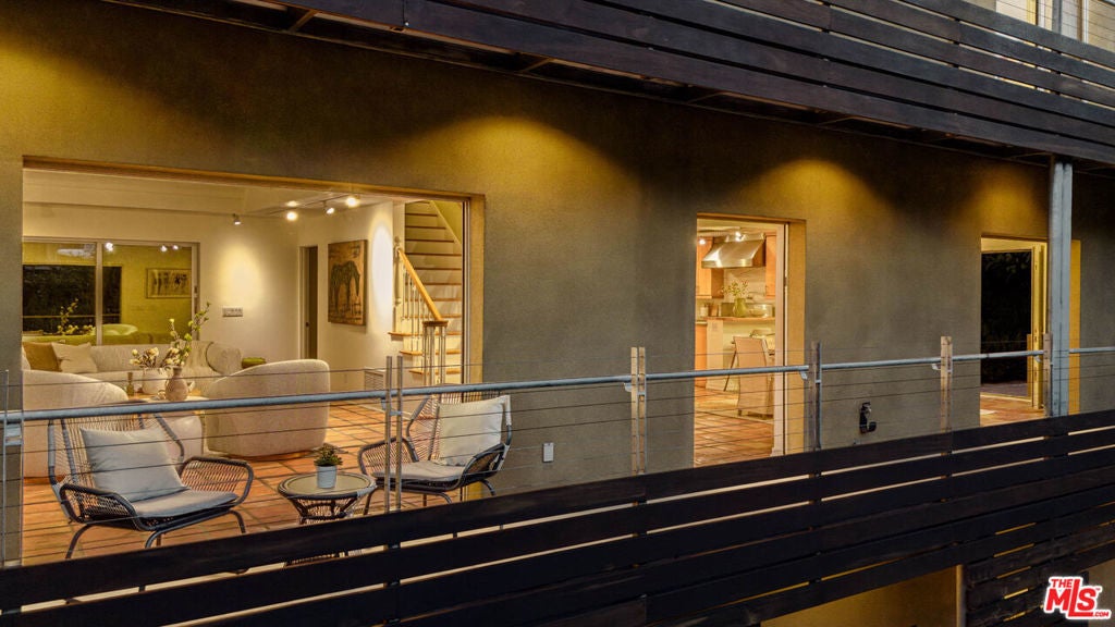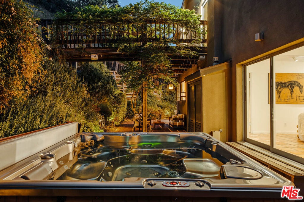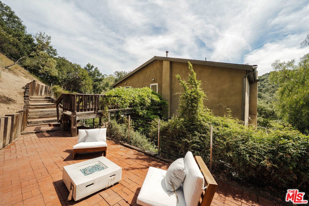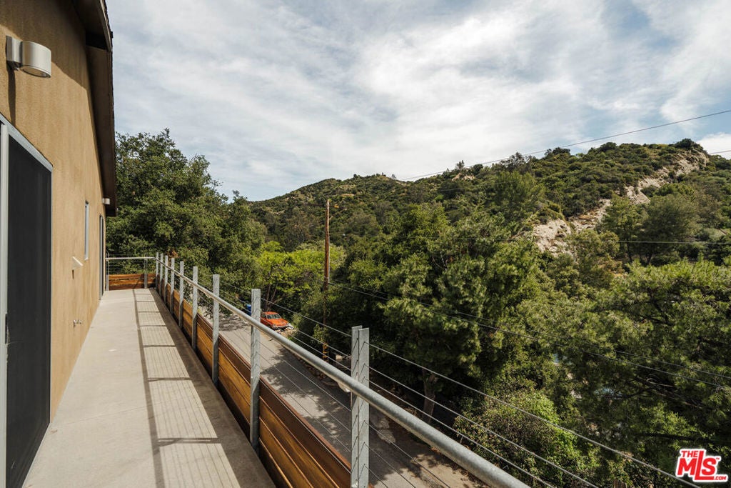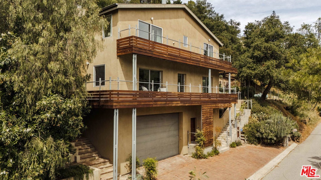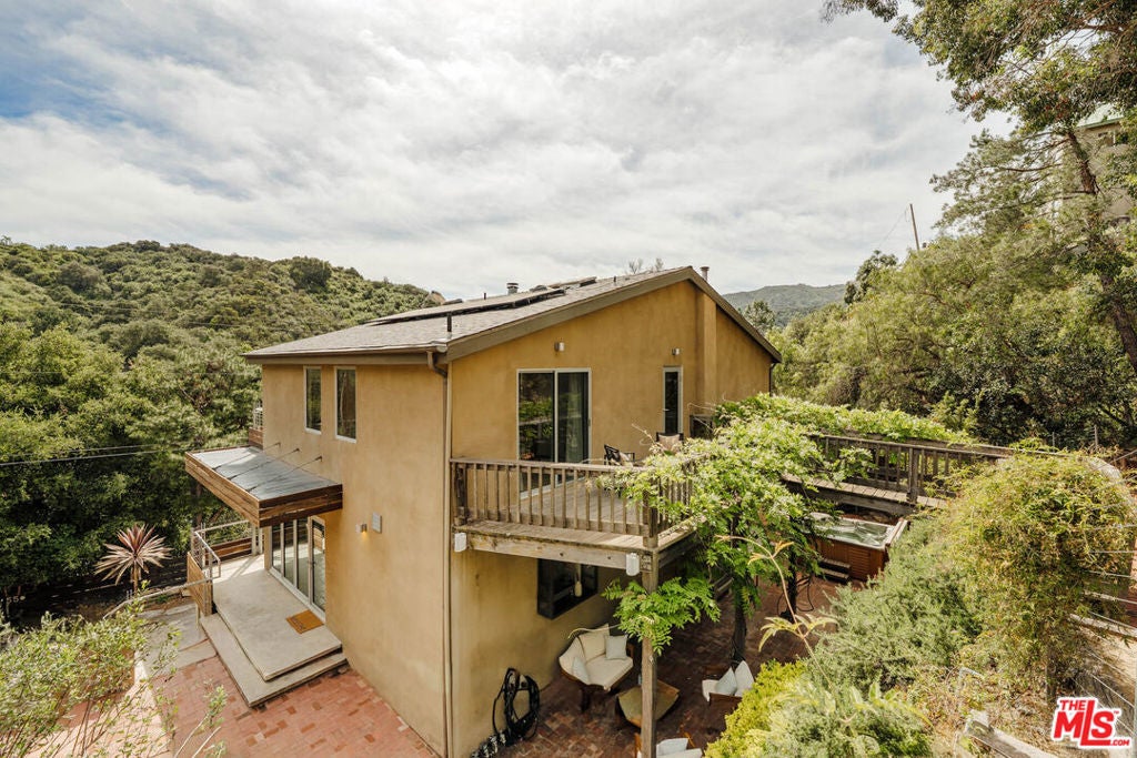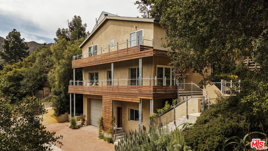 Nestled in one of Topanga Canyon's quieter pockets, this home offers an intimate connection to the surrounding canyon with views of Saddle Peak Ridge, where you can hear frogs in the creek and watch hawks soar overhead. Built by local builder Maurice Bourget and renovated in collaboration with architect John Jennings, the home spans three levels and is designed for easy indoor-outdoor living. The main level features a folding front entry and Fleetwood pocket doors that disappear completely, letting canyon breezes flow through the house and out onto the wrap-around balcony. The living room centers around a wood-burning fireplace, with windows framing the canyon on one side and the backyard hot tub on the other, while the kitchen is well-equipped with a six-burner chef's stove, wine cooler, walk-in pantry, RO and hot water tap. A guest bathroom on this level offers direct access to the backyard. Upstairs, skylights pour light into the hallway leading to three bedrooms. The primary suite looks out over the surrounding canyon with its own fireplace, en-suite bath, walk-in closet, and private balcony, a peaceful place to start and end the day. The second bedroom shares the balcony with the primary and has a charming view of the backyard, and the third bedroom has access to a deck leading out into the yard. Each room finds its own quiet connection to the landscape. The primary has its own en-suite bath, and a shared bathroom serves the second and third bedrooms. The ground level houses a theater room with projector and screen, and a full bath, equally suited as an office or guest suite, alongside an oversized garage with 20-foot ceilings. Outside, native landscaping surrounds a large brick patio with multiple seating areas connected by a walkway that winds through the backyard, with spots to sit, unwind, and take in the natural setting at every turn. The property comes with a 16-panel solar system, fully paid off. Just minutes from Old Topanga Canyon Road and about 15 minutes from Calabasas, this is a well-built, comfortable home in a beautiful part of the canyon, ready to be made your own.