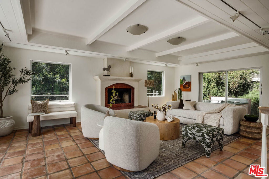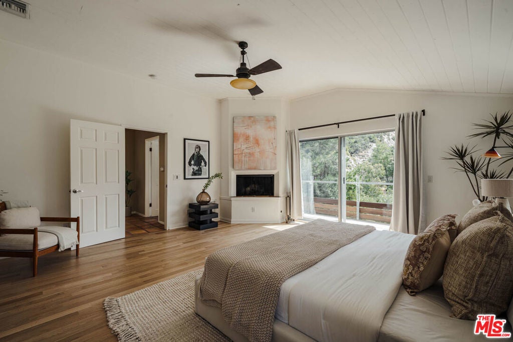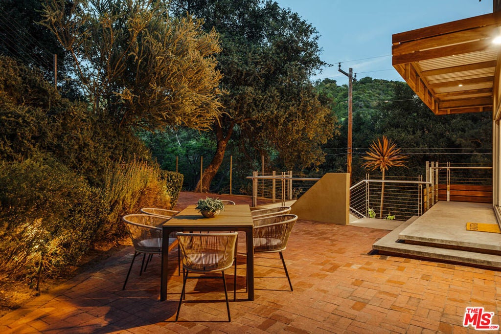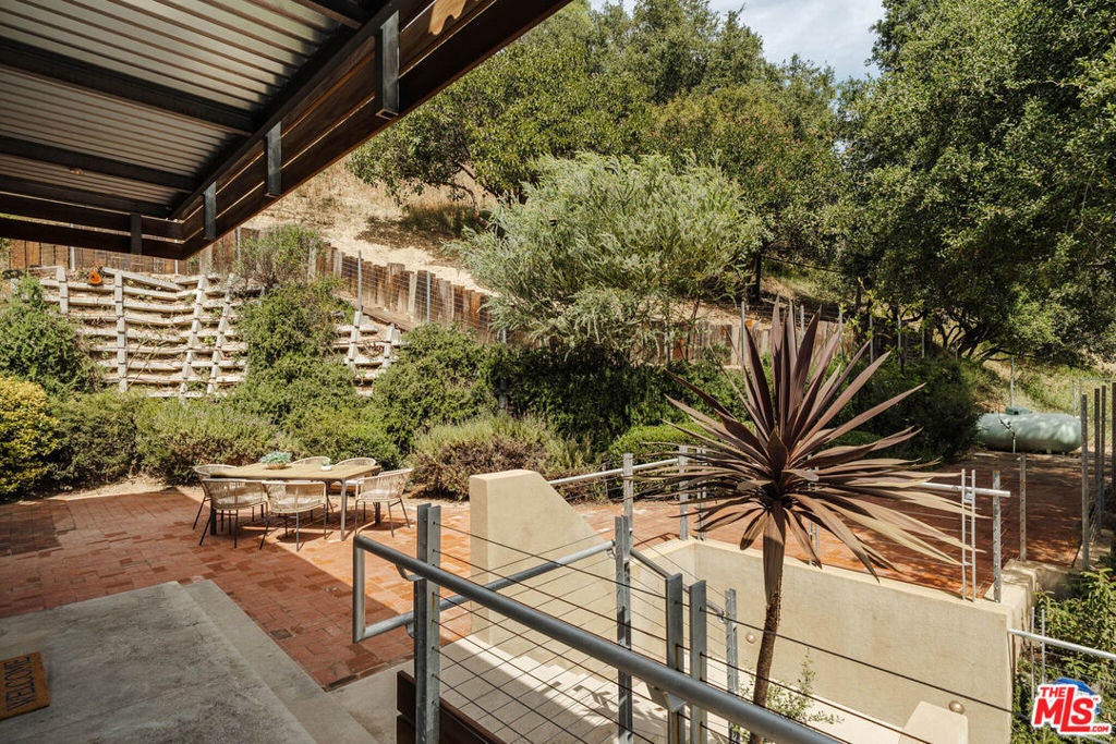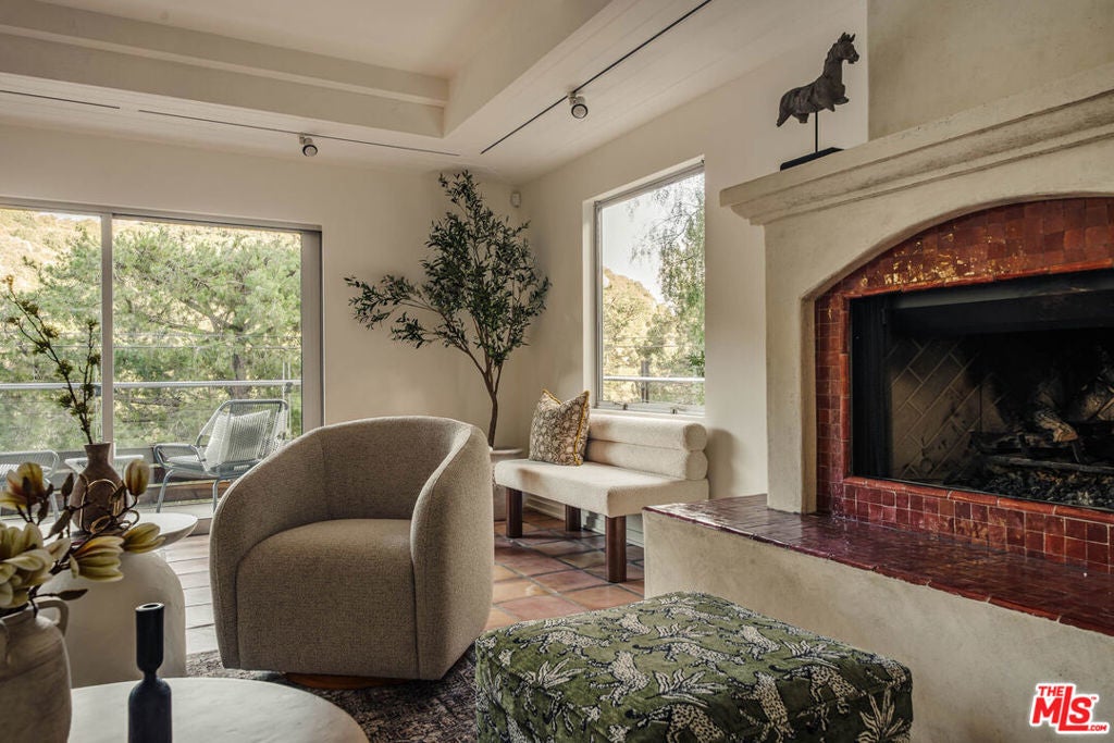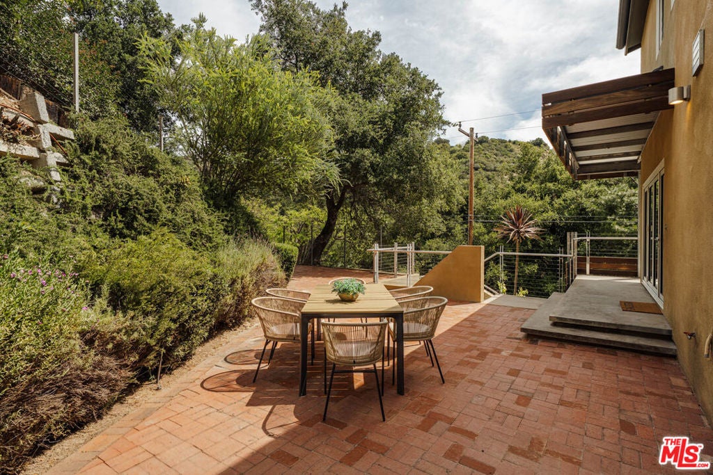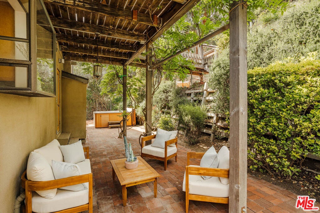 Nestled in one of Topanga Canyon's quieter pockets, this home offers an intimate connection to the surrounding canyon with views of Saddle Peak Ridge, where you can hear frogs in the creek and watch hawks soar overhead. Built by local builder Maurice Bourget and renovated in collaboration with architect John Jennings, the home spans three levels and is designed for easy indoor-outdoor living. The main level features a folding front entry and Fleetwood pocket doors that disappear completely, letting canyon breezes flow through the house and out onto the wrap-around balcony. The living room centers around a wood-burning fireplace, with windows framing the canyon on one side and the backyard hot tub on the other, while the kitchen is well-equipped with a six-burner chef's stove, wine cooler, walk-in pantry, RO and hot water tap. A guest bathroom on this level offers direct access to the backyard. Upstairs, skylights pour light into the hallway leading to three bedrooms. The primary suite looks out over the surrounding canyon with its own fireplace, en-suite bath, walk-in closet, and private balcony, a peaceful place to start and end the day. The second bedroom shares the balcony with the primary and has a charming view of the backyard, and the third bedroom has access to a deck leading out into the yard. Each room finds its own quiet connection to the landscape. The primary has its own en-suite bath, and a shared bathroom serves the second and third bedrooms. The ground level houses a theater room with projector and screen, and a full bath, equally suited as an office or guest suite, alongside an oversized garage with 20-foot ceilings. Outside, native landscaping surrounds a large brick patio with multiple seating areas connected by a walkway that winds through the backyard, with spots to sit, unwind, and take in the natural setting at every turn. The property comes with a 16-panel solar system, fully paid off. Just minutes from Old Topanga Canyon Road and about 15 minutes from Calabasas, this is a well-built, comfortable home in a beautiful part of the canyon, ready to be made your own.