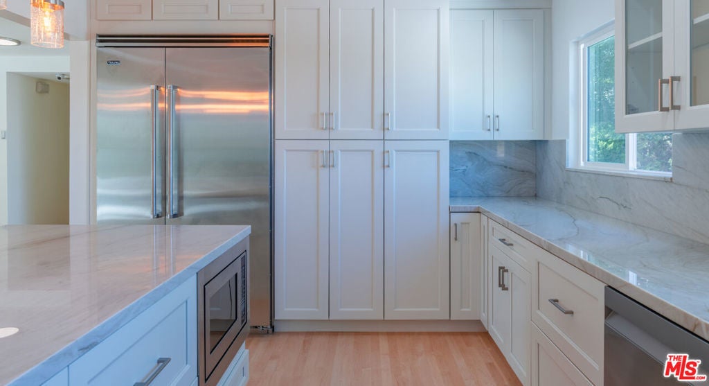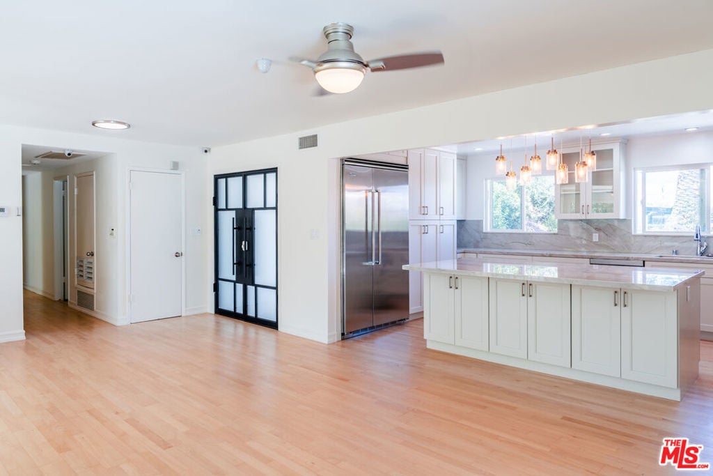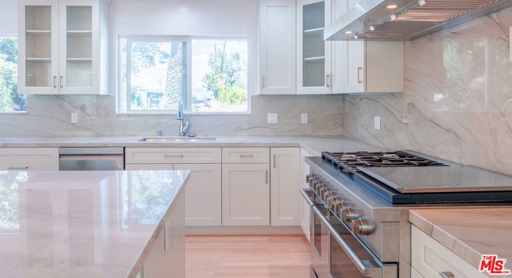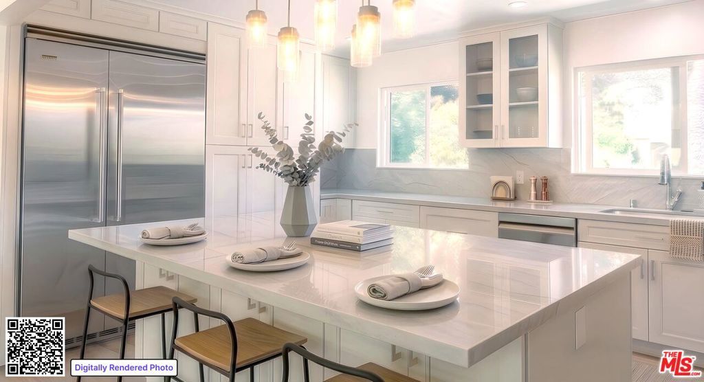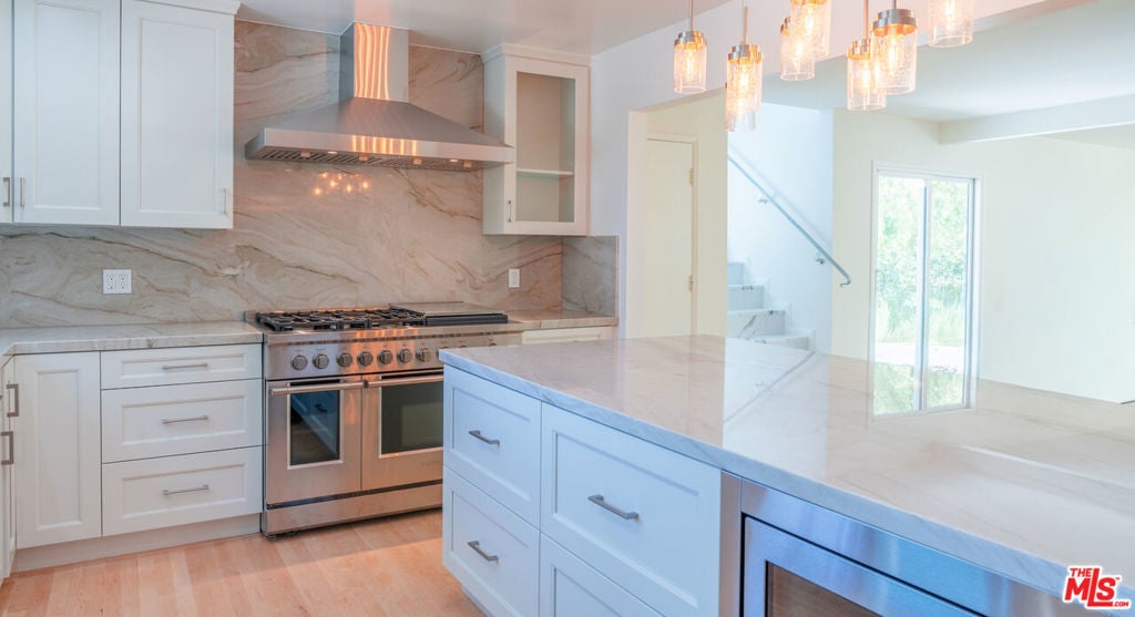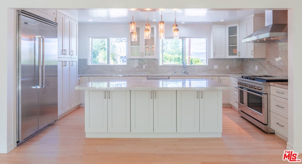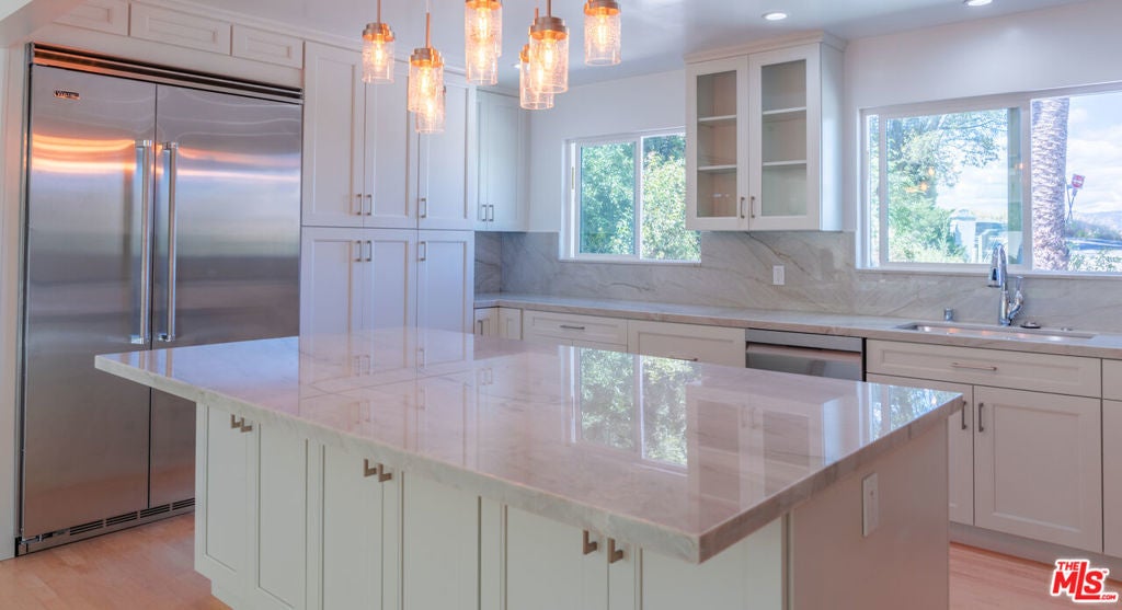 Set on a peaceful, quiet street, South of The Boulevard in the coveted Woodland Hills, this inviting home offers sweeping 360-degree mountain and valley views with an exceptional sense of privacy and calm. Thoughtfully updated throughout, the residence blends comfort and style with a brand new, beautifully remodeled kitchen appointed with premium appliances, modern black metal and frosted glass French doors, updated windows and sliding doors, fresh interior and exterior paint, and remodeled bathrooms with refined finishes. This homes open living area, decorated with a gas fireplace will keep you comfortable and safe with its newly upgraded central air, and a hardwired security system. The finished garage and upstairs addition you can use as a home office or secondary primary bedroom boasts its own walk-in closet, bathroom with dual vanity, full size shower and separate central air. As you make your way outside you'll find newly added fruit trees, refreshed landscaping, and thoughtfully designed water-collection planter boxes that add both functionality and charm. This homes outdoor living will keep your guests entertained as they enjoy a fully remodeled pool, built-in BBQ with refrigerator and generous parking on the property along with abundant, safe street parking as well. You will not only be just a few minutes from the famous Warner Center, but close to The Village, Westfield Topanga, popular dining, shopping, and entertainment Venues alike. The home also benefits from the area's exciting continued growth as Woodland Hills is part of the Warner Center 2035 vision for a more vibrant mixed-use hub, and Rams Village at Warner Center is planned to bring the Los Angeles Rams' permanent headquarters and training facility along with new residential, retail, office, entertainment, and open-space elements to the neighborhood. This momentum, together with the broader transformation of the former Promenade site, continues to elevate the area's long-term appeal and value. This Home Has Been Virtually Staged.