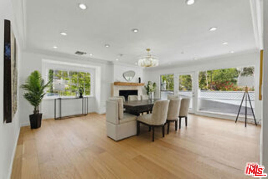 Enchanting storybook home, nestled on a peaceful, tree-lined street, seamlessly blends modern updates with timeless charm. Set on nearly 20,000 sqft, the property offers exceptional curb appeal with five spacious bedrooms, four bathrooms, a half-circle driveway, and mature landscaping, creating a private paradise. Inside, the contemporary traditional design radiates natural warmth, featuring custom White Oak flooring, recessed lighting, a cozy fireplace, and a stylish bar area bathed in abundant natural light. The expansive dining room, with an additional nook and grand fireplace, is perfect for entertaining. The chef's kitchen offers generous cabinetry, countertop space, a breakfast area, breakfast bar, and high-end stainless steel appliances. The primary retreat is a true sanctuary with vaulted ceilings, a private balcony, a spacious walk-in closet with custom cabinetry, and an en suite bathroom with a rainfall shower, Jacuzzi tub, skylight, and double vanity. The backyard is an oasis, with an oversized pool, waterfall Jacuzzi, charming cabana, and an outdoor kitchen with a grill and sink ideal for al fresco dining and entertaining. Additional features corner lot including a side driveway leading to the bottom level, an attached two-car garage, an expansive side yard, a dedicated laundry room, and central AC/heat. Conveniently located near trendy restaurants, shopping, and amenities such as The Village, Cedars-Sinai, Whole Foods, and Equinox, with easy access to the 101 Freeway, this home offers the perfect balance of privacy, luxury, and convenience. Prepare to be amazed. *Some photos are Virtually Staged both Interior and Exterior including Tennis Court*