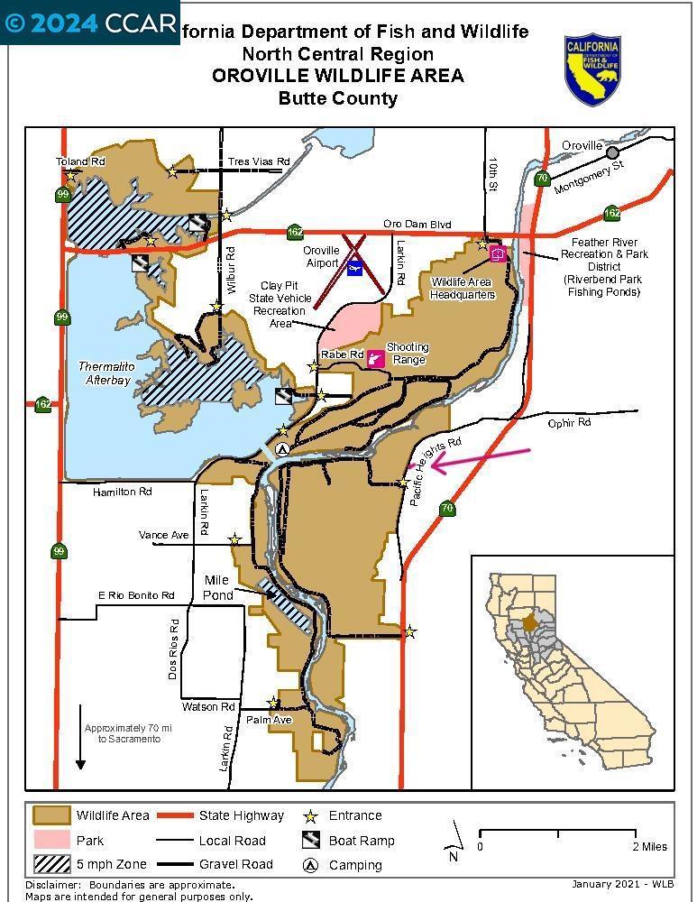 Rarely available 1.5 Acre near the Feather River just 10 miles from central Oroville. Across the road from the Oroville Wildlife Area with miles of hiking and biking trails. Not in an HOA and no CCRs.