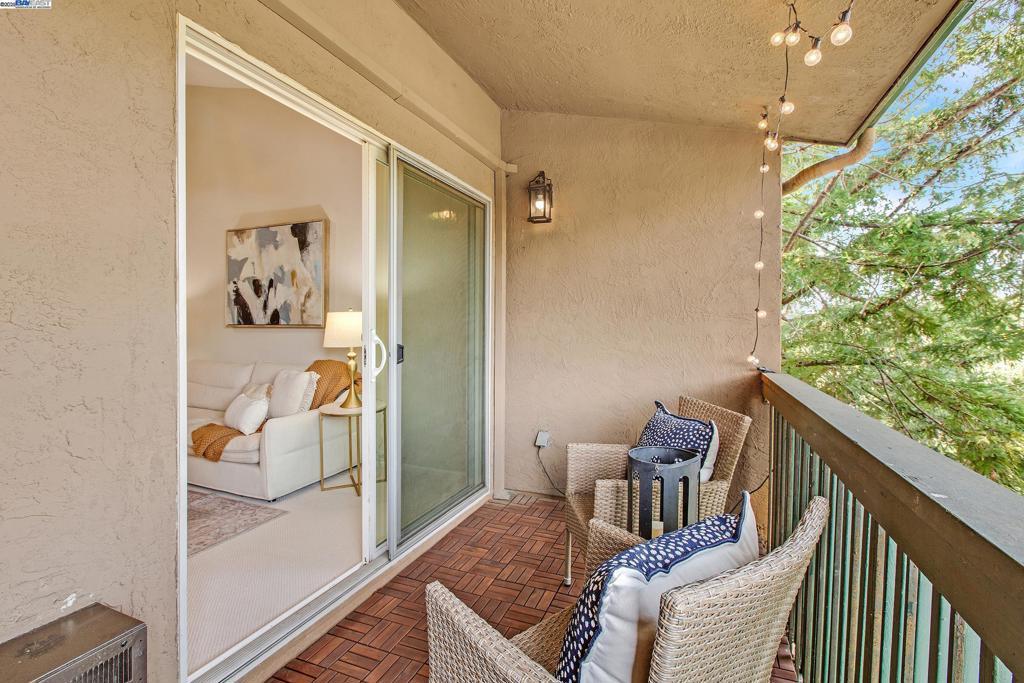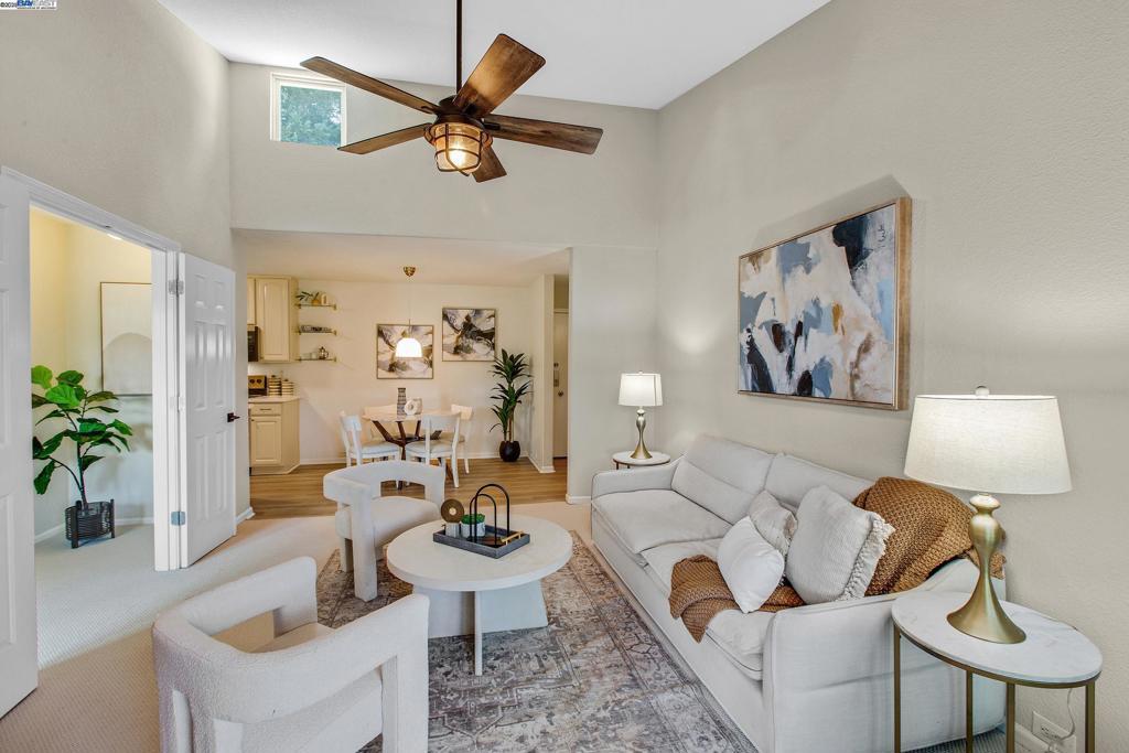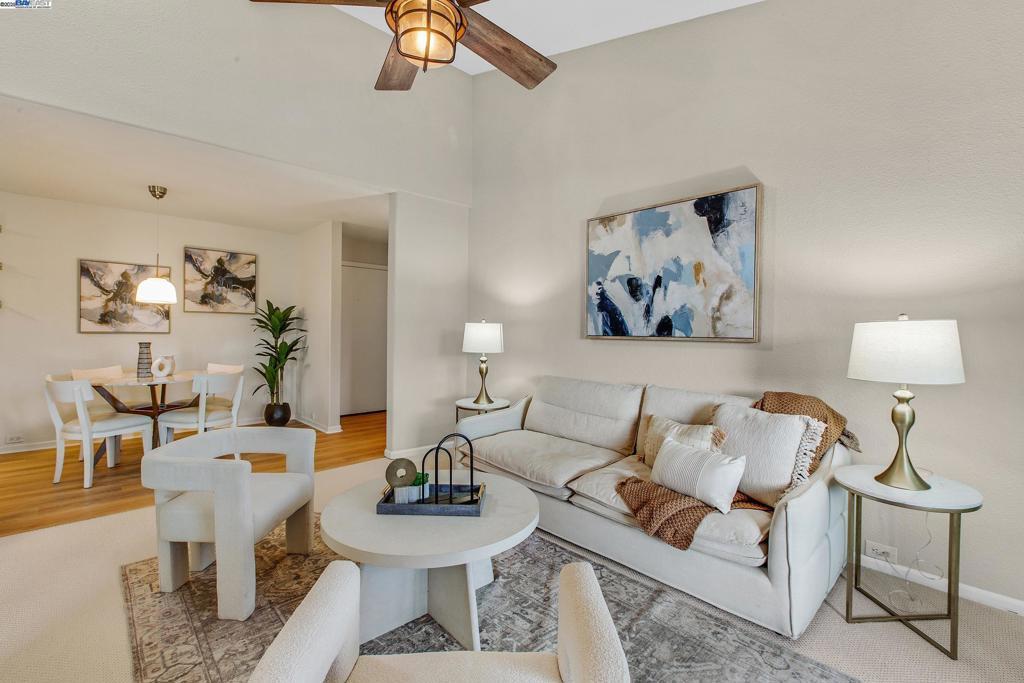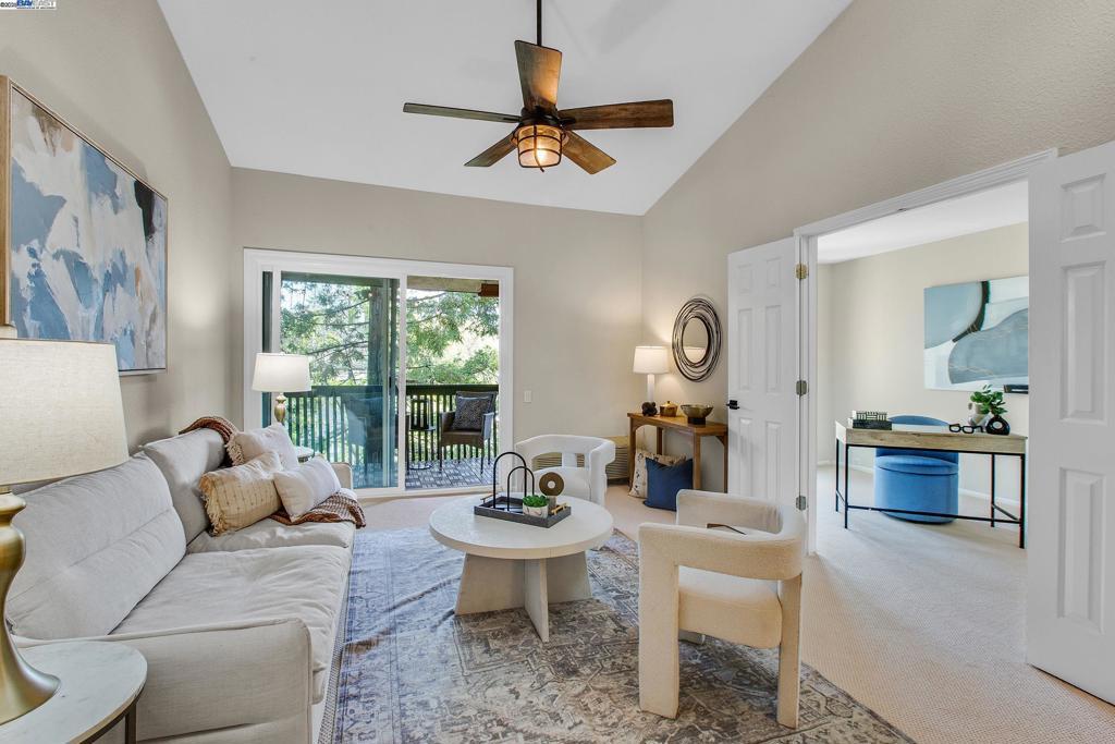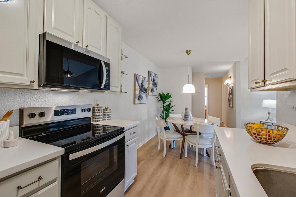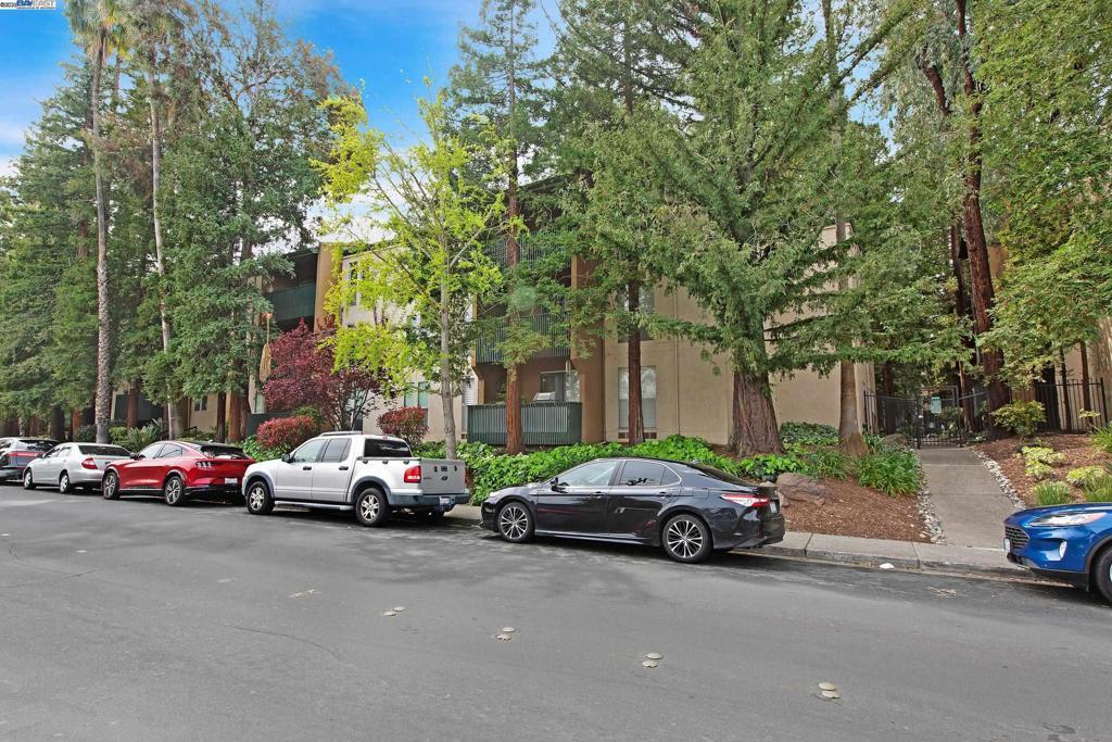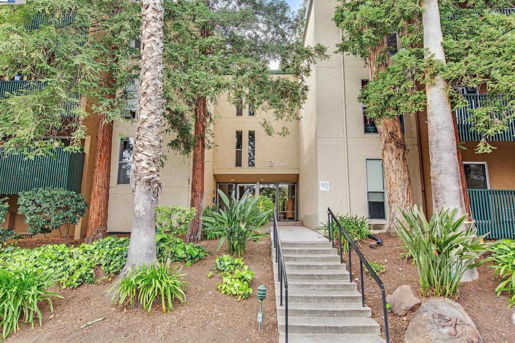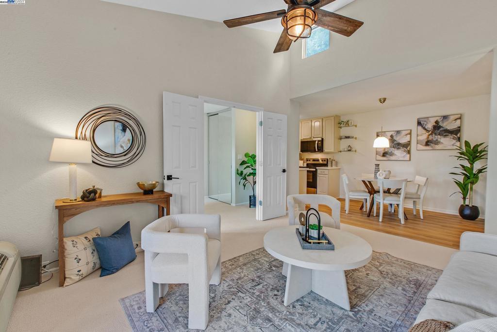 Welcome to this gorgeous, top-floor end unit in the heart of vibrant Walnut Creek! This beautifully updated condo with new flooring throughout offers the perfect blend of style, comfort, and convenience. Soaring vaulted ceilings, a skylight, and dual-pane windows fill the space with natural light, while modern touches like quartz countertops, brand new stainless steel appliances, and a brass dining light fixture with mouth-blown glass elevate the kitchen and living areas. A fingerprint touch lock and Nest Doorbell add an extra layer of modern security and ease. The spacious primary suite features double closets with floor-to-ceiling mirrored doors, and a stylish bathroom with dual vanities and a glass-enclosed shower over tub. Enjoy your private deck with views of Mt. Diablo, and take advantage of ample storage throughout the unit plus extra storage space above your covered parking spot. Additional features include a video intercom system and unbeatable walkability—just minutes to downtown with Broadway Plaza, upscale dining, shopping, movie theaters, and entertainment right outside your door. Enjoy direct access to the Iron Horse Trail, close proximity to BART, and more.