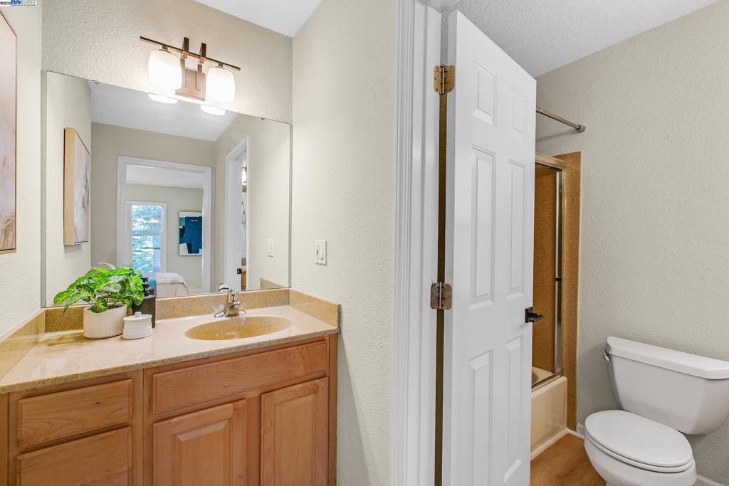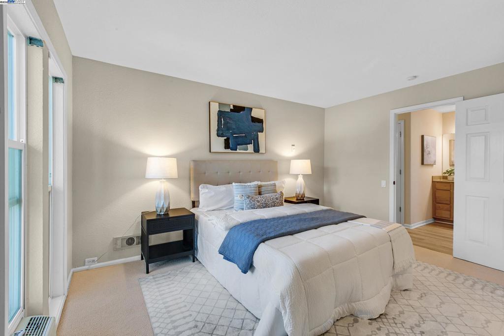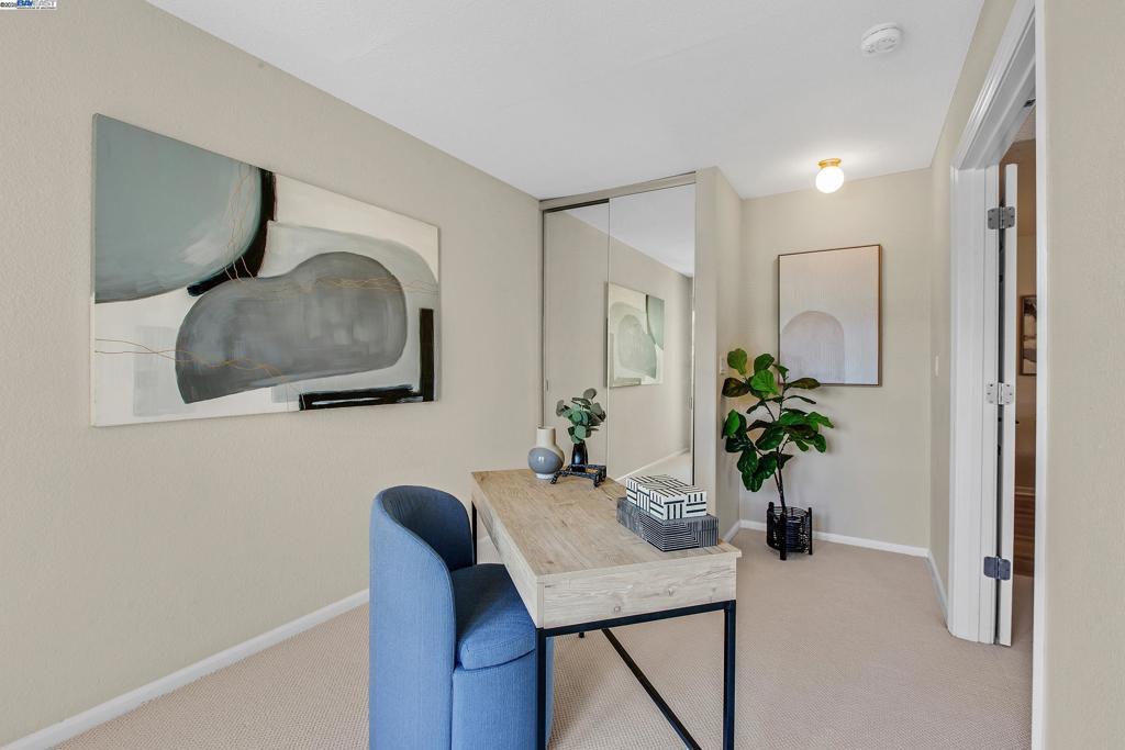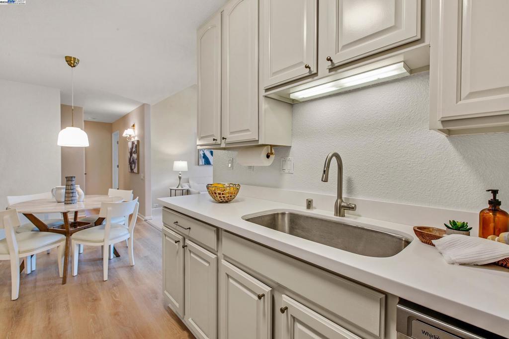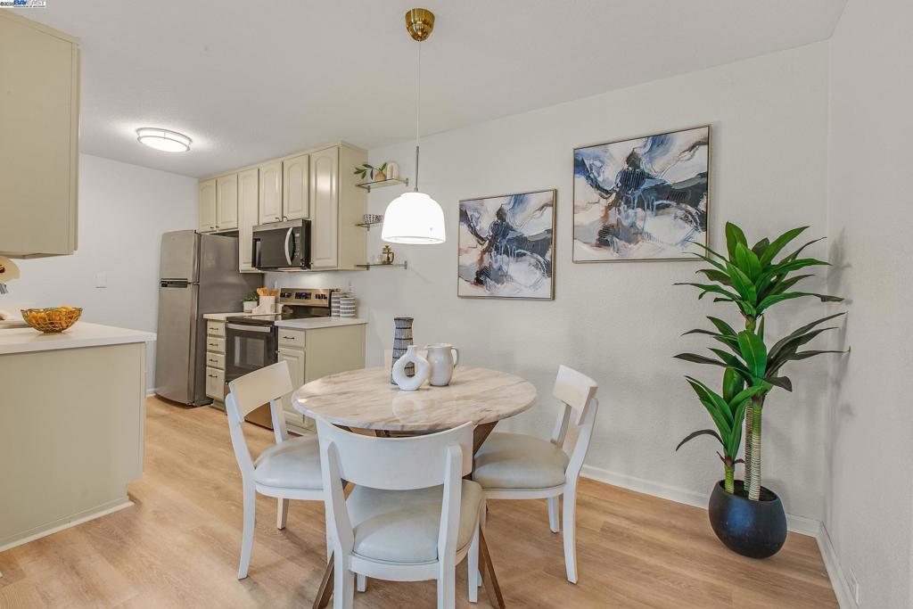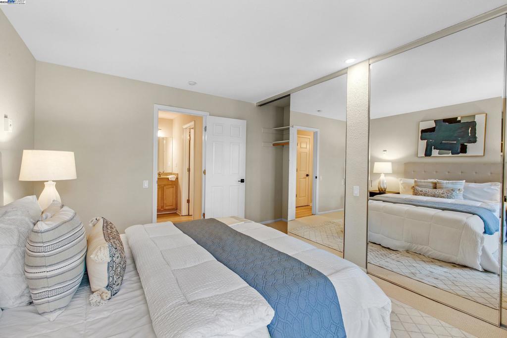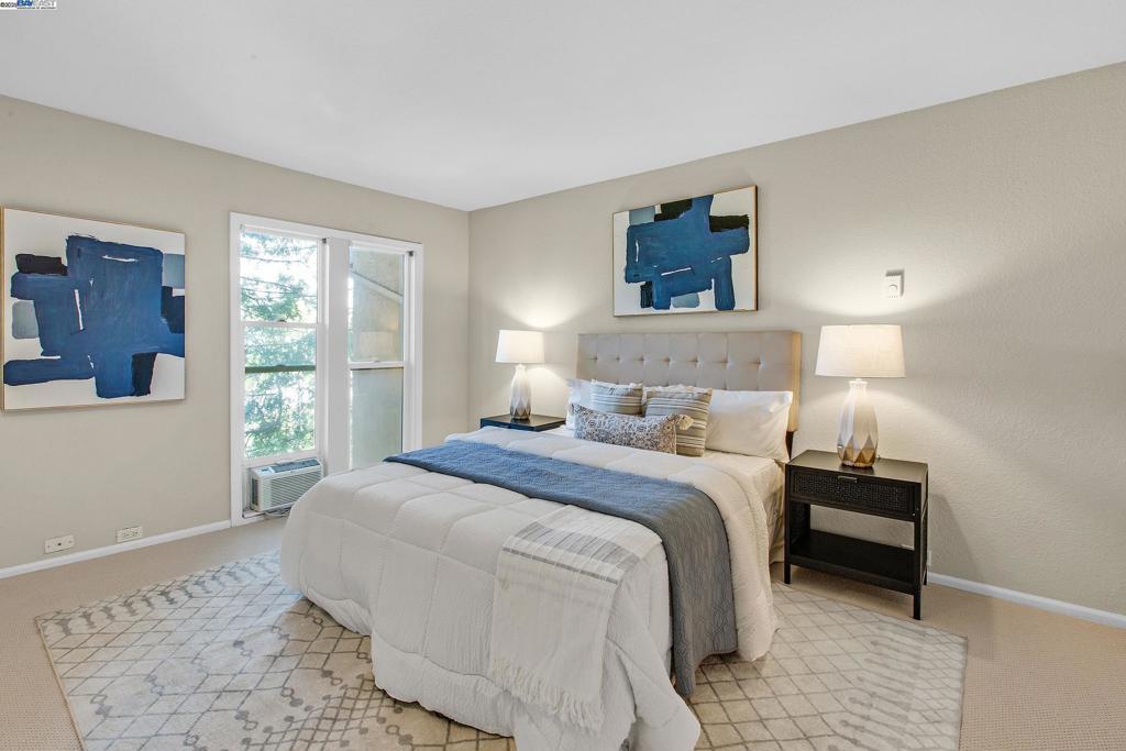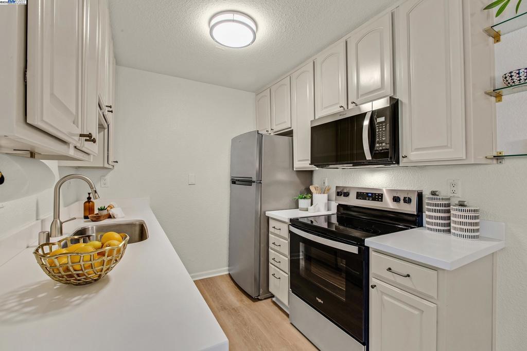 Welcome to this gorgeous, top-floor end unit in the heart of vibrant Walnut Creek! This beautifully updated condo with new flooring throughout offers the perfect blend of style, comfort, and convenience. Soaring vaulted ceilings, a skylight, and dual-pane windows fill the space with natural light, while modern touches like quartz countertops, brand new stainless steel appliances, and a brass dining light fixture with mouth-blown glass elevate the kitchen and living areas. A fingerprint touch lock and Nest Doorbell add an extra layer of modern security and ease. The spacious primary suite features double closets with floor-to-ceiling mirrored doors, and a stylish bathroom with dual vanities and a glass-enclosed shower over tub. Enjoy your private deck with views of Mt. Diablo, and take advantage of ample storage throughout the unit plus extra storage space above your covered parking spot. Additional features include a video intercom system and unbeatable walkability—just minutes to downtown with Broadway Plaza, upscale dining, shopping, movie theaters, and entertainment right outside your door. Enjoy direct access to the Iron Horse Trail, close proximity to BART, and more.