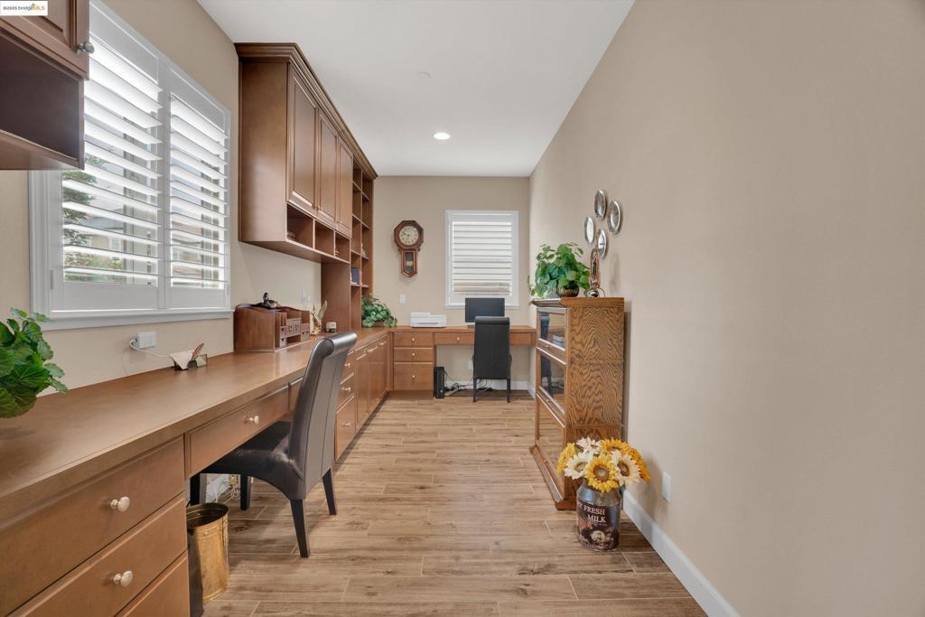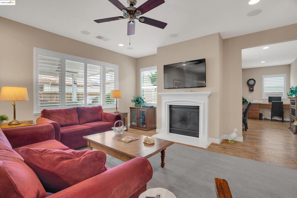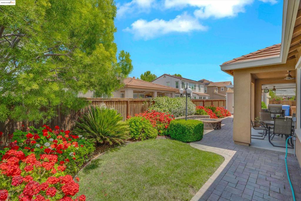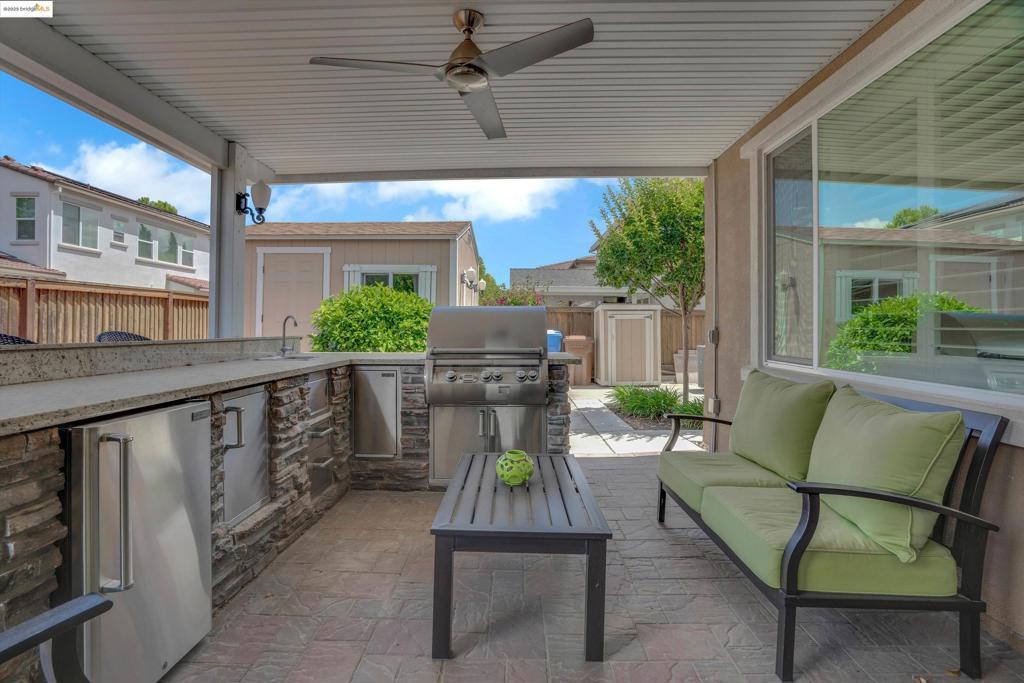 Discover the perfect combination of style, comfort, and functionality in this spacious 4-bedroom, 2.5-bathroom single-story home nestled on a desirable corner lot. Located just a short walk from local elementary schools and scenic parks, this home offers a lifestyle of ease and community connection. Inside, you'll find a bright and open floor plan featuring neutral tones, high ceilings, and abundant natural light. The expansive living and dining areas seamlessly flow into a large, well-appointed kitchen—perfect for both everyday living and entertaining. A generously sized private office provides an ideal space for remote work, study, or a quiet retreat. Each bedroom is spacious and thoughtfully placed for privacy, while the primary suite offers a peaceful escape with a luxurious ensuite bathroom and ample closet space. Step outside to your personal backyard oasis featuring a custom outdoor kitchen, a large covered patio, and plenty of room to relax or entertain guests. Whether you're hosting a summer barbecue or enjoying a quiet evening outdoors, this space has it all. Energy efficiency is covered with owned solar panels, keeping utility costs low while promoting sustainability. With its prime location, smart layout, and impressive features, this home truly checks all the bo
