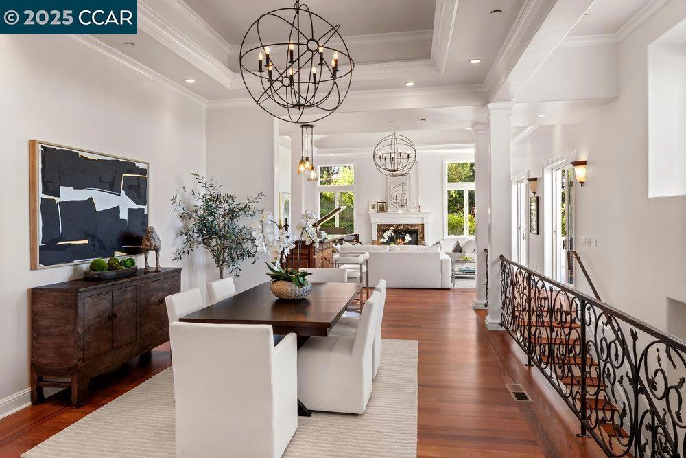 This Mediterranean-style retreat sits peacefully on a quiet street between downtown Orinda and Miramonte High School. A manicured garden and warm Brazilian cherry staircase lead to the main level, where natural light fills the open-concept living and dining spaces. The expansive living/family room—spanning 520 sq ft under a coffered ceiling—features a wet bar, wine cellar, grand fireplace, and direct deck access for easy entertaining. The gourmet kitchen offers Sub-Zero and premium appliances, granite counters, a large island, and breakfast bar seating for four, opening to a side deck and outdoor kitchen. Upstairs, three ensuite bedrooms include a luxurious primary suite with panoramic views, a coffered ceiling, and a fireplace. A convenient laundry room and covered garden deck complete the level. A fourth bedroom with a full bath on the entry level provides privacy for guests. Conveniently located near Moraga Road, with quick access to Highway 24, BART, and top-rated Orinda schools—this home offers elegant living in a prime location.