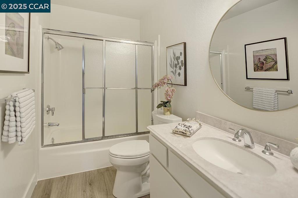 Highly sought-after level in Santa Cruz model, ideally situated in a serene lawn setting with lovely outlook of the eastern hills, including beautiful twilight views. A spacious, sun-drenched tiled patio with a lovely garden bed invites outdoor relaxation and entertaining. Step inside to a fresh and open living space ~ remodeled kitchen featuring designer quartz countertops, all new stainless steel appliances, stove fan, sink & faucet. Freshly painted throughout in Benjamin Moore’s elegant “Soft Chamois,” the home is filled with natural light and features smooth-finish ceilings for a clean, contemporary feel. New luxury plank flooring in “Dynamic Beige” flows seamlessly through the main living areas, while the two bedrooms are finished with plush, upgraded “Caspian” carpeting. Abundant closet space throughout includes a large hall closet with hook-ups for a full-size washer and dryer. Attractive new hardware and fixtures complete the polished look of this exceptional property. Accessibility is a breeze with a user-friendly ramp (with railing) that leads to the nearby carport building, which includes a storage closet. Plentiful guest parking nearby. MUST SEE!