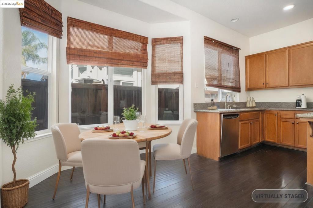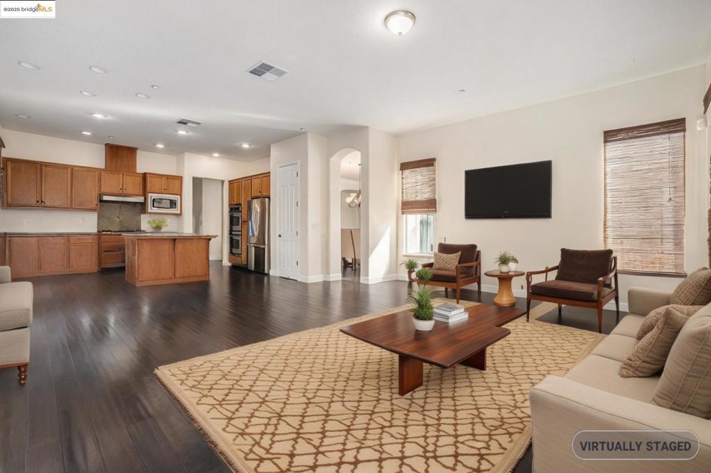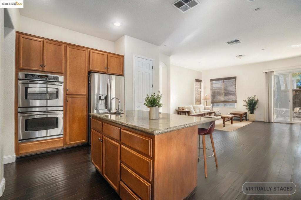 Beautiful 4 bedroom 2.5 bath single story on large corner lot! Open floor plan with 10ft ceilings and an abundance of natural light. Kitchen features granite counters, stainless appliances, double oven, maple cabinetry and center island. Living room has French doors leading to rear yard stamped patio. All bedrooms are good in size. Primary bedroom features walk in closet and separate tub/shower. Home has owned solar and 3 car garage. Rose Garden subdivision has multiple parks and community pool. Assumable loan with low rate 0f 2.65 APR 2.9 balance of $562,124. OPEN SATURDAY 27th from 11-1.