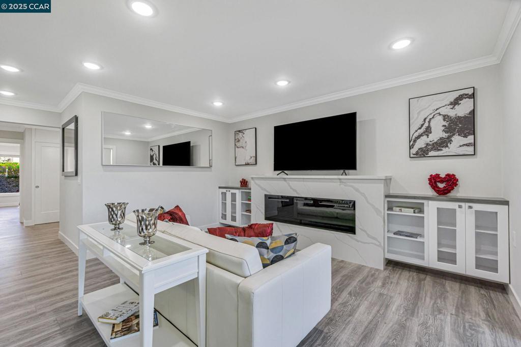 OVER $50K in PRICE IMPROVEMENT!! Totally TURN-KEY! Furniture included, if desired. Corner end-unit, Sonoma Wrap model offers quiet, privacy & ample space, inside & out. Fall in love with this stunning One-of-a-Kind, custom-designed remodel with a modern flair! 2 BD/2 BA, plus large-enclosed den, +/- 1,150sq ft. Come by to view this open, spacious & bright home! New doors, new windows, new hardware & decorative lighting, recessed lighting & crown molding everywhere, new paint, Nest thermostat & much more...Huge window added in dining area & another in kitchen, opening up to nature. Kitchen features new SS appliances plus wine refrigerator for easy entertaining. Gorgeous lunar quartz countertops & peninsula, with shaker cabinets that surround the kitchen to dining areas for lots of space/storage. Living room has sleek built-in electric fireplace to relax. Need more cabinets for your books? You got it! Custom den expansion created to use as your office or hobby room. Primary bath is beautifully designed with large, tiled walk-in shower & wide dual-sink vanity. Inside W/D combo gives you more time to go have fun at Rossmoor's 55+ active senior adult community. Enjoy golf courses, tennis & pickleball courts, 3 swimming pools & fitness center, restaurant, clubhouse, event hall...
