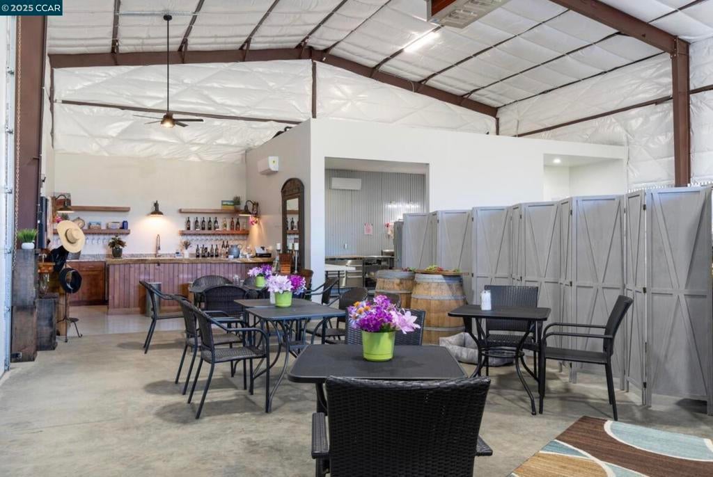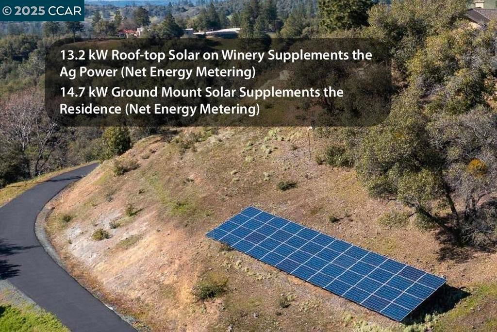 Escape to this stunning home sitting atop just under 75 acres of gorgeous land. Recreation friendly! Ample acreage for horseback riding, ATVs, hiking, or simply enjoying private, panoramic sunset and city-light views. estate is the epitome of the California contemporary luxury residence, featuring vaulted open-beam ceilings, grand formal entry, office, wine cellar, guest casita, and a second garage. Green infrastructure, including a large solar array (roof-mounted and ground-mount), underground utilities, PG&E, well water, septic, and a backup generator for reliable, off-grid capabilities. Currently operating as a winery with 5 planted acres of varietals - Barbera, Petit Sirah, Sangiovese, Vermentino, Malbec. Turn-key winery facility: a approx 2,400 sq ft insulated winery and tasting room with crush pad, refrigeration systems, and ADA parking. Outdoor event spaces framed by vineyards, a pond, rolling Sierra foothill vistas; includes paver patios, lawns, electrical/water hook-ups (food truck friendly), ideal for weddings or gatherings. Elevated location at approx. 2,100?ft above Shenandoah Valley in scenic Amador County.Guest casita (~1 bed/1 bath) configured for short-term rental or event hosting, fully furnished with mini-split HVAC and kitchenette appliances. Views: Ridge