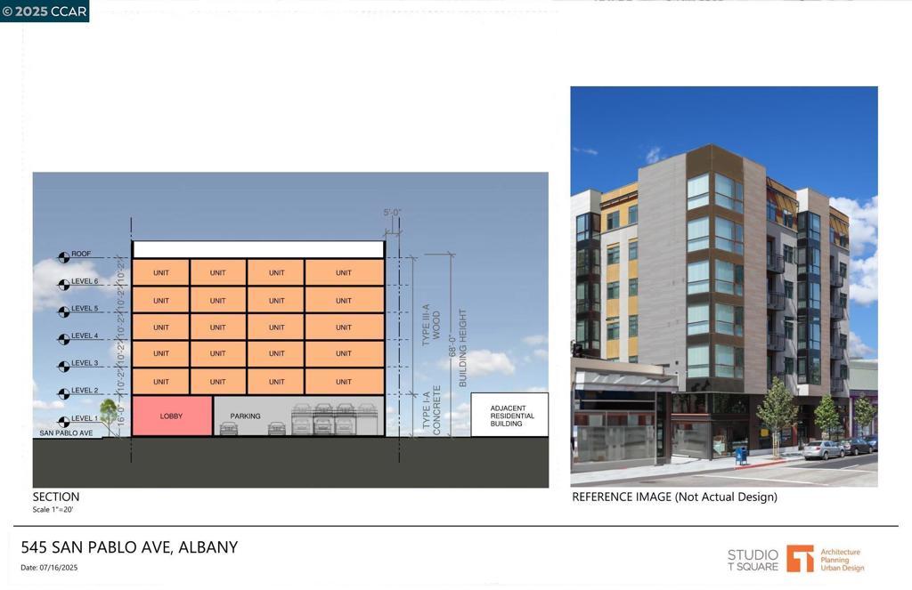Prime 40-Unit Development Opportunity in the Heart of Albany’s Business District. This is a rare and highly desirable opportunity to develop a 40-unit residential project in the vibrant San Pablo Avenue corridor, Albany’s premier commercial district. The property is ideally positioned near a dynamic mix of national retailers, thriving small businesses, and high-traffic corporate tenants. Proposed plans call for a six-story, 40-unit. 50% 1BR/1BA, 50% 2BR/1BA with 2BR/2BA units. SPC zoning district, which has no maximum residential density limit. Unbeatable Location. Just a 5-minute walk to Sprouts Farmers Market, and a 4-minute walk to El Cerrito Plaza, El Cerrito Plaza BART Station. Minutes to Ranch 99 Market. Solano Ave's bustling commercial strip and the merging Gilman District. Easy access to 1-80 and I-580. Short drive to Berkeley, Emeryville, Oakland, and San Francisco. This is a unique chance to invest in one of the East Bay's most sought-after neighborhoods. A top-ranked public school system. Offering long-term growth potential in a transit-rich, community-oriented location. Views: Downtown