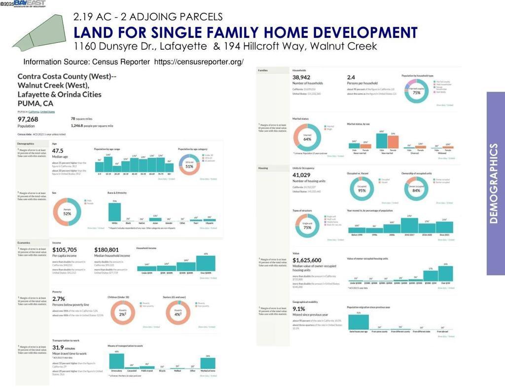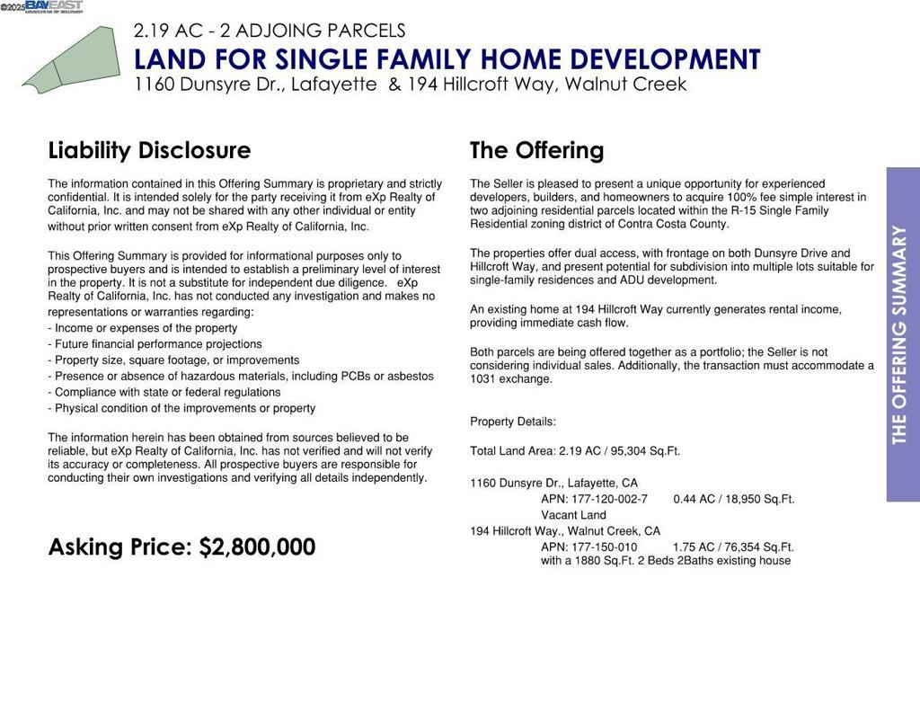 This property is to be sold in conjunction with the adjoinng property at 194 Hillcroft Way, Walnut Creek as a portfolio. Two parcels accumulating 2.19 AC, with potential of building multiple single-family homes. Please review the listing of 194 Hillcroft Way, Walnut Creek for additional information. Additional reports, maps, plans available upon request.
