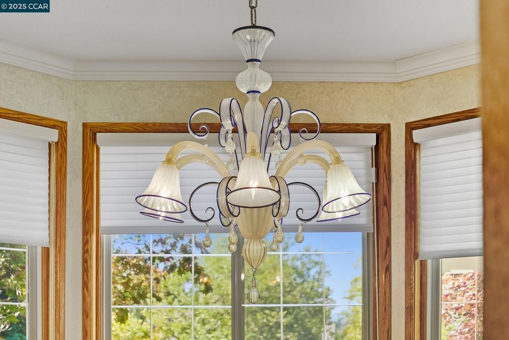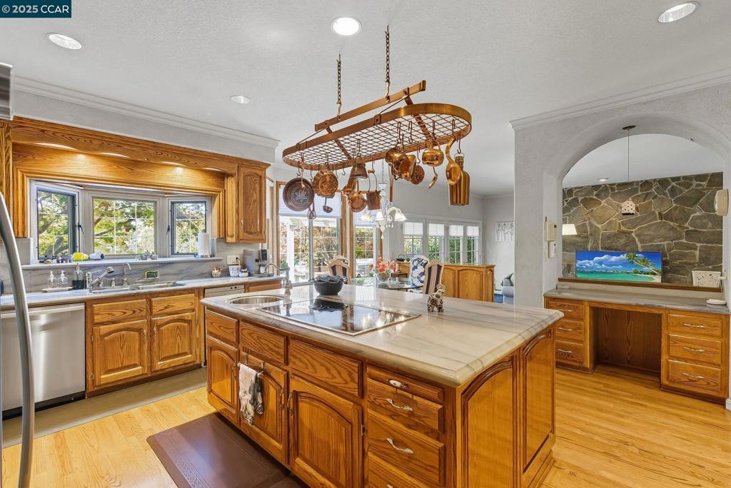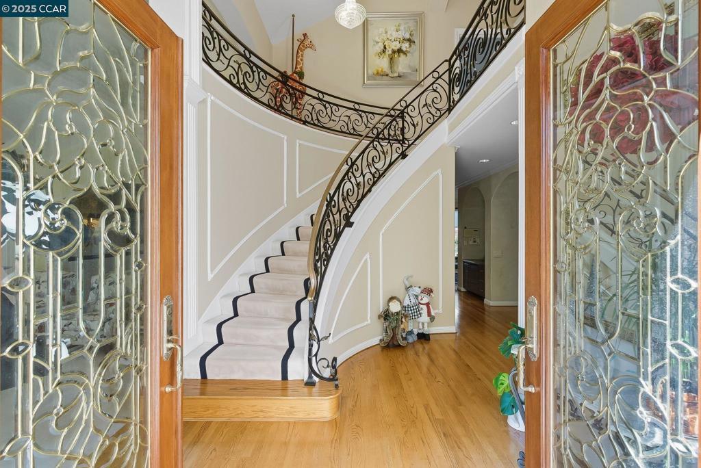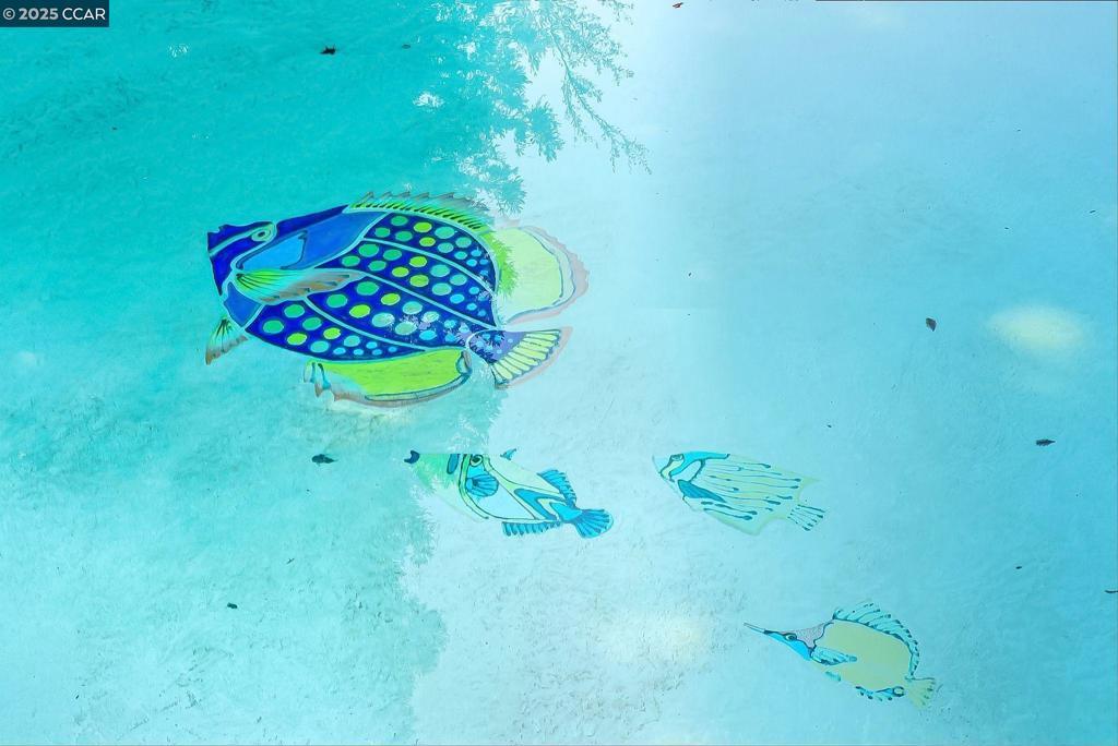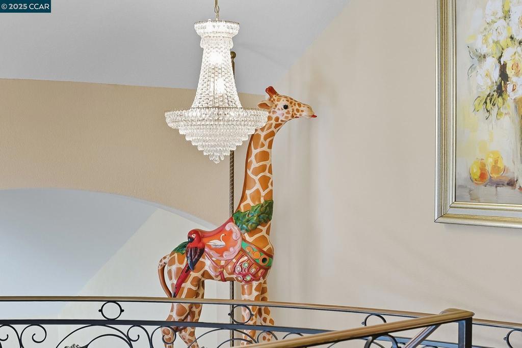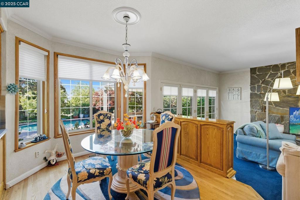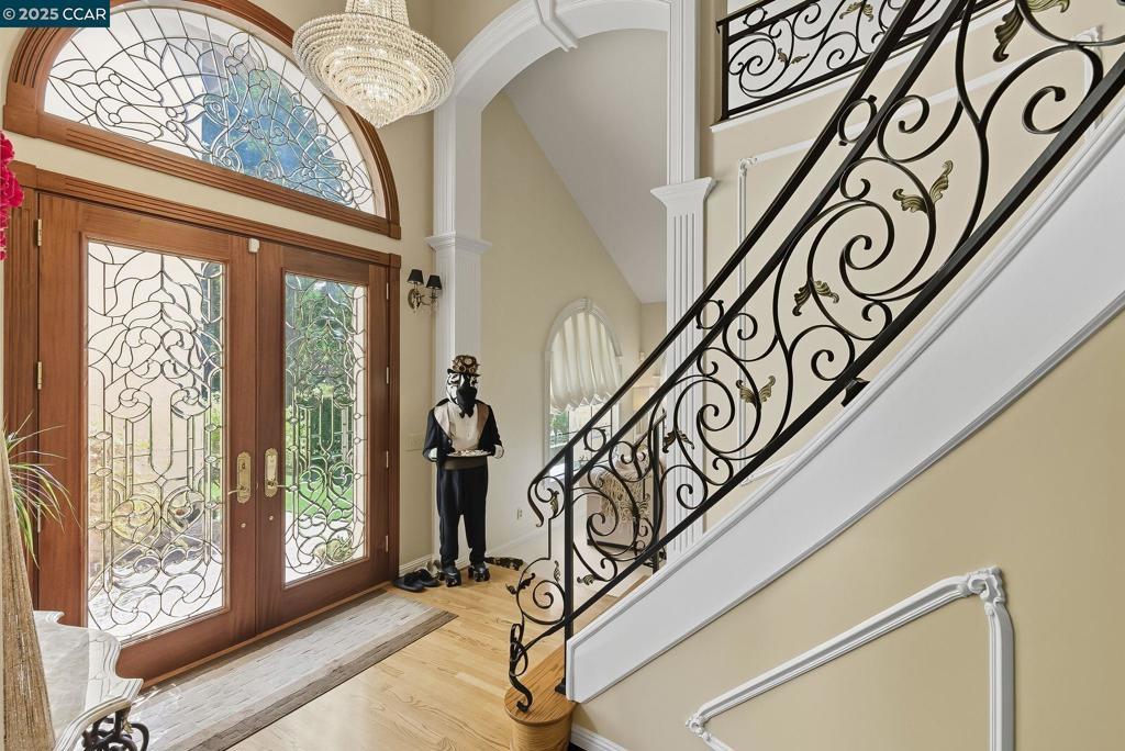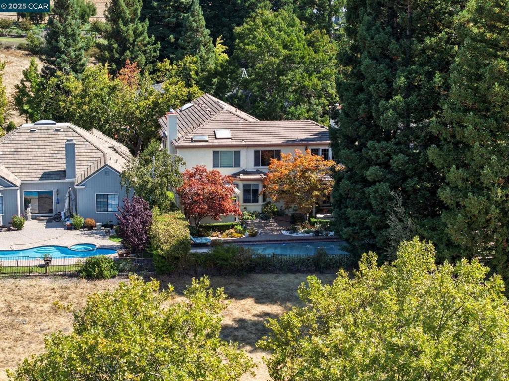 Welcome to this artistic, elegant, and sophisticated home! Enter through the hand-crafted leaded glass door into a warm, spacious interior. A sweeping staircase with custom wrought-iron railings leads to the second floor. The formal living room with plush carpeting flows into the dining room, highlighted by a sparkling crystal chandelier beneath a painted sky ceiling. The gourmet kitchen features rare blue-gray granite counters, custom cabinetry, and a striking copper centerpiece, opening to a bright informal dining area. The step-down family room includes a wet bar and hand-painted vines for added charm. Outside, a private backyard oasis awaits with a mosaic-tiled pool, hot tub, built-in grill with beer tap, and outdoor fireplace—perfect for both entertaining and relaxation. Located near the top of Blackhawk, this home offers access to top-rated schools, parks, golf, shopping, and more. The seller is also willing to leave the luxury designer furniture and décor, with only a few exceptions, making this home move-in ready and effortlessly glamorous. Heating/Cooling replaced in 2023.