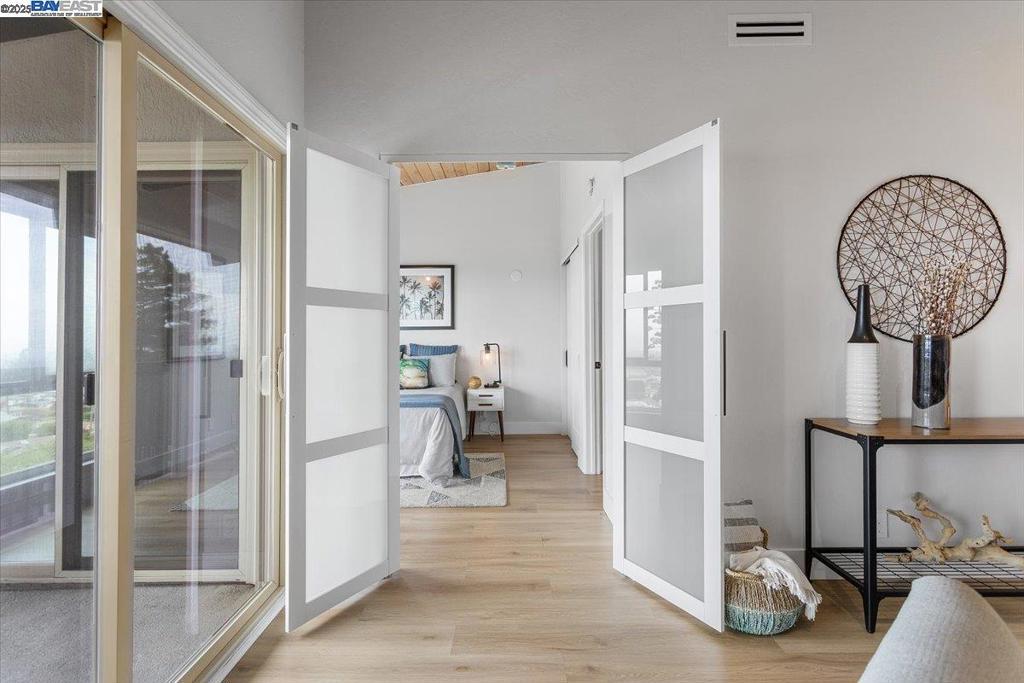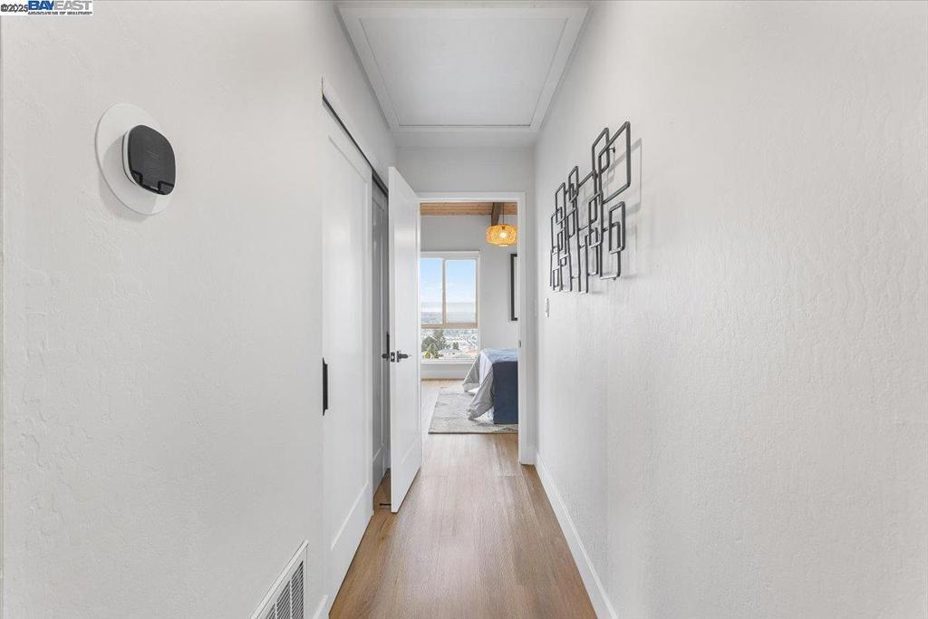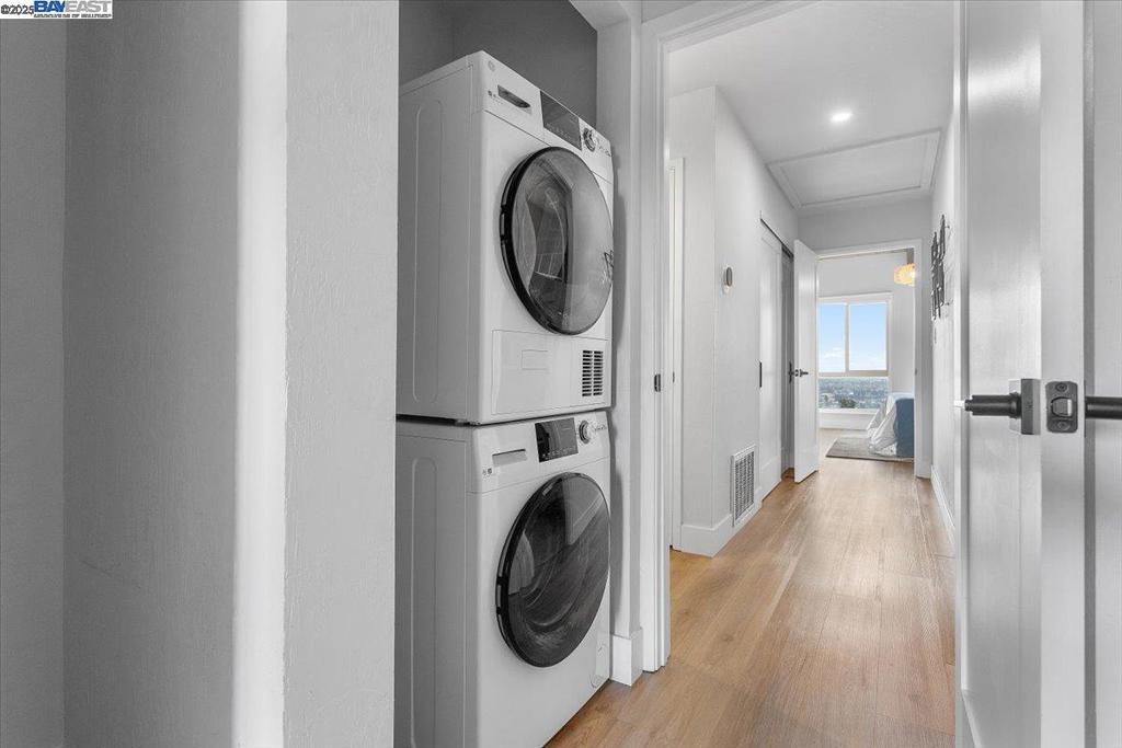 Welcome to Highland Place Co-op, a true hidden gem surrounded by nature in the scenic Castro Valley hills! This beautifully upgraded upstairs unit offers 2 bedrooms, 1 bathroom, and 1,190 sq ft of stylish living space. Inside, you’ll find vaulted wood beam ceilings, luxury vinyl plank flooring, dual pane windows, central heat and AC, and an in-unit washer and dryer. The kitchen has been tastefully updated with quartz countertops, stainless steel appliances, and new cabinets. The bathroom has also been completely upgraded for a modern, fresh feel. Step outside to a newly redone balcony with panoramic bay views, plus extra storage on the balcony and a private storage unit downstairs. As a co-op, Highland Place offers a uniquely stable and community-focused living experience, with well-maintained grounds and shared amenities supported by engaged resident-owners. The community features a clubhouse, swimming pool, hot tub, and tennis court. Located in the award-winning Castro Valley School District, with close proximity to Lake Chabot, freeway access, and public transportation—this is East Bay living at its best!
