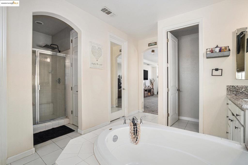 Located on a desirable corner lot in the gated Lakes community, this spacious home offers a versatile layout & sought after upgrades. A detached Casita w/double door entry, LVP flooring & it's own HVAC system provides the perfect space for a home office, studio, gym or guest quarters & is connected to the main home by a private courtyard. The main home opens w/double doors into a large formal living & dining area. Toward the back, you'll find an open-concept family room w/fireplace, eat-in kitchen featuring a center island, granite counters, white cabinets & a walk-in pantry. A sliding door leads to the covered patio, landscaped backyard w/turf & a hot tub. The gated side yard can accommodate a standard boat trailer. The 1st floor includes 2 bedrooms, a full bath plus a powder room for guests. Upstairs offers 3 additional bedrooms, a full bath, laundry room & built-ins along the hallway for an ideal office nook. The expansive primary suite features a Juliet balcony, dual walk-in closets, & a bath w/soaking tub, stall shower & dual vanities. Community amenities include lakes, parks, trails & private security.