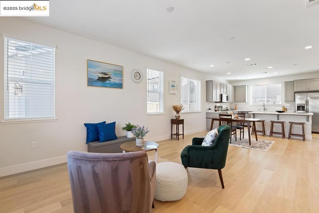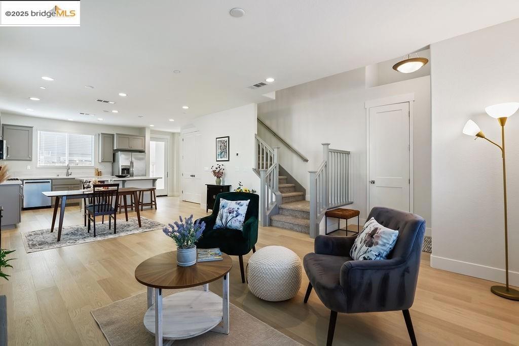 This is an absolute stunning new home in the Villages of Fairfield community, year built 2024 ! Too many upgrades to list & seller spent close to 50k in upgrading home from builder, including solar owned & garage is set up for electric vehicles. This outstanding floor plan offers a nice living room & formal dinning combination. A very large kitchen with updated premium appliances, fridge included & qaurtz counter tops. A vast family room with plenty of room to entertain many guests. The home also has a bedroom and full bathroom on the main level. Upstairs you have a nicely sized loft plus the 2 other additional bedrooms & a double sink vanity full bathroom. The primary bedroom has a huge walk in closet, a tub & shower. Gorgeous luxury vinyl flooring throughout the home and even the carpets in the bedroom were replacement with a higher quality then the builders. This house is light and bright with windows in every corner and also brand new window coverings in all bedrooms, all the bedrooms have recessed lighting as well. The laundry room is upstairs, washer & dryer included. This is also a premium lot, its on a massive court with plenty of parking & very quite area. The pie shape yard has been already fully hardscape & landscaped so no need to spend additional money on the yard.