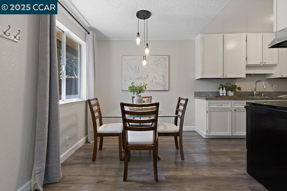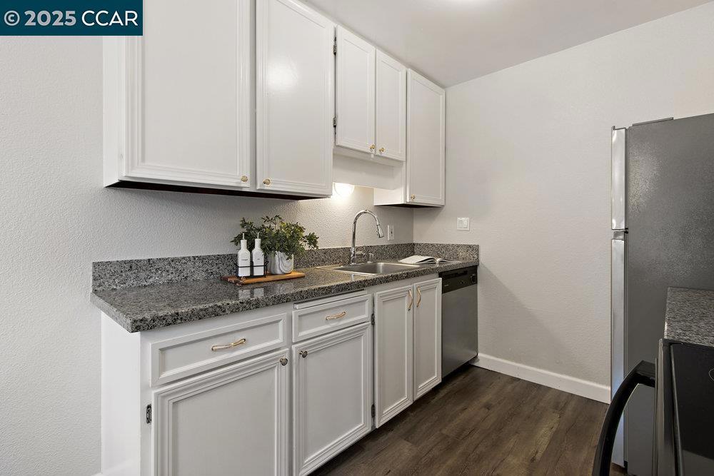 Welcome to this beautiful 2-bedroom, 1-bath ground floor unit featuring an open-concept layout designed for comfortable living and effortless entertaining. The dining area is perfectly situated under a centered chandelier, creating an inviting atmosphere for meals and gatherings. The kitchen boasts new appliances, ample counter space and crisp white cabinets, offering both style and functionality. 2 large bedrooms with large closets for all your storage needs. Located close to shopping centers, great restaurants and a large community park. This home offers both tranquility and accessibility. The community amenities include a pool, courts and outdoor sitting areas. Don't miss the opportunity to live in this desirable Concord location!