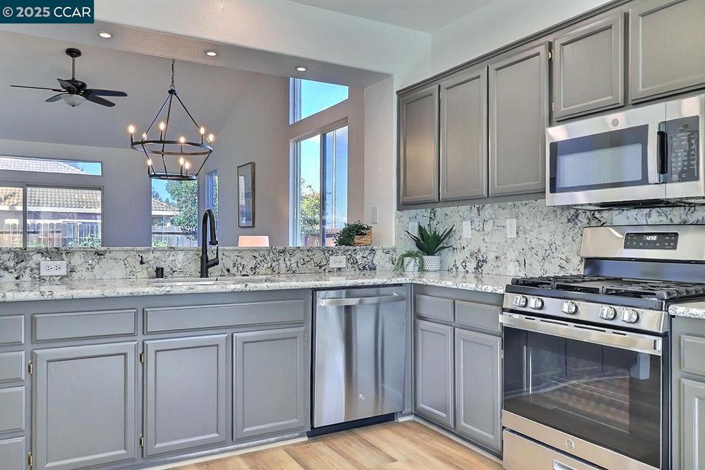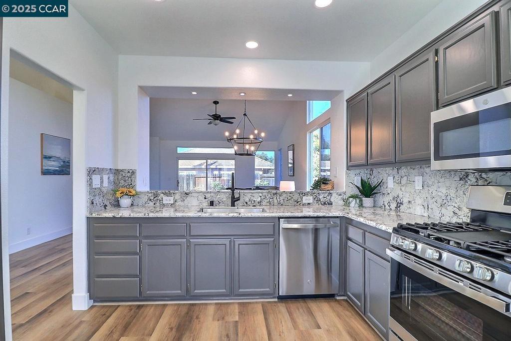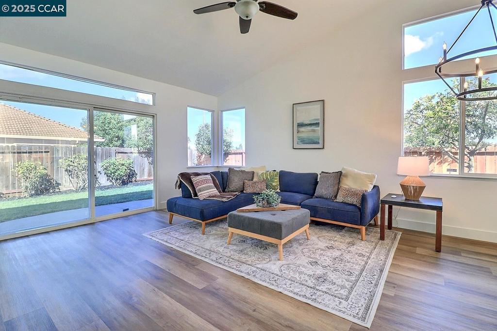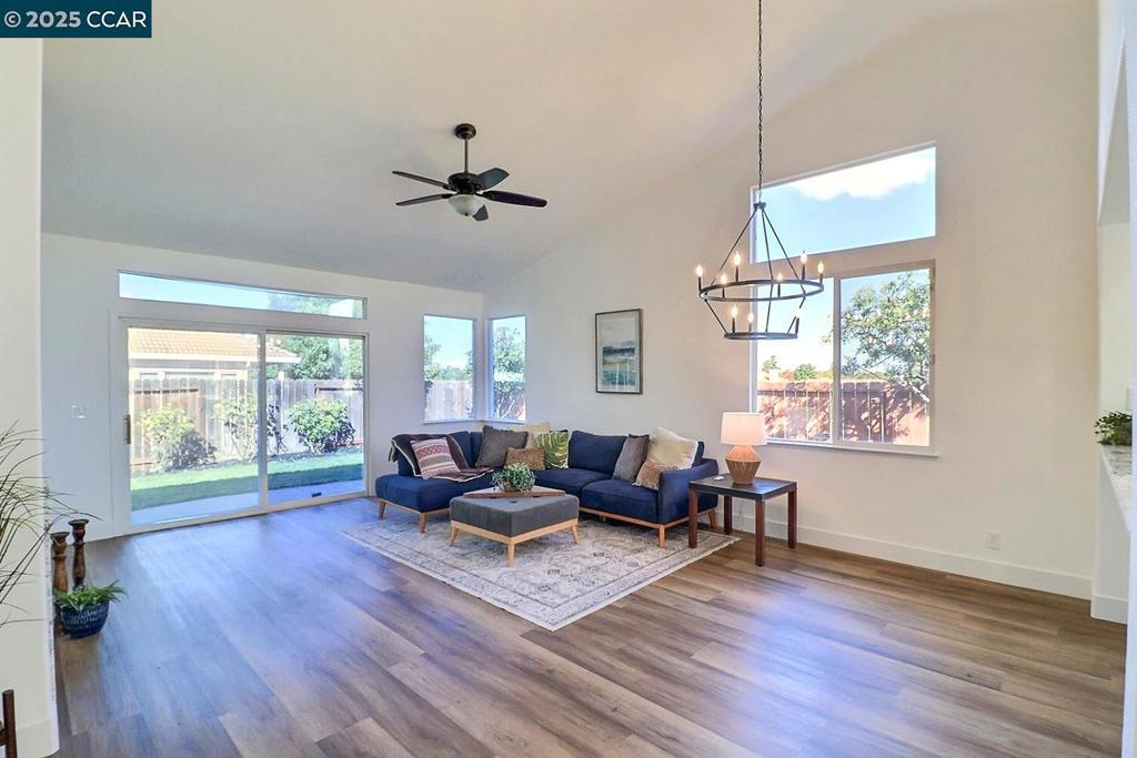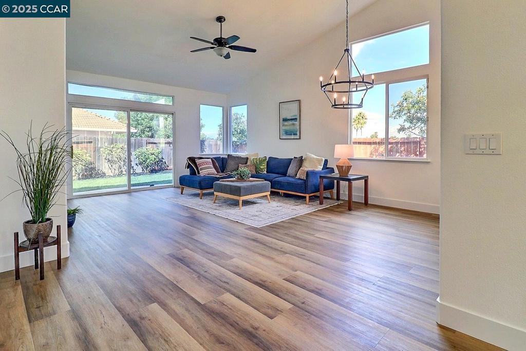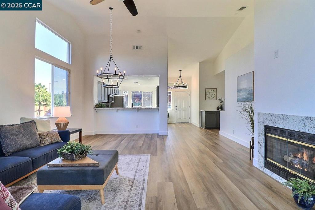 ||OPEN HOUSE 10/18 1-3pm||Gracefully set behind a sweeping front lawn, this exquisitely reimagined residence blends modern elegance with timeless comfort. Inside, neutral luxury vinyl plank flooring flows throughout a light-filled layout enhanced by fresh designer paint, recessed lighting, and meticulous attention to detail. The gourmet kitchen impresses with sleek contemporary cabinetry, granite countertops, a deep stainless-steel tub sink, gas range, and elevated microwave that maximizes workspace. A spacious pantry, sun-drenched breakfast nook, and stylish bar counter open seamlessly to the dining area and grand family room, crowned by vaulted ceilings, clerestory windows, and a sophisticated gas fireplace. The primary suite is a serene retreat featuring a spa-inspired bath with dual vanity, rainfall shower, and private water closet—refined finishes are mirrored in the hall bath. A dedicated laundry room with custom cabinetry leads to the finished garage. Expansive sliding doors reveal a tranquil patio overlooking the effervescent wrap-around grounds, ideal for entertaining, gardening, or play. A rare opportunity to experience this exceptional residence, perfectly positioned near scenic trails, parks, schools, shopping, dining, freeway access, and BART.