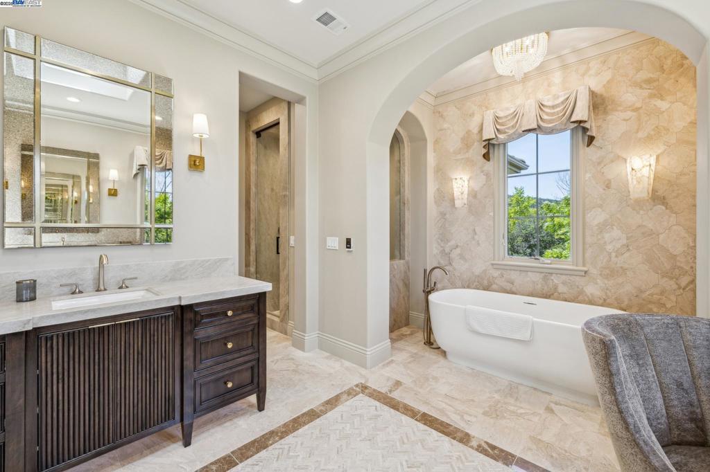 THIS IS IT! Stunning Modern Mediterranean estate with 5 bedrooms, 6.5 baths, and almost 8000 sq. ft. on a private cul-de-sac lot. Dramatic two-story foyer with curved wrought-iron staircase and crystal chandelier. Elegant living and dining rooms with arched windows, gas fireplaces, and silk drapes for formal entertaining. Expansive remodeled modern kitchen with granite counters, walk-in pantry, and breakfast nook. Family room with stone mosaic fireplace and built-ins. Serene primary suite with dual walk-in closets, spa-inspired bath, oversized soaking tub, steam shower, wet bar, skylight, and balcony with valley views. Other rooms include bonus/game room, media room, 2 offices, and separate au pair/guest suite with kitchen. Outdoor oasis with sparkling pool, spa, built-in BBQ, and covered porch. Top of the line designer finishes throughout include hardwood floors, travertine inlays, coffered ceilings, custom crown molding, and a security system. Minutes from shopping, top schools, and major commute routes. Welcome home!